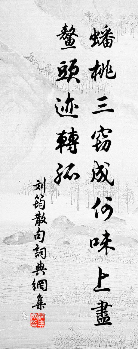 詩詞名句歷史字典書法欣賞書法字典國語詞典說文解字康熙字典古漢語字典標 題 作 者 詩 句 句作者:劉筠 朝代:宋代句原文蟠桃三竊成何味,上盡鰲頭跡轉孤。詩詞問答問:句的作者是誰?答:劉筠問:句寫於哪個朝代?答:宋代劉筠句書法欣賞句書法作品詩詞推薦四字書窗以印實相釋印肅〔宋代〕實離貫穿理不俱,一人直 * 同渠。久停頑坐邪思起,返謗如來正覺虛。賦石昌言家五題其三白鶻屏梅堯臣〔宋代〕雙睛射空眼角聳,筋爪入節韝絛垂。翅排霜刀毛綴甲,雪色愁突秋雲披。當時始得不知價,朝發海東夕九嶷。世為賡庚使和毛君玉送墨梅韻施樞〔宋代〕東風吹上歲寒枝,筆下工夫頗涉奇。此操直應同晚節,有香亦合伴冰姿。淡於淺水籠蟾夜,清似疏籬壓雪時。春在送韓玉汝使兩浙曾鞏〔宋代〕使傳東馳下九天,此邦曾屈試鳴弦。仁聲又向新年入,惠澤猶為故老傳。翠巘煙雲生席上,滄溟風雨到樽前。經營異俗二首(時從事嶺南)李商隱〔唐代〕鬼瘧朝朝避,春寒夜夜添。未驚雷破柱,不報水齊檐。虎箭侵膚毒,魚鉤刺骨銛。鳥言成諜訴,多是恨彤幨。戶盡東谷獨往文同〔宋代〕久不到東谷,晚晴欣細履。陰陰夾路木,濺濺落溪水。幽涎界屏粉,亂喙刻窗紙。兀坐忘所歸,煙雲逼人起。頌十玄談心印釋印肅〔宋代〕雖知體自虛空性,如理深淵融一鏡。萬象森羅沒處藏,摩尼離垢當清淨。思竹窗白居易〔唐代〕不憶西省松,不憶南宮菊。唯憶新昌堂,蕭蕭北窗竹。窗間枕簟在,來後何人宿?水調歌頭(即席和金華杜仲高韻,並壽諸友,惟酹乃佳耳)辛棄疾〔宋代〕萬事一杯酒,長嘆復長歌。杜陵有客,剛賦雲外築婆娑。須信功名兒輩,誰識年來心事,古井不生波。種種看余發偈頌二百零五首釋正覺〔宋代〕無人接得渠,貴逼馬相如。果來橋上也,記得柱頭書。無人識得渠,棋局醉樵夫。回頭斧柯爛,大海一成枯。田家謠宋自遜〔宋代〕清溪繞山流,茅屋瞰溪住。山田雖不多,荒年亦禾黍。有園不栽花,但種桑與苧。有兒只為農,不士不商旅。老翁歸舟大雪中入運河,過萬家湖楊萬里〔宋代〕雪漫水面淡模糊,釀出羔兒酒一壺。已被膻腴翳醽醁,更添牛乳點春酥。銷金帳下有此否,藥玉船中不用酤。忽見西岩寺於石〔宋代〕丹崖翠壁數千尺,絕頂僧房三四間。老樹倚岩岩倚屋,白雲飛去又飛還。永慶寺松風亭董天吉〔宋代〕長松蔭禪宇,柯葉何橚槮。清風一披拂,奏作綠綺琴。虬龍舞空祠,鸞鳳相與吟。眾籟起幽聽,太虛本沉沉。悠然望石湖錢載〔清代〕治平寺南湖翠昏,柳枝茭葉見灘痕。楞伽不管無情雨,一夜吹花落范村。感事陸游〔宋代〕陋巷何須嘆一瓢,朱門能守亦寥寥。衲衣先世曾調鼎,野褐家聲本珥貂。若悟死生均露電,未應富貴勝漁樵。千年和邢惇夫秋懷十首黃庭堅〔宋代〕邢子臥北窗,吟秋意少悰。讀書用意苦,嘔血驚乃翁。安得和扁輩,為浣學古胸。肺熱今好否,微涼生井桐。賈員外處見中書賈舍人巴陵詩集覽之懷舊代書寄贈獨孤及〔唐代〕海岸望青瑣,雲長天漫漫。十年不一展,知有關山難。適逢阮始平,立馬問長安。取公詠懷詩,示我江海瀾。暫若同張德和游沈道士庵王洋〔宋代〕上春甲子送窮日,早破煙扉令節求。指點荷光仟侶洞,招期南極老人游。龜前香火木稱士,堂後交蟋石作牛。我恐已亥雜詩 300龔自珍〔清代〕房山一角露崚,十二連橋夜有冰。漸進城南天五尺,回燈不敢夢觚稜。名句推薦群燕辭歸鵠南翔,念君客游多斷腸。曹丕《燕歌行》 言吾善者,不足為喜;道吾惡者,不足為怒。馮夢龍《警世通言·卷四》 欲黃昏。雨打梨花深閉門。李重元《憶王孫·春詞》 舞殿冷袖,風雨淒淒。杜牧《阿房宮賦》 來歲花前。又是今年憶去年。呂本中《減字木蘭花·去年今夜》 明者防於無形,治者制其未亂魏徵《隋書·列傳·卷四》 我也不登天子船,我也不上長安眠。唐寅《把酒對月歌》 清夜何湛湛,孤燭映蘭幕。江淹《銅爵妓》 半盞屠蘇猶未舉,燈前小草寫桃符。陸游《除夜雪》 關山別盪子,風月守空閨。薛道衡《昔昔鹽》