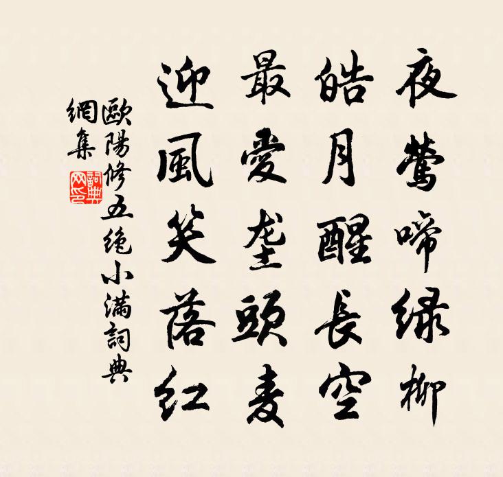 詩詞名句歷史字典書法欣賞書法字典國語詞典說文解字康熙字典古漢語字典標 題 作 者 詩 句 五絕·小滿作者:歐陽修 朝代:宋代五絕·小滿原文夜鶯啼綠柳,皓月醒長空。最愛壟頭麥,迎風笑落紅。詩詞問答問:五絕·小滿的作者是誰?答:歐陽修問:五絕·小滿寫於哪個朝代?答:宋代問:歐陽修的名句有哪些?答:歐陽修名句大全歐陽修五絕·小滿書法欣賞五絕·小滿書法作品譯文和注釋譯文小滿時節,夜鶯在茂盛的綠柳枝頭自由自在地啼鳴,明月照亮了萬里長空。我最喜歡觀看這個時節田壟前的麥子了,在初夏的風中輕輕搖曳笑看那滿地落紅。注釋醒:明顯、清楚,小滿時節,天空澄澈,彎月掛空,也顯得耀眼明朗。皓:潔白、明亮。壟頭麥:田壟前面的麥子。落紅:指落花。標籤:夏天詩詞推薦子夜四時歌:夏歌李白〔唐代〕鏡湖三百里,菡萏發荷花。五月西施采,人看隘若耶。回舟不待月,歸去越王家。念奴嬌·西湖和人韻辛棄疾〔宋代〕晚風吹雨,戰新荷、聲亂明珠蒼璧。誰把香奩收寶鏡,雲錦紅涵湖碧。飛鳥翻空,游魚吹浪,慣趁笙歌席。坐中豪初夏遊張園戴復古〔宋代〕乳鴨池塘水淺深,熟梅天氣半陰晴。東園載酒西園醉,摘盡枇杷一樹金。喜晴范成大〔宋代〕窗間梅熟落蒂,牆下筍成出林。連雨不知春去,一晴方覺夏深。夏日浮舟過陳大水亭 / 浮舟過滕逸人別業孟浩然〔唐代〕水亭涼氣多,閒棹晚來過。澗影見松竹,潭香聞芰荷。野童扶醉舞,山鳥助酣歌。幽賞未雲遍,煙光奈夕何。夏夜嘆杜甫〔唐代〕永日不可暮,炎蒸毒我腸。安得萬里風,飄颻吹我裳。昊天出華月,茂林延疏光。仲夏苦夜短,開軒納微涼。虛明燭影搖紅 松窗午夢初覺毛滂〔宋代〕一畝清陰,半天瀟灑松窗午。床頭秋色小屏山,碧帳垂煙縷。枕畔風搖綠戶。喚人醒、不教夢去。可憐恰到,瘦石齊安郡後池絕句杜牧〔唐代〕菱透浮萍綠錦池,夏鶯千囀弄薔薇。盡日無人看微雨,鴛鴦相對浴紅衣。閒居初夏午睡起·其二楊萬里〔宋代〕松陰一架半弓苔,偶欲看書又懶開。戲掬清泉灑蕉葉,兒童誤認雨聲來。構法華寺西亭柳宗元〔唐代〕竄身楚南極,山水窮險艱。步登最高寺,蕭散任疏頑。西垂下斗絕,欲似窺人寰。反如在幽谷,榛翳不可攀。命童曉出淨慈寺送林子方楊萬里〔宋代〕畢竟西湖六月中,風光不與四時同。接天蓮葉無窮碧,映日荷花別樣紅。夏日三首張耒〔宋代〕長夏江村風日清,檐牙燕雀已生成。蝶衣曬粉花枝午,蛛網添絲屋角晴。落落疏簾邀月影,嘈嘈虛枕納溪聲。久拚晚晴李商隱〔唐代〕深居俯夾城,春去夏猶清。天意憐幽草,人間重晚晴。並添高閣迥,微注小窗明。越鳥巢乾後,歸飛體更輕。醉花間·晴雪小園春未到馮延巳〔唐代〕晴雪小園春未到,池邊梅自早。高樹鵲銜巢,斜月明寒草。山川風景好,自古金陵道,少年看卻老。相逢莫厭醉金夏日游南湖謝薖〔宋代〕麴塵裙與草爭綠,象鼻筩勝瓊作杯。可惜小舟橫兩槳,無人催送莫愁來。池上早夏白居易〔唐代〕水積春塘晚,陰交夏木繁。舟船如野渡,籬落似江村。靜拂琴床蓆,香開酒庫門。慵閒無一事,時弄小嬌孫。夏夜韓偓〔唐代〕猛風飄電黑雲生,霎霎高林簇雨聲。夜久雨休風又定,斷雲流月卻斜明。夏日田園雜興·其七范成大〔宋代〕晝出耘田夜績麻,村莊兒女各當家。童孫未解供耕織,也傍桑陰學種瓜。納涼秦觀〔宋代〕攜扙來追柳外涼,畫橋南畔倚胡床。月明船笛參差起,風定池蓮自在香。初夏絕句陸游〔宋代〕紛紛紅紫已成塵,布穀聲中夏令新。夾路桑麻行不盡,始知身是太平人。名句推薦驚風飄白日,忽然歸西山曹植《贈徐幹詩》 松間沙路淨無泥,瀟瀟暮雨子規啼。蘇軾《浣溪沙·游蘄水清泉寺》 丞相祠堂何處尋,錦官城外柏森森。杜甫《蜀相》 別來不寄一行書。尋常相見了,猶道不如初。晁沖之《臨江仙·憶昔西池池上飲》 紗廚藤簟,玉人羅扇輕縑。白樸《天淨沙·夏》 白鳥朱荷引畫橈,垂楊影里見紅橋,欲尋往事已魂消。王士禎《浣溪沙·紅橋》 秋靜見旄頭,沙遠席羈愁李賀《塞下曲》 古之史也辯道,今之史也耀文。王通《中說·卷三·事君篇》 無為在歧路,兒女共沾巾。王勃《送杜少府之任蜀州 / 送杜少府之任蜀川》 江山代有才人出,各領風騷數百年。趙翼《論詩五首·其二》