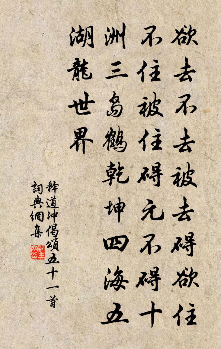 詩詞名句歷史字典書法欣賞書法字典國語詞典說文解字康熙字典古漢語字典標 題 作 者 詩 句 偈頌五十一首作者:釋道沖 朝代:宋代偈頌五十一首原文欲去不去被去礙,欲住不住被住礙。元不礙,十洲三島鶴乾坤,四海五湖龍世界。詩詞問答問:偈頌五十一首的作者是誰?答:釋道沖問:偈頌五十一首寫於哪個朝代?答:宋代釋道沖偈頌五十一首書法欣賞偈頌五十一首書法作品詩詞推薦偈頌四十一首釋慧暉〔宋代〕殺氣到來黃葉秋,梧桐老冷隨河流。人間天上無分曉,從古至今誰得酬。恁么辯得,尚帶滯留。別得一路,正絕蹤僧德殊家水簾求予詠王安石〔宋代〕淙淙萬音落石顛,皎皎一派當檐前。清風高吹鸞鶴唳,白日下照蛟龍涎。浮雲妝額自能卷,缺月琢鉤相與縣。朱門十一日詠梅張九成〔宋代〕一年勝事又相親,數樹寒香巧斗新。擁鼻獨來江上晚,行吟忽見渡頭春。孤標不入千花伴,冷艷初無一點塵。翻笑玄蝶項安世〔宋代〕腰肢可愛紅娘子,面目無情黑老婆。世上但知憐少艾,雙雙飛舞奈渠何。頌古四十五首釋慧遠〔宋代〕尊位如何,澄潭影裹探秋波。日面月面,鐵眼銅晴安可辨。君不見一聲霹靂兮霧罩長空,千眼頓開兮雲收岳面。還送張太傅還鄉蔡襄〔宋代〕置器功成佚退身,故園南望整車茵。青冥直上無餘事,白首歸來有幾人。門外離筵晴日曉,江邊行路雜花春。橐金次琬妹月夕思親之什追錄利登〔宋代〕緩作行程早作歸,倚門親語苦相思。白頭親老今多病,不似當初別汝時。清明日自西午橋至瓜岩村有懷張繼〔唐代〕晚霽龍門雨,春生汝穴風。鳥啼官路靜,花發毀垣空。鳴玉慚時輩,垂絲學老翁。舊遊人不見,惆悵洛城東。題詩卷程公許〔宋代〕嚼雪喔詩格外清,誰令失腳入紅塵。錦囊二十篇中景,長與西山面目親。十一月十二日寒昭亭神梅堯臣〔宋代〕冷雨凝雪未成雪,潭空魚寒歸石穴。長篙扣穴倩鯉魚,寄信山頭來奠設。魚傳水鳥飛上山,山木槎槎乾吹咽。旋灰休日出城西孔武仲〔宋代〕秋懷不可奈,驅馬漕河邊。川躍時聞鯉,林嘶已斷蟬。勞心逐外物,回首是殘年。強作邀游計,登臨卻黯然。送張仁甫見何少卿續郎中二首馮時行〔宋代〕水驛風煙暝,江郊茅葦秋。不頭窮易老,自是客多愁。自倚連城價,終艱一飽謀。向非天下士,強項敢輕投。崇讓宅東亭醉後沔然有作李商隱〔唐代〕曲岸風雷罷,東亭霽日涼。新秋仍酒困,幽興暫江鄉。搖落真何遽,交親或未忘。一帆彭蠡月,數雁塞門霜。俗態望江南張繼先〔宋代〕西源好,冬日雪中松。攜手石壇承愛景,靜觀天地入清宮。恰似大茅峰。襟袂冷,琴里意濃濃。吹月洞簫含碧玉,次韻時升春盡之作郭印〔宋代〕送春仍恨酒杯乾,今夕休眠到漏殘。歌舞縱無供笑語,賓朋猶有近門闌。傷心已訝千林綠,轉眼還看萬葉丹。節去中秋後一夕煙雨樓玩月吳芾〔宋代〕危樓百尺俯層城,煙斂雲收眼更明。四面月華千頃白,一天秋氣十分清。昨宵欲見渾無計,今夕相看似有情。又值踏莎行(中呂宮)張先〔宋代〕衾鳳猶溫,籠鸚尚睡。宿妝稀淡眉成字。映花避月上行廊,珠裙摺摺輕垂地。翠幕成波,新荷貼水。紛紛煙柳低還黃花王安石〔宋代〕四月揚州芍藥多,先時為別苦風波。還家忽忽驚秋色,獨見黃花出短莎。答謝中書書陶弘景〔南北朝〕山川之美,古來共談。高峰入雲,清流見底。兩岸石壁,五色交輝。青林翠竹,四時俱備。曉霧將歇,猿鳥亂鳴;曹承制知永康軍梅堯臣〔宋代〕鐵驄酒黃金羈,酒年少蜀城酒守。蜀城酒臨古江,正在離岸口。離岸李涼鑿,其利實不久。既避沫水害,又以溉田名句推薦問君何能爾?心遠地自偏。陶淵明《飲酒·其五》 謙似乎諂,然謙是虛心,諂是媚心;故處世貴謙,而不可諂。王永彬《圍爐夜話·第四三則》 龜言此地之寒,鶴訝今年之雪。庾信《小園賦》 驕奢淫逸,所自邪也。左丘明《左傳·隱公·隱公三年》 千門開鎖萬燈明,正月中旬動帝京。張祜《正月十五夜燈》 成大功者不小苛。劉向《說苑·政理》 卻下水晶簾,玲瓏望秋月。李白《玉階怨》 稻根科斗行如塊,田水今年一尺寬。范成大《夏日田園雜興》 春還草閣梅先動,月滿虛庭雪未消。王守仁《元夕二首》 塵中見月心亦閒,況是清秋仙府間。劉禹錫《八月十五夜桃源玩月》