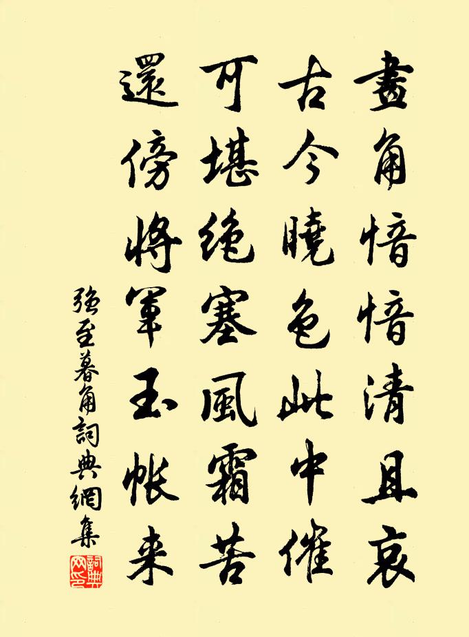 詩詞名句歷史字典書法欣賞書法字典國語詞典說文解字康熙字典古漢語字典標 題 作 者 詩 句 暮角作者:強至 朝代:宋代暮角原文畫角愔愔清且哀,古今曉色此中催。可堪絕塞風霜苦,還傍將軍玉帳來。詩詞問答問:暮角的作者是誰?答:強至問:暮角寫於哪個朝代?答:宋代強至暮角書法欣賞暮角書法作品詩詞推薦祖龍行常楚老〔唐代〕黑雲兵氣射天裂,壯士朝眠夢冤結。祖龍一夜死沙丘,胡亥空隨鮑魚轍。腐肉偷生三千里,偽書先賜扶蘇死。墓接別友人黃滔〔唐代〕莫恨東牆下,頻傷命不通。苦心如有感,他日自推公。雨夜扁舟發,花時別酒空。越山煙翠在,終愧臥雲翁。將見故人孟郊〔唐代〕故人季夏中,及此百餘日。無日不相思,明鏡改形色。寧知仲冬時,忽有相逢期。振衣起躑躅,赬鯉躍天池。再次士特韻李處權〔宋代〕愛君直似朱絲繩,遇物可折不可曲。三仕無喜已無慍,肯學時人走巫下。平生不作吠堯事,乘矢猶聞去其鏃。至今梅債趙時韶〔宋代〕擬把吟篇倚閣休,見梅時復上心頭。家貧寺免抨{朝月換攴}苦,詩債還添一段愁。偈頌六十首釋曇華〔宋代〕西天四七,唐土二三。盡向者裹釘椿搖櫓,新東林為你諸人解纜放船。未說超宗異目,若得齊眉共矚。亦可明窗下烏麻頭賈似道〔宋代〕烏麻頭路透銀絲,項闊毛臊肉帶梨。更若翅烏牙鉗赤,得遇此蟲真是奇。韓子華訪石昌言不遇石有詩韓邀和答梅堯臣〔宋代〕嘗聞載酒者,去訪子云居。乃值徒御出,遂令談笑虛。為黍寧乏具,題鳳豈有諸。一聽負荊語,還想藺相如。題南嶽招仙觀壁上(題此詩後數日上升)許碏〔唐代〕洪爐烹鍛人性命,器用不同分皆定。妖精鬼魅斗神通,只自乾邪不乾正。黃口小兒初學行,唯知日月東西生。還為西江月(茶)黃庭堅〔宋代〕龍焙頭綱春早,谷簾第一泉香。已醺浮蟻嫩鵝黃。想見翻成雪浪。兔褐金絲寶碗,松風蟹眼新湯。無因更發次公狂文宣王廟古松李胄〔唐代〕列植成均里,分行古廟前。陰森非一日,蒼翠自何年。寒影煙霜暗,晨光枝葉妍。近檐陰更靜,臨砌色相鮮。每愧夜坐陸游〔宋代〕老知世事謾紛紛,紙帳 * 自策勛。一夜北風吹裂屋,石樓無耳不曾聞。入道詩十九首王慶升〔宋代〕九轉金丹九月圓,木金胎旺好安禪。純坤月里純乾足,手把仙瓢酌醉仙。閒居殷堯藩〔唐代〕茂苑閒居木石同,旋開小徑翦蒿蓬。虛游心在鴻濛外,穴處身疑培塿中。花影一闌吟夜月,松聲半榻臥秋風。百年黃山雜詠蒼豹鄧宗度〔宋代〕卻隱他山霧,來眠此洞雲。區區麛鹿輩,戰慄敢子群。落梅風盧摯〔元代〕才歡悅,早間別,痛煞俺好難割捨。畫船兒載將春去也!空留下半江明月。廣州王園寺伏日即事寄北中親友劉言史〔唐代〕南越逢初伏,東林度一朝。曲池煎畏景,高閣絕微飆。竹簟移先灑,蒲葵破復搖。地偏毛瘴近,山毒火威饒。裛汗元符二年十一月十六日趙德麟檢校諸邑……寄晁說之〔宋代〕佳人諒誠素,鳴佩若可取。王孫忘情事,不學鄭交甫。麥苗已有生意掘烏禾稬者未止王炎〔宋代〕兒童飯犢女採桑,水滿東皋耕事忙。稻秧半綠麥半黃,天許食新饘粥香。田父咨嗟仍笑語,赤地一年今得雨。紫鱉崦里桃花顧況〔唐代〕崦里桃花逢女冠,林間杏葉落仙壇。老人方授上清籙,夜聽步虛山月寒。名句推薦燈火萬家城四畔,星河一道水中央。白居易《江樓夕望招客》 人棄我取,人取我與。司馬遷《史記·貨殖列傳》 可憐處處巢居室,何異飄飄托此身。杜甫《燕子來舟中作》 白日依山盡,黃河入海流。王之渙《登鸛雀樓》 果仁者,人多畏,言不諱,色不媚。李毓秀《弟子規·親仁》 荷絲傍繞腕,菱角遠牽衣蕭綱《採蓮曲》 不學問,無正義,以富利為隆,是俗人者也。荀子《荀子·儒效》 亭亭畫舸系春潭,直到行人酒半酣。鄭文寶《柳枝詞》 停車坐愛楓林晚,霜葉紅於二月花。杜牧《山行》 青山欲共高人語。聯翩萬馬來無數。辛棄疾《菩薩蠻·金陵賞心亭為葉丞相賦》