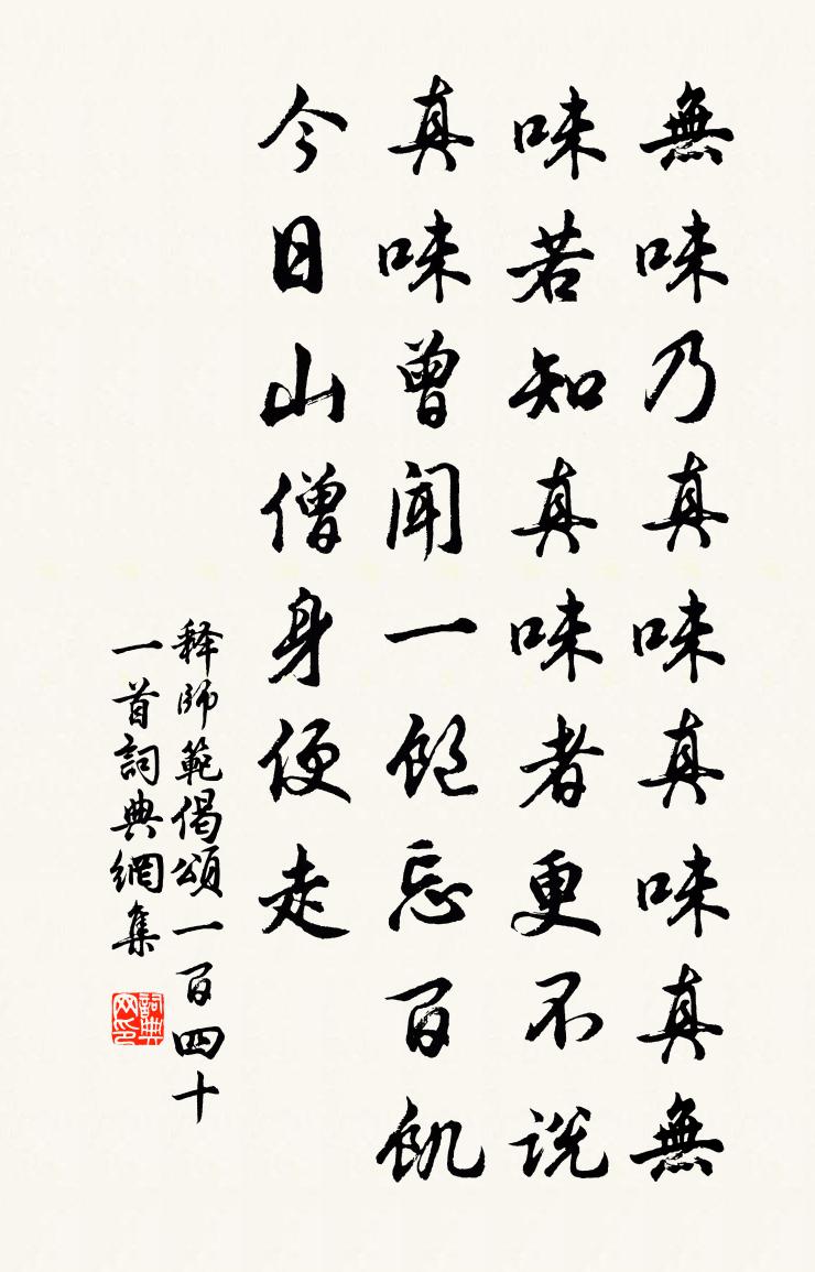 詩詞名句歷史字典書法欣賞書法字典國語詞典說文解字康熙字典古漢語字典標 題 作 者 詩 句 偈頌一百四十一首作者:釋師範 朝代:宋代偈頌一百四十一首原文無味乃真味,真味真無味。若知真味者,更不說真味。曾聞一飽忘百飢,今日山僧身便走。詩詞問答問:偈頌一百四十一首的作者是誰?答:釋師範問:偈頌一百四十一首寫於哪個朝代?答:宋代釋師範偈頌一百四十一首書法欣賞偈頌一百四十一首書法作品詩詞推薦陽春曲/陽春史達祖〔宋代〕杏花煙,梨花月,誰與暈開春色。坊巷曉愔愔,東風斷、舊火銷處近寒食。少年蹤跡。愁暗隔、水南山北。還是寶題花光梅十首懸崖放下王柏〔宋代〕著腳孤高太出奇,馮空斜陽兩三枝。大風動地吹崖裂,正是冰姿蘊藉時。洞房燕張祜〔唐代〕清曉洞房開,佳人喜燕來。乍疑釵上動,輕似掌中回。暗語臨窗戶,深窺傍鏡台。新妝正含思,莫拂畫梁埃。大孤山黃庶〔宋代〕彭蠡百里南國襟,萬頃蒼煙插孤岑。不知天星何時落,春秋不書不可尋。石怪木老鬼所附,茲乃與水同浮沉。鳴鴟江行雜書戴表元〔宋代〕荒城日暮秋江長,{禾罷}稏野熟秋風香。青天茫茫不知處,扁舟臥入菰蒲鄉。波深浪靜魚鴨樂,遙林墮景同飛揚李花二首董嗣杲〔宋代〕嘉李繁相倚,園林淡泊春。齊紈翦衣薄,吳佇下機新。色與晴光亂,香和露氣勻。望中皆玉樹,環堵不為貧。紀事二十四首梁啓超〔清代〕惺惺含意惜惺惺,豈必圓時始有情。最是多歡復多惱,初相見即話來生。臨江仙(賞花)趙長卿〔宋代〕憶昔去年花下飲,團欒爭看酴醿。酒濃花艷兩相宜。醉中嘗記得,裙帶寫新詩。還是春光驚已暮,此身猶在天涯。西江月(壽游侍郎)包榮父〔宋代〕某恭審某官瑞紀門弧,輝增從從。適逢八帙,共慶千秋。掛神虎之冠,未酬雅志;葉非熊之卜,會有好音。某受知辛巳大歉陳藻〔宋代〕村村無米歲何堪,我到家家有酒酣。自昔略經三兩度,似今未見大生慚。和彥猷在華亭賦十題依韻崑山韓維〔宋代〕晉衰士不競,識者逃其名。陸生起江湖,文藻振英聲。遂令昆丘號,長配山不傾。君看玉就毀,孰與樗全生。南唐郡圃陳宓〔宋代〕三沼流通作一家,清風偏趁夕陽斜。我來退食知懷愧,敢對波心蓮子花。述韋昭應畫犀牛儲光羲〔唐代〕遐方獻文犀,萬里隨南金。大邦柔遠人,以之居山林。食棘無秋冬,絕流無淺深。雙角前嶄嶄,三蹄下駸駸。朝賢寧考神御奉安原廟王遂〔宋代〕儉慈三十一年主,已不自知其至尊。時向道傍逢故老,但能垂淚不能言。感別元帥尚父(一作病中上錢尚父)羅隱〔唐代〕玉函瑤檢下台司,記得當時捧領時。半壁龍蛇蟠造化,滿筐山嶽動神祇。疲牛舐犢心猶切,陰鶴鳴雛力已衰。稚子題黃碧酒肆張沄〔宋代〕東風吹雨水平沙,下卻籃輿訪洒家。行役不知春早暮,牆頭紅杏欲飛花。春夢白玉蟾〔宋代〕我亦頻年飲大苛,吟髭撚盡為詩魔。夜來斗轉參橫後,夢在吳頭楚尾多。所喜江山無病痛,可憐故舊半消磨。水車再用前韻以謝諸公見答之什郭印〔宋代〕三賢富文詞,獻笑發其端。瓦礫換瓊瑤,光照窗幾寒。熒煌句中眼,真透祖師關。孺子或可教,傾倒無用慳。嗟余詠史黨奴張玉孃〔宋代〕江雪寒連酒思豪,歌傅錦帳醉烹羔。爭如取水陶承旨,茗碗清新與味高。西江月(六)張伯端〔宋代〕對鏡不須強滅,假名權立菩提。色空明暗本來齊。真妄體分兩種。悟則便名靜土,更無天竺曹溪。誰言極樂在天西名句推薦三年遇寒食,盡在洛陽城。白居易《洛橋寒食日作十韻》 垂下簾櫳。雙燕歸來細雨中。歐陽修《採桑子·群芳過後西湖好》 向河梁、回頭萬里,故人長絕。辛棄疾《賀新郎·別茂嘉十二弟》 滄浪之水清兮,可以濯我纓;佚名《滄浪歌》 喧鳥覆春洲,雜英滿芳甸。謝朓《晚登三山還望京邑》 秋侵人影瘦,霜染菊花肥。沈復《浮生六記·閨房記樂》 對酒捲簾邀明月,風露透窗紗。蘇軾《少年游·潤州作》 人有逆天之時,天無絕人之路。馮夢龍《醒世恆言·卷三十二》 綠竹半含籜,新梢才出牆。杜甫《嚴鄭公宅同詠竹》 啼時驚妾夢,不得到遼西。金昌緒《春怨 / 伊州歌》