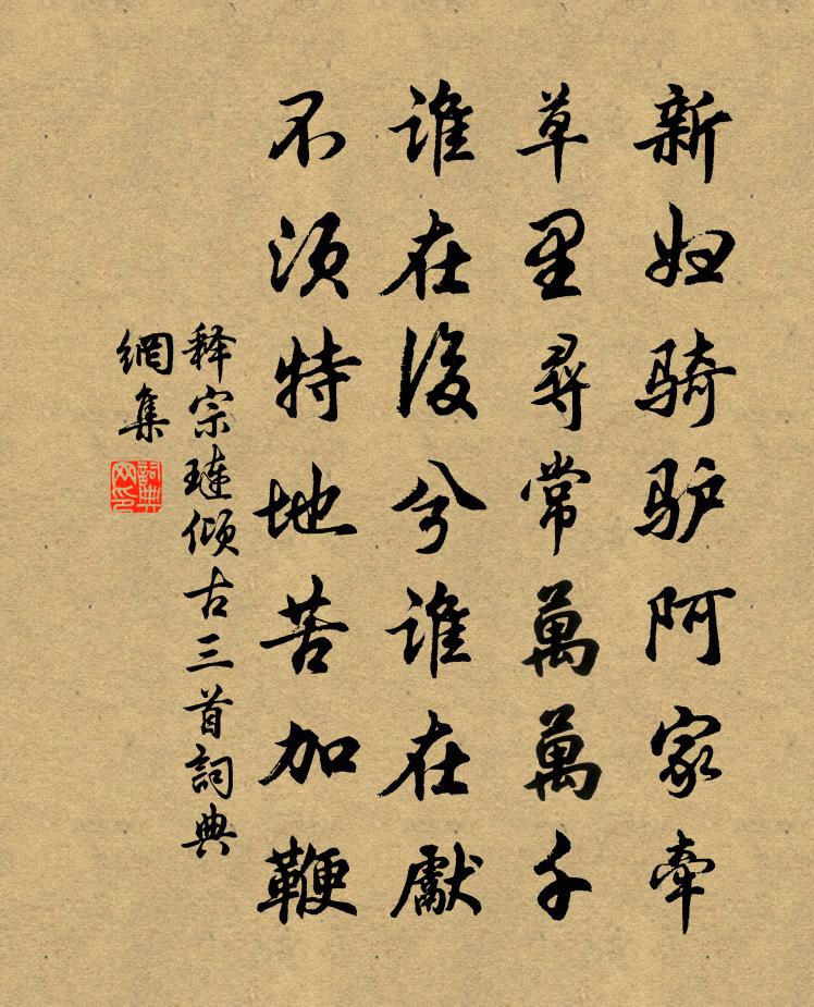 詩詞名句歷史字典書法欣賞書法字典國語詞典說文解字康熙字典古漢語字典標 題 作 者 詩 句 傾古三首作者:釋宗璉 朝代:宋代傾古三首原文新婦騎驢阿家牽,草里尋常萬萬千。誰在後兮誰在先,不須特地苦加鞭。詩詞問答問:傾古三首的作者是誰?答:釋宗璉問:傾古三首寫於哪個朝代?答:宋代釋宗璉傾古三首書法欣賞傾古三首書法作品詩詞推薦一片子佚名〔唐代〕柳色青山映,梨花雪鳥藏。綠窗桃李下,閒坐嘆春芳。朝中措元好問〔金代〕年年重五近佳辰。蒲艾一番新。滿酌九霞香醞,壽君兩鬢長春。閨中美秀如何,賦得林下精神。早辦□□布襖,共千秋歲(壽黃倅)牟巘〔宋代〕平分敏手。更覺山城小。聊岸幘,時舒嘯。當年湓浦月,偏照香山老。頭未白,而今半百才逾九。共說東園好。問朴上人訪筠翁於溪草堂袖詩贈雨中告別將有雁李彌遜〔宋代〕一壑悠然聽雨眠,君來著語破雲煙。肯隨鷗狎清江上,欲趁鴻飛白日邊。童子不應我一指,學人正自少三拳。急行十和賀太淵得雄二首劉克莊〔宋代〕鬱鬱蔥蔥初抱送,驚驚怕怕永銷除。子瞻要待啼時看,介甫曾夸畫不如。先敞高門容駟馬,旋聞別館戲羊車。中庸徐司徒池亭李中〔唐代〕亭榭跨池塘,泓澄入座涼。扶疏皆竹柏,冷淡似瀟湘。萍嫩鋪波面,苔深鎖岸傍。朝回遊不厭,僧到賞難忘。最稱浣溪沙(寄文叔生朝)韓淲〔宋代〕江上新涼入酒杯。瑞芝堂祝壽筵開。五樓百雉更崔嵬。勞來流離施菽麥,作成豐稔到田萊。便朝天去也徘徊。南劍州芋陽舖見臘月桃花蔡襄〔宋代〕可笑夭桃耐雪風,山家牆外見疏紅。為君持酒一相向,生意雖殊寂寞同。東坡竹石劉黻〔宋代〕坡翁北歸留戲筆,數竹離奇生磈石。世如有鳳必先知,碌碌凡禽誰得識。風不聲兮月不影,山僧笑我移枯瘠。嶺恥北山之高壽北山何先生金履祥〔宋代〕夫子曰辭,辭是好爵。玉幾導揚,燕翼是托。溪閣呈陸太初方回〔宋代〕臨水看山日百遍,等閒收拾有詩才。老松於我幾年長,啼鳥無名何處來。病發漸應雕翠葆,衰蹤那復夢金台。鷫鸘冬日作二首張耒〔宋代〕南雨不成雪,北風樓觀寒。眉顰魯酒薄,腸斷楚梅酸。雲夢寒全薄,湖湘春欲還。舉頭瞻去雁,羨爾有輕翰。仆性懶慢喜睡而吏事亦早休因得遂其欲琳老數毛滂〔宋代〕先生曉開城旦書,坐與老農相囁嚅。槐陰翠圓吏已散,歸來下簾手撚鬚,胸中百紙無處使,靜看窮達如呼慮。身閒六月雨十一首許月卿〔宋代〕五更殊覺洗空憂,一雨端能接引秋。陋室了知饒鶴料,高田無復拆龜疇。蒲葵扇老堪藏篋,楊柳梢存不見洲。混混登毗陵青山樓李中〔唐代〕高樓閒上對晴空,豁目開襟半日中。千里吳山清不斷,一邊遼海浸無窮。人生歌笑開花霧,世界興亡落葉風。吟罷偈頌一百二十三首釋普度〔宋代〕驕陽正酷火雲飛,一雨滂沱徹四維。{左禾右罷}稏吹香民已樂,山川草木亦光輝。官舍閒居黃公度〔宋代〕朝市競紛華,山林甘寂寞。要之其間各有趣,飛鳥沖天魚縱壑。我本麋鹿姿,誤被簪紳縛。男婚女嫁苦逼人,薄宦菊花吟金朋說〔宋代〕金葩玉蕊破寒霜,北徑東籬艷吐芳。自惜強腰翁去後,幾人能共對重陽。詠韓氏二子賈島〔唐代〕千岩一尺璧,八月十五夕。清露墮桂花,白鳥舞虛碧。身世陸游〔宋代〕身世浮沉等一漚,臥看校尉例封侯。青燈微火藥鐺夜,淡月淒風衣杵秋。醉里不辭嘲兀兀,吟邊時得寄悠悠。即今名句推薦春愁凝思結眉心,綠綺懶調紅錦薦。顧敻《玉樓春·拂水雙飛來去燕》 數萼初含雪,孤標畫本難。崔道融《梅花》 怒猊抉石,渴驥奔泉宋祁、歐陽修、范鎮、呂夏卿等《新唐書·列傳·卷八十五》 龍吟虎嘯一時發,萬籟百泉相與秋李頎《聽安萬善吹觱篥歌》 人之有能有為,使羞其行,而邦其昌。佚名《尚書·周書·洪範》 君子必在己者,不必在人者也。呂不韋《呂氏春秋·覽·孝行覽》 本是同根生,相煎何太急?曹植《七步詩》 愁絕行人天易暮,行向鷓鴣聲里住納蘭性德《菊花新·用韻送張見陽令江華》 明主之道,必明於公私之分韓非及後人《韓非子·飾邪》 天時不如地利,地利不如人和。孟子《孟子·公孫丑章句下·第一節》