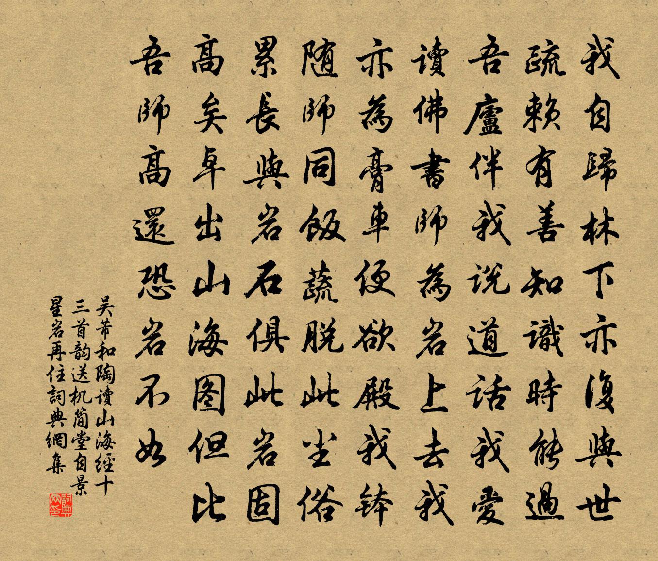 詩詞名句歷史字典書法欣賞書法字典國語詞典說文解字康熙字典古漢語字典標 題 作 者 詩 句 和陶讀山海經十三首韻送機簡堂自景星岩再住作者:吳芾 朝代:宋代原文我自歸林下,亦復與世疏。賴有善知識,時能過吾廬。伴我說道話,我愛讀佛書。師為岩上去,我亦為膏車。便欲殿我缽,隨師同飯蔬。脫此塵俗累,長與岩石俱。此岩固高矣,卓出山海圖。但比吾師高,還恐岩不如。詩詞問答問:《和陶讀山海經十三首韻送機簡堂自景星岩再住》的作者是誰?答:吳芾問:該詩寫於哪個朝代?答:宋代書法欣賞和陶讀山海經十三首韻送機簡堂自景星岩再住書法作品詩文賞析【原題】:和陶讀山海經十三首韻送機簡堂自景星岩再住隱靜詩詞推薦題戴雄飛腴軒詩吳芾〔宋代〕四壁蕭然萬卷憶,時人莫認作癯儒。他年得志英華發,始信胸中道味腴。宮詞王仲修〔宋代〕乘輿前殿退朝初,玉案焚香午漏余。三省奏來祥瑞事,編排付與內尚書。宿甄山南溪晝公院(一作宿杼山晝公禪堂)周賀〔唐代〕從作兩河客,別離經半年。卻來峰頂宿,知廢甄南禪。余霧沉斜月,孤燈照落泉。何當閒事盡,相伴老溪邊。送曾無瑕改常州彭龜年〔宋代〕夫君愛民如愛己,不愛公卿愛刺史。得州如斗喜不禁,拍手催兒治行李。朝家急賢不惜官,日日中書有除旨。周南和靜照詩韻釋妙弘〔宋代〕莫辭迢遞供杯茶,香噴雲腴映彩霞。兩兩夢中休說夢,覺來渾是夢中花。段太尉逸事狀柳宗元〔唐代〕太尉始為涇州刺史時,汾陽王以副元帥居蒲。王子晞為尚書,領行營節度使,寓軍邠州,縱士卒無賴。邠人偷嗜暴懷子西吳則禮〔宋代〕眼邊寒策良可親,吾曹齪齪詎笑人。青鞋布襪有能事,喚取子西來細論。老夫個裡得妙解,挈挈獨提彌勒袋。他日南坡口號十八首鄭清之〔宋代〕管弦不礙登山屐,梁肉何妨滿腹書。豈是清談愧夷甫,為無阿堵繞吾廬。上留田行陸機〔魏晉〕嗟行人之藹藹。駿馬陟原風馳。輕舟泛川雷邁。寒往暑來相尋。零雪霏霏集宇。悲風徘徊入襟。歲華冉冉方除。我臨江仙邢俊臣〔宋代〕巍峨萬丈與天高。物輕人意重,千里送鵝毛。用前韻贈高持一章甫〔宋代〕全身當作冥飛鴻,無心要似雲行空。逢人未用青白眼,與世不妨牛馬風。暇日出門聊散步,雪晴愛此山無數。骨寒宿不老山方岳〔宋代〕借得松風一覺眠,旋燒枯葉煮山泉。人間蟻蛭王侯夢,不到梅花紙帳邊。西江月 贈潘道人李道純〔元代〕真土真鉛真汞,元神元氣元清。三元合一藥方成。個是全真上品。動靜虛靈不昧,成全實相圓明。形神俱妙樂無生余襄公祠楊蟠〔宋代〕或業終令萬古傳,豈惟文采動當年。曲江相繼成雙廟,慶厲同稱有四賢。偈頌九十三首釋梵琮〔宋代〕孤迥迥一塵不立,清寥寥目斷千峰。白雲片片,流水重重。驀忽和盤掇轉,卻要喚西作東。生鐵團上,迸開罅縫。和尹少稷經乾王洋〔宋代〕昔年初見君,山頭日卓午。但言奉親歡,不道作計苦。稍稍窺藩籬,清風滌袢暑。論文及古人,一笑乃相許。早知示逸二首趙蕃〔宋代〕菊種初猶落,及今當梢滋。晴多須灌溉,草蔓合耘治。夏欲助茗椀,秋當浮酒卮。落英如可拾,更得慰長飢。掃花游(前題)王沂孫〔宋代〕滿庭嫩碧,漸密葉迷窗,亂枝交路。斷紅甚處。但匆匆換得,翠痕無數。暗影沈沈,靜鎖清和院宇。試凝佇。怕一池上釋智圓〔宋代〕漚生復漚滅,水濕元無異。盡日倚欄看,無人知此意。雜詠一百首李衛公劉克莊〔宋代〕肘後臣非靳,胸中彼未純。乃知兵妙處,不可妄傳人。名句推薦貨無大小,缺者便貴。馮夢龍《醒世恆言·卷三十五》 娶妻無媒毋須恨,書中自有顏如玉。趙恆《勸學詩》 慷慨惟平生,俯仰獨悲傷。陸機《門有車馬客行》 念天地之悠悠,獨愴然而涕下。陳子昂《登幽州台歌》 以五十步笑百步。孟子《孟子·梁惠王章句上·第三節》 白髮戴花君莫笑,六么催拍盞頻傳。歐陽修《浣溪沙·堤上遊人逐畫船》 空獨倚東風,芳思誰寄。周密《繡鸞鳳花犯·賦水仙》 美色不同面,皆佳於目;悲音不共聲,皆快於耳王充《論衡·卷三十·自紀篇》 龍噓氣成雲,雲固弗靈於龍也。韓愈《雜說一·龍說》 不聞不若聞之,聞之不若見之,見之不若知之,知之不若行之。荀子《荀子·儒效》