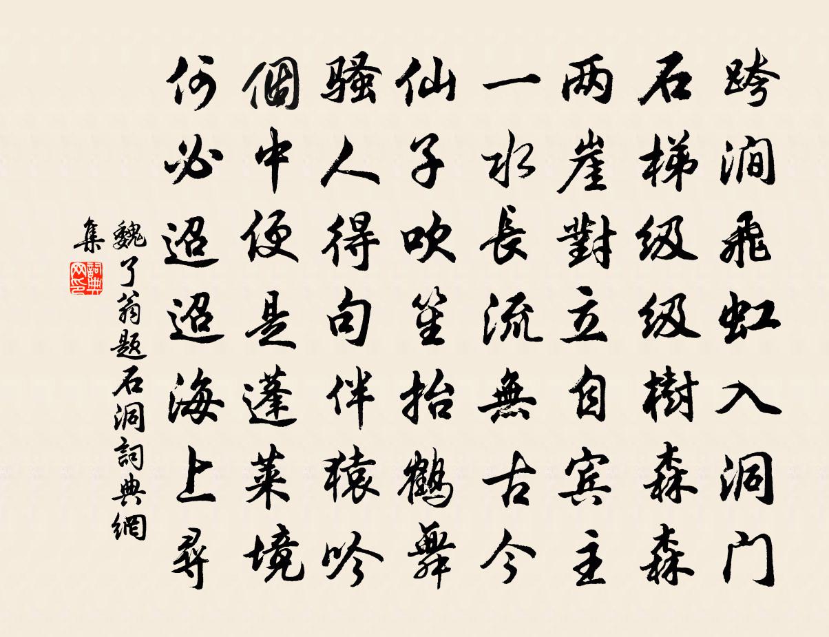 詩詞名句歷史字典書法欣賞書法字典國語詞典說文解字康熙字典古漢語字典標 題 作 者 詩 句 題石洞作者:魏了翁 朝代:宋代題石洞原文跨澗飛虹入洞門,石梯級級樹森森。兩崖對立自賓主,一水長流無古今。仙子吹笙抬鶴舞,騷人得句伴猿吟。箇中便是蓬萊境,何必迢迢海上尋。詩詞問答問:題石洞的作者是誰?答:魏了翁問:題石洞寫於哪個朝代?答:宋代魏了翁題石洞書法欣賞題石洞書法作品詩詞推薦覽古四十二首 其四十二楊維楨〔元代〕要離爇妻子,大盜空古名。峨峨南文山,光焰日月青。婦義總一醮,臣道無改更。寧戴一天死,不載二地生。尚憐鵲橋仙·一竿風月陸游〔宋代〕一竿風月,一蓑煙雨,家在釣台西住。賣魚生怕近城門,況肯到紅塵深處?潮生理棹,潮平系纜,潮落浩歌歸去。無題陸游〔宋代〕碧玉當年未破瓜,學成歌舞入侯家。如今憔倅蓬窗里,飛上青天妒落花。寄山友長孫棲嶠賈島〔唐代〕此時氣蕭颯,琴院可應關。鶴似君無事,風吹雨遍山。松生青石上,泉落白雲間。有徑連高頂,心期相與還。題南山劉家寺松雲軒張鎡〔宋代〕紅蘤牆頭蜂過葉,翠藤池面蟻行枝。暫來數刻有餘興,若住此軒何限詩。過石首謁縣官回有作楊時〔宋代〕萬事紛紛醉即休,無功可作酒泉侯。誰能載取千缸去,且向舟中打拍浮。岳王墳唐順之〔明代〕國恥猶未雪,身危亦自甘。九原人不返,萬壑氣長寒。豈恨藏弓早,終知借劍難。吾生非壯士,於此發衝冠。端居二首張耒〔宋代〕余寒羞老木,慘澹氣未平。平國富車馬,士女競新正。風埃息九陌,紈綺艷重城。燈稀夕煙車,斗轉夜寒生。倚楹端平三年春帖子詞皇帝閣洪咨夔〔宋代〕喚仗紫宸披曉靄,退朝清燕坐晴霏。簡編有味爐熏永,鈴索無聲漏箭稀。風流子(大石秋怨·秋景)周邦彥〔宋代〕楓林凋晚葉,關河迥,楚客慘將歸。望一川暝靄,雁聲哀怨,半規涼月,人影參差。酒醒後,淚花銷鳳蠟,風幕卷李延年歌李延年〔兩漢〕北方有佳人。絕世而獨立。一顧傾人城。再顧傾人國。寧不知傾城與傾國。佳人難再得。野望張耒〔宋代〕野寬秋望閣,浩蕩雨初還。寒樹爭標嶺,歸雲各占山。歲窮風物慘,地闊井閭閒。飽食端無補,微官亦愧顏。題梅山薛修竹〔宋代〕薜荔壇高秋十分,漢時笙鶴杳無聞。平明一覺西風夢,吹落人間半是雲。楊柳枝薛師石〔宋代〕唯有高枝高莫攀,不堪攀處只堪看。怪得樓頭畫眉婦,春朝長自憑闌乾。施磨衲與惠因長老曹勛〔宋代〕三韓山川悉漢地,其中佛法亦復然。王子義天不思議,剪除鬚髮作佛事。東渡參問三乘法,無為分與最上乘。喜抱橫吹曲辭。幽州胡馬客歌李白〔唐代〕幽州胡馬客,綠眼虎皮冠。笑拂兩隻箭,萬人不可乾。彎弓若轉月,白雁落雲端。雙雙掉鞭行,遊獵向樓蘭。出門蔡尚書輓詞二首葉適〔宋代〕撥沙得黃金,百鍊寫光影。飛行日月上,瑩徹肝膽醒。空山慘馬鬣,何決重為礦。余哀不浪施,留寄長夜炯。閱世戴復古〔宋代〕積鏹多金生怨尤,一溫飽外更何求。自甘韜遁陶元亮,不愛贏餘馬少游。何取累累兼若若,終成莫莫與休休。花前贈桂琴隱先生傅子云韻桂柔夫〔宋代〕君是軼群者,當知不可羈。淵源象山學,聲價鯉庭詩。要路足將策,高雲翅肯垂。餘波幸沾丐,活我出污池。浣溪沙(八之五)鄧肅〔宋代〕高會橫山酒八仙。煙雲不減九華妍。暖風瓊樹倚樓前。妙唱一聲塵暗落,靚妝四座玉相連。驂鸞何日共翩翩。名句推薦尚憶先朝多樂事,孝皇曾為兩宮開。王守仁《元夕二首》 引之于山,獸不能走吹之於水,魚不能游牛殳《琵琶行》 走馬西來欲到天,辭家見月兩回圓。岑參《磧中作》 古人今人若流水,共看明月皆如此。李白《把酒問月·故人賈淳令予問之》 肥水東流無盡期。當初不合種相思。姜夔《鷓鴣天·元夕有所夢》 敗垣芳草,空廊落葉,深砌蒼苔。徐再思《人月圓·甘露懷古》 桐葉落,蓼花殘。雁聲天外寒。張淑芳《更漏子·秋》 生而不有,為而不恃,長而不宰。是謂玄德。老子《老子·道經·第十章》 沅水通波接武岡,送君不覺有離傷。王昌齡《送柴侍御》 垓下美人泣楚歌,定陶美人泣楚舞,真龍亦鼠虎亦鼠。王象春《書項王廟壁》