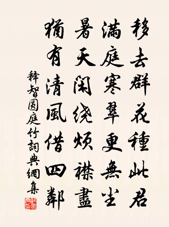 詩詞名句歷史字典書法欣賞書法字典國語詞典說文解字康熙字典古漢語字典標 題 作 者 詩 句 庭竹作者:釋智圓 朝代:宋代庭竹原文移去群花種此君,滿庭寒翠更無塵。暑天閒繞煩襟盡,猶有清風借四鄰。詩詞問答問:庭竹的作者是誰?答:釋智圓問:庭竹寫於哪個朝代?答:宋代釋智圓庭竹書法欣賞庭竹書法作品詩詞推薦臨都驛答夢得六言二首白居易〔唐代〕揚子津頭月下,臨都驛里燈前。昨日老於前日,去年春似今年。謝守歸為秘監,馮公老作郎官。前事不須問著,新負暄李復〔宋代〕朝坐前廡西,晚坐前廡東。日當正午時,置榻兩楹中。予生本多羸,憂患百箭攻。三十已白髮,歲常苦嚴冬。凝陰次韻王適落日江上二首蘇轍〔宋代〕寒煙幕清江,漁唱扁舟上。江轉少人家,自此知安往。維舟倚叢薄,明月獨相向。欲曉醉應醒,還逐輕鷗揚。稍息陳秀才亭際木蘭方乾〔唐代〕昔見初栽日,今逢成樹時。存思心更感,繞看步還遲。蝶舞搖風蕊,鶯啼含露枝。裴回不忍去,應與醉相宜。送王粹中教授入蜀樓鑰〔宋代〕萬山四塞圍平陸,大為關中次為蜀。我生東南未曾到,蜀士游從聞頗熟。自從襄陽上峻途,高欲登天下臨谷。女媧雪中懷成都陸游〔宋代〕憶在西州遇雪時,繡筵處處百花圍。烏絲闌展新詩就,油壁車迎小獵歸。感事鏡鸞悲獨舞,寄書箏雁恨慵飛。愁多偈頌一百零二首釋紹曇〔宋代〕一喝三日聾,大寂門風喪。深掘陷人坑,密布漫天綱。笑一上,哭一上。做盡死模活樣,乳峰子細思量。沉本無香焚衣街楊修〔宋代〕短頭金縷又珠胎,煙緒香雲晝不開。御路傍人皆歡息,逡巡紅焰作青灰。淳熙七年春帖子壽聖齊明廣慈太上皇后合六崔敦詩〔宋代〕花邊破日紅千疊,柳際勻煙翠一層。閱盡風光長不老,綠車當見從雲仍。蘇幕遮 別子馬鈺〔元代〕出凡籠,無系絆。落魄婪耽,日作無常觀。十四兒孫都棄┾。自在逍遙,風月為吾伴。背葫蘆,攜鐵罐。壺貯瓊漿頌古三十九首釋道樞〔宋代〕晷運推移事若何,絲來線去定謠訛。織成蜀錦千般巧,不出當時一隻梭。題湘鄉道中梅花趙蕃〔宋代〕道上梅花無數株,似能相與慰窮途。色嚴不畏晨霜勁,馥剩寧須愛日敷。落落卒無詞客賦,紛紛只了酒家沽。雖然飛來峰猿顧逢〔宋代〕天竺如巴峽,畫圖無此奇。掛藤伸黑臂,剝果餒黃兒。孤影池中夜,三聲月一時。倚闌僧不去,應是苦於詩。顧逕張蘊〔宋代〕海水還清淺,停杯問二豪。雨來江色暝,沙長岸容高。吏鞅何能脫,王程敢憚勞。秋風柁樓底,短髮不禁搔。偈二十二首釋洵〔宋代〕安居無相大伽藍,莫問前三與後三。個裡不容生一念,龍蛇猿鳥自相參。歲暮杜甫〔唐代〕歲暮遠為客,邊隅還用兵。煙塵犯雪嶺,鼓角動江城。天地日流血,朝廷誰請纓。濟時敢愛死,寂寞壯心驚。禁中見◇紅牡丹歐陽修〔宋代〕盛游西洛方年少,晚落南譙號醉翁。白首歸來玉堂署,君王殿後見◇紅。題齋壁陸游〔宋代〕小屋閒坊旋卜居,老人也看作吾廬。客知貪睡多留刺,兒未來歸自檢書。草賦萬言那直水,屬文三紙尚無驢。京麈贈羽人何授趙汝湜〔宋代〕秋水為神玉為骨,片雲出洞游虛碧。竚看他年鶴駕歸,顯彼青天與白日。送黃子聞得縣瑞安陳傅良〔宋代〕西都循吏無墨綬,密令忽用為三公。仁人遭時乃自見,不係官爵汙與隆。黃君崎嶇發半白,得縣吾州滄海東。平生名句推薦寧為雞口,無為牛後。劉向《戰國策·韓一·蘇秦為楚合從說韓王》 豆雨聲來,中間夾帶風聲。蔣捷《聲聲慢·秋聲》 私勿與人,謀必辟。來俊臣《羅織經·治下卷第三》 吳洲春草蘭杜芳,感物思歸懷故鄉。宋之問《寒食江州滿塘驛》 無人解,樹轉午陰涼舒頔《小重山·端午》 孤鴻號外野,翔鳥鳴北林。阮籍《詠懷八十二首·其一》 試上吳門窺郡郭,清明幾處有新煙。張繼《閭門即事》 今夫飛蓬遇飄風而行千里,乘風之勢也。商鞅《商君書·禁使》 人不能不樂,樂則不能無形,形而不為道,則不能無亂。荀子《荀子·樂論》 春江花朝秋月夜,往往取酒還獨傾。白居易《琵琶行 / 琵琶引》