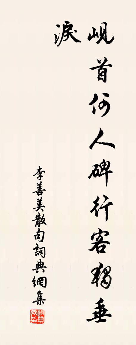 詩詞名句歷史字典書法欣賞書法字典國語詞典說文解字康熙字典古漢語字典標 題 作 者 詩 句 句作者:李善美 朝代:宋代句原文峴首何人碑,行客獨垂淚。詩詞問答問:句的作者是誰?答:李善美問:句寫於哪個朝代?答:宋代李善美句書法欣賞句書法作品詩詞推薦山中釋文珦〔宋代〕每說遠公棲隱處,亂雲□歌石難通。不是樵夫相指引,無雲得到此山中。次太白水西韻陳柄〔宋代〕涇巘翠插天,涇溪清繞郭。巒環松竹里,崖磴自樓閣。是時秋陽驕,三日此棲泊。曉色林端來,晴雲岩際落。飛梯轉調蹋莎行 元旦王寂〔元代〕爆竹庭前,樹桃門右。香湯□浴罷、五更後。高燒銀燭,瑞煙噴金獸。萱堂次第了,相為壽。改歲宜新,應時納水淺舟滯解悶十絕鄭獬〔宋代〕稚子持竿坐芳草,魚兒跋尾出浮萍。會稽巨犗沈猶脫,滄海驪龍睡不醒。醉鄉六言二首劉克莊〔宋代〕古帝神遊其所,飲仙死葬是中。晉人竊往者眾,唐朝始絕不通。減字木蘭花(厲萬頃生日,時久旱得雨)姚述堯〔宋代〕飛龍利見。前夜君王方錫宴。時天申聖節宴後二日。今日相逢。卻向南陽起臥龍。果為霖雨。洗盡蒼生炎夏苦。喜寄茅山道友三絕周文璞〔宋代〕九錫碑亭日欲曛,有人趺坐對爐薰。憑誰傳語桓司馬,句曲山中只白雲。寄同年朱景淵通判八首劉宰〔宋代〕四海游夫了,粹學洞谷今。聞善亟推挽,常恐力不任。時危系長才,白日已西沉。拱木戰寒風,淒其千載心。山居雜詩九十首曹勛〔宋代〕飯了縱閒適,杖屨涉晴晝。時物破百感,環山獻明秀。承宇茂芳桂,追涼風細逗。摘果靡憚勞,聊用引稚幼。秋旱得雨王炎〔宋代〕下田出龜兆,高田半黃埃。禾穗槁欲死,益以蟊賊災。鉦鼓競禱祈,民病神所哀。劃空走笑電,隱地鳴怒雷。雲將句張亢〔宋代〕張亢觸牆成八字,王琪望月叫三聲。魏郡別蘇明府因北游李白〔唐代〕魏都接燕趙,美女夸芙蓉。淇水流碧玉,舟車日奔沖。青樓夾兩岸,萬室喧歌鐘。天下稱豪貴,游此每相逢。洛陽滌愫鄭樵〔宋代〕修身以為弓,矯思以為矢。立義以為的,亦云善擬議。嗚呼彼鴻漸,進德亦猶水。我如罵其說,木舌暢所指。五老峰王禹偁〔宋代〕矗矗拂星榆,崢嶸與眾殊。精靈奔昂宿,神異載河圖。捧日光先及,參天禮不趣。綠蘿供組綬,清籟獻笙竽。泄雨寄曾子固二首王安石〔宋代〕嚴嚴中天閣,藹藹層雲樹。為子望江南,蔽虧無行路。平生湖海士,心跡非無素。老矣不自知,低徊如有慕。傷懷春初過王仲禮教授小園曾幾〔宋代〕幽居倦孤寂,俗駕難追攀。相攜筇九節,徑造茅三間。三卿貧無事,況得獨冷官。衡門靜如水,委巷深于山。自言詩品二十四則清奇司空圖〔唐代〕娟娟群松,下有漪流。晴雪滿汀,隔溪漁舟。可人如玉,步屟尋幽。載行載止,空碧悠悠。神出古異,淡不可收。李大著惠示詩卷次韻首篇為謝獻之喻良能〔宋代〕辱贈舂容捲軸新,懸知蚤歲擅詩聲。千林有韻霜風勁,一點無塵霽月清。細味班香兼宋艷,自慚白俗與元輕。欲喔感秋呈宏父兼呈周楚望三首張耒〔宋代〕西風吹我舟,系纜岸邊柳。蕭蕭落船葉,日夕煩我帚。心驚芳歲晚,日月去如走。搔我鬢邊發,少壯寧復久。平生高司業二首張嵲〔宋代〕旌頭落盡少微明,追復成均雅頌聲。詔起儒宗高一代,禮隆師範表諸生。拾遺柱史當螭立,潤色綸言倚馬成。行氫名句推薦同為懶慢園林客,共對蕭條雨雪天。白居易《雪夜小飲贈夢得》 殘燈明滅枕頭欹,諳盡孤眠滋味。范仲淹《御街行·秋日懷舊》 遠夢歸侵曉,家書到隔年。杜牧《旅宿》 然而其持之有故,其言之成理。荀子《荀子·非十二子》 平皋行雁下,曲渚雙鳧出。崔元翰《奉和聖制重陽旦日百寮曲江宴示懷》 兩岸人家微雨後,收紅豆,樹底纖纖抬素手。歐陽炯《南鄉子·路入南中》 突營射殺呼延將,獨領殘兵千騎歸。李白《從軍行》 快意事過非快意,自古敗名因敗事。佚名《增廣賢文·下集》 慨當初,倚飛何重,後來何酷。文徵明《滿江紅·拂拭殘碑》 同聲則異而相應,意合則未見而相親戴聖《大戴禮記·保傅第四十八》