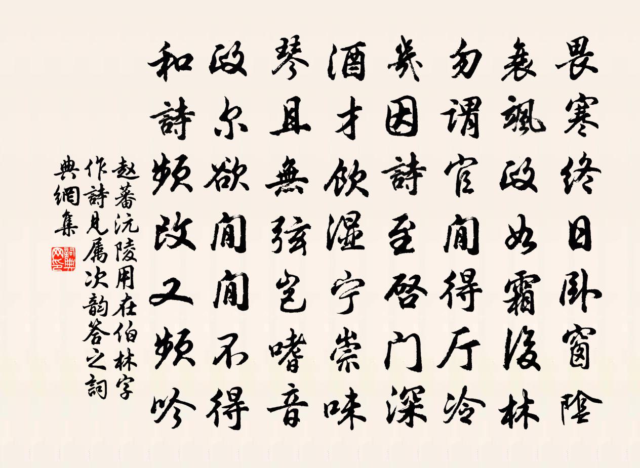 詩詞名句歷史字典書法欣賞書法字典國語詞典說文解字康熙字典古漢語字典標 題 作 者 詩 句 沅陵用在伯林字作詩見屬次韻答之作者:趙蕃 朝代:宋代原文畏寒終日臥窗陰,衰颯政如霜後林。勿謂官閒得廳冷,幾因詩至啟門深。酒才飲濕寧崇味,琴且無弦豈嗜音。政爾欲閒閒不得,和詩頻改又頻吟。詩詞問答問:《沅陵用在伯林字作詩見屬次韻答之》的作者是誰?答:趙蕃問:該詩寫於哪個朝代?答:宋代書法欣賞沅陵用在伯林字作詩見屬次韻答之書法作品詩詞推薦子由將赴南都,與余會宿於逍遙堂,作兩絕句蘇軾〔宋代〕別期漸近不堪聞,風雨蕭蕭已斷魂。猶勝相逢不相識,形容變盡語音存。江樓有感趙嘏〔唐代〕獨上江樓思悄然,月光如水水如天。同來玩月人何在,風景依稀似去年。清平樂(宮詞)黃升〔宋代〕深深禁篽。霽日明鶯羽。風動槐龍交翠舞。恰恰花陰亭午。一簾暖絮悠揚。金爐旋炷沈香。天子方看諫疏,內人休倚欄趙汝鐩〔宋代〕倚欄有恨無人說,暮角吹梅寒聲咽。急風卷雨過雁驚,吐下蘆花一枝雪。七夕詩蕭衍〔南北朝〕白露月下團。秋風枝上鮮。瑤台含碧霧。羅幕生紫煙。妙會非綺節。佳期乃涼年。玉壺承夜急。蘭膏依曉煎。昔悲謝鄭侍郎餉酒二首曾幾〔宋代〕尊中政爾空空然,忽有一壺來眼邊。君知情快何所似,石潤怒流深夜泉。喜晴崔敦禮〔宋代〕我貧可厭迴腸煎,負郭近有桑麻田。入春十日九霪雨,夜聽瀧瀧愁不眠。雨師欺壓春無力,勾引頑陰朝復夕。丹杏長安道中有作杜荀鶴〔唐代〕回頭不忍看羸僮,一路行人我最窮。馬跡蹇於槐影里,釣船拋在月明中。帽檐曉滴淋蟬露,衫袖時飄卷雁風。子細憶鄉歌四首馮夢得〔宋代〕塞北寒氣逼,對火擁氍毹。猶憶儂家裡,蓬頭兩夾襦。歸別墅周文璞〔宋代〕幽棲久不到,猿鶴擅藤蘿。叢絛生將遍,流泉咽更多。鄰翁新釀熟,野寺暮鍾和。亦有經行者,來觀倚杖歌。再用韻魏了翁〔宋代〕規摹廣大理精微,天末行雲鑒里飛。莫把空言看簡冊,更知實理在宮闈。減字木蘭花侯善淵〔元代〕功名富貴。致使沉淪空手去。改面回頭。一失人身永劫休。歸純返樸。背境滌塵真正覺。一顆圓光。煥煥煌煌入大過□台項安世〔宋代〕馬卿幾日西山客,已有詩著道鄉。指點東城笑傖父,半年無句寫瀟湘。二月十三日謁西廟早起楊萬里〔宋代〕起來洗面更焚香,粥罷東窗未肯光。古語舊傅春夜短,漏聲新覺五更長。近來事事都無味,老去波波有底忙。還憶王檢正輓詞樓鑰〔宋代〕客授蒙傾蓋,朝參喜綴班。開藩才一水,去國遂千山。晚遇名方重,言歸鬢未斑。功名付諸子,含笑謝塵寰。上清辭五首李九齡〔唐代〕入海浮生汗漫秋,紫皇高宴五雲樓。霓裳曲罷天風起,吹散仙香滿十洲。樓鎖彤霞地絕塵,碧桃花發九天春。東皇山雨翁卷〔宋代〕一夜滿林星月白,亦無雲氣亦無雷。平明忽見溪流急,知是他山落雨來。晚自北港泛舟還家陸游〔宋代〕舒嘯蓬籠底,經行略彴西。水深鵝唼草,雨細犢掀泥。醉倚乾坤大,閒知物我齊。衡門觸冠過,聊得賦幽棲。眉州郡燕大醉中間道馳出城宿石佛院陸游〔宋代〕玻璃春作江水清,紫玉簫如雛鳳鳴。漏聲不聞看灺燭,俠氣未減欺飛觥。腳踏車萬里信有數,二年三過寧忘情。釵頭稻陂陸游〔宋代〕白水滿稻陂,投種未三宿,新秧出水面,已作纖纖綠。年來殘俸絕,所望在一熟;見之喜欲舞,不復憂半菽。想當名句推薦亂點鴛鴦譜馮夢龍《醒世恆言·卷八》 天長路遠魂飛苦,夢魂不到關山難。李白《長相思·其一》 誰知萬里客,懷古正躊躕。陳子昂《峴山懷古》 鬱陶思君未敢言,寄聲浮雲往不還。曹丕《燕歌行》 君為女蘿草,妾作菟絲花。李白《古意》 窮則獨善其身,達則兼善天下。孟子《孟子·盡心章句上·第九節》 重足而立,側目而視。司馬遷《史記·汲鄭列傳》 勝人者有力,自勝者強。老子《老子·道經·第三十三章》 春思遠,誰嘆賞、國香風味。周密《繡鸞鳳花犯·賦水仙》 生有七尺之形,死唯一棺之土,唯立德揚名,可以不朽陳壽《三國志·魏書·文帝紀》