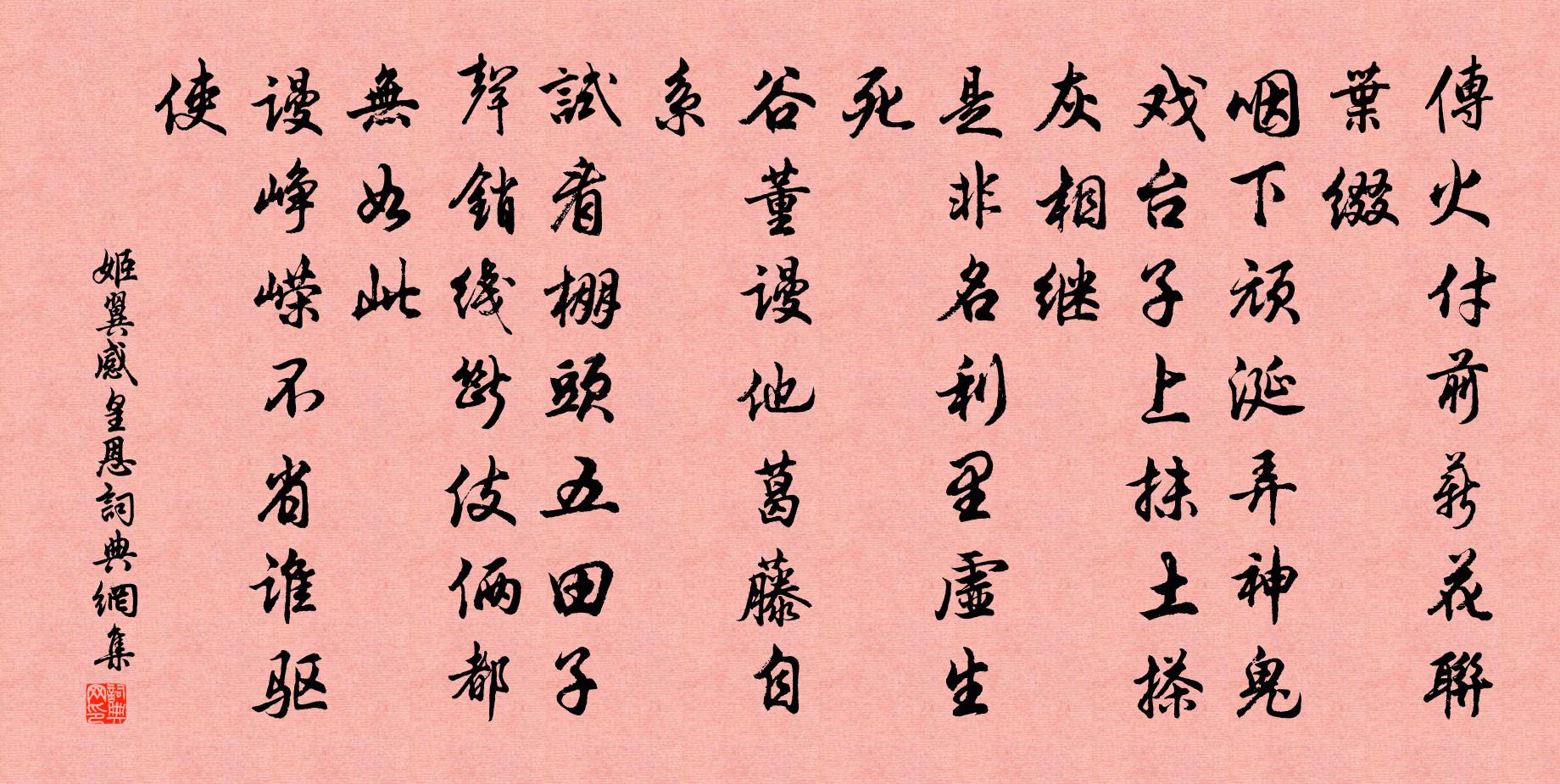 詩詞名句歷史字典書法欣賞書法字典國語詞典說文解字康熙字典古漢語字典標 題 作 者 詩 句 感皇恩作者:姬翼 朝代:元代感皇恩原文傳火付前薪,花聯葉綴。咽下頑涎弄神鬼。戲台子上,抹土搽灰相繼。是非名利里、虛生死。谷董謾他,葛藤自系。試看棚頭五田子。聲銷線斷,伎倆都無如此。謾崢嶸不省、誰驅使。詩詞問答問:感皇恩的作者是誰?答:姬翼問:感皇恩寫於哪個朝代?答:元代問:感皇恩是什麼體裁?答:詞姬翼感皇恩書法欣賞感皇恩書法作品詩詞推薦送德珉山主釋重顯〔宋代〕溪山春色映雲袍,愛住隍城意轉高。翻笑忘機自安者,不能垂手入塵勞。過劉允叔故居舒岳祥〔宋代〕流水孤村里,先生此故居。風流今已矣,天道竟何如。古屋前朝檜,薌岩萬卷書。蒼苔封瓦礫,野燐出丘墟。賈魏公雪中下湖汪元量〔宋代〕凍木號風雪滿天,平章猶放下湖船。獸爐金帳羔兒美,不念襄陽已六年。聞桂香張九成〔宋代〕清晨未盥櫛,桂香遞秋風。不知此花意,何為惱衰翁。舉頭復何有,燕雁書晴空。景物如此好,誰雲吾道窮。贈吳丹白居易〔唐代〕巧者力苦勞,智者心苦憂。愛君無巧智,終歲閒悠悠。嘗登御史府,亦佐東諸侯。手操糾謬簡,心運決勝籌。宦途東村散步有懷張漢州陸游〔宋代〕扶杖村東路,秋來始此回。寒鴉盤陣起,野菊臥枝開。憂國丹心折,懷人雪鬢催。房湖八千里,那得尺書來!鵲橋仙(安仁道中雪)趙師俠〔宋代〕同雲冪冪,狂風浩浩,激就六花飛下。山川滿目白模糊,更茅舍、溪橋瀟灑。玉田銀界,瑤林瓊樹,光映乾坤不夜閨情孟浩然〔唐代〕一別隔炎涼,君衣忘短長。裁縫無處等,以意忖情量。畏瘦疑傷窄,防寒更厚裝。半啼封裹了,知欲寄誰將。題仁義寺呂午〔宋代〕寺以仁義名,當求仁義實。只在毫釐間,遂分儒與釋。千載幾萬言,未能合為一。大笑出門去,莫問成陳跡。和劉與權韻三首吳芾〔宋代〕平生嗜好唯愛山,前身疑是山中相。歸來深處得幽棲,柴門正與山相向。聽蟬八絕句楊萬里〔宋代〕披襟散發晚風清,細細孤斟緩緩行。道是江東官事冗,綠楊陰里聽蟬聲。美人在空谷楊冠卿〔宋代〕有美人兮在空谷,肌膚冰雪顏如玉。珠袖輕綃卷翠雲,日暮天寒倚修竹。自言久住黃金屋,舞遍霓裳羽衣曲。昭陽和史侍郎游澹岩韻六首曾協〔宋代〕瀟湘少駐便經年,自信孤忠莫問天。果為冕旒勤注想,不容泉石得高眠。戲贈酒榼陸游〔宋代〕老去臥湖海,白髮朝朝新。賴有小道士,時來中聖人。形模雖簡古,風味絕清真。何當秋雨夕,傾倒見情親?鄰女劉駕〔唐代〕君嫌鄰女丑,取婦他鄉縣。料嫁與君人,亦為鄰所賤。菖蒲花可貴,只為人難見。括滿江紅林正大〔宋代〕為憶當時,沉醉里、青樓弄月。閒想像、繡幃珠箔,魂飛心折。羞向姮娥談舊事,幾經三五盈還缺。望翠眉、蟬鬢問古秦韜玉〔唐代〕大底榮枯各自行,兼疑陰騭也難明。無門雪向頭中出,得路雲從腳下生。深作四溟何浩渺,高為五嶽太崢嶸。都來餞趙提乾次李彥中韻曾豐〔宋代〕解組圖南日,攜壺賀下時。三杯幾絕倒,明日兩差池。足跡隨蓬轉,顛毛與雪期。我愁行未得,更賦送行詩。游梅坡席上雜酬李彌遜〔宋代〕夜飲寧辭醉,春酲莫厭投。有人重載酒,後會不須謀。村居遣興陸游〔宋代〕萬里征途興已闌,三間破屋住猶寬。山姜著雨房重歛,南燭先霜實半丹。野市秋陰更蕭瑟,書生老瘦轉酸寒。掩關名句推薦君之視臣如手足;則臣視君如腹心;君之視臣如犬馬,則臣視君如國人;君之視臣如土芥,則臣視君如寇讎。孟子《孟子·離婁章句下·第三節》 故人應念,杜鵑枝上殘月。文天祥《酹江月·和友驛中言別》 蘭溪三日桃花雨,半夜鯉魚來上灘。戴叔倫《蘭溪棹歌》 如切如磋,如琢如磨。佚名《淇奧》 活水源流隨處滿,東風花柳逐時新。于謙《觀書》 不道愁人不喜聽。空階滴到明。万俟詠《長相思·雨》 君子必在己者,不必在人者也。呂不韋《呂氏春秋·覽·孝行覽》 寒禽與衰草,處處伴愁顏。司空曙《賊平後送人北歸》 小立紅橋柳半垂,越羅裙颺縷金衣。納蘭性德《山花子·小立紅橋柳半垂》 海棠未雨,梨花先雪,一半春休。王雱《眼兒媚·楊柳絲絲弄輕柔》