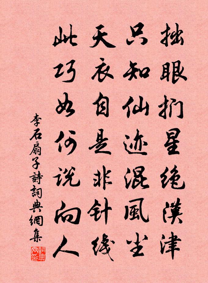 詩詞名句歷史字典書法欣賞書法字典國語詞典說文解字康熙字典古漢語字典標 題 作 者 詩 句 扇子詩作者:李石 朝代:宋代扇子詩原文拙眼捫星絕漢津,只知仙跡混風塵。天衣自是非針線,此巧如何說向人。詩詞問答問:扇子詩的作者是誰?答:李石問:扇子詩寫於哪個朝代?答:宋代李石扇子詩書法欣賞扇子詩書法作品詩詞推薦呂伯恭輓詞韓元吉〔宋代〕青雲塗路本青氈,聖願相期四十年。台閣久嗟君臥疾,山森空嘆我華顛。傷心二女同新穴,拭目諸生續舊編。斗酒次韻程願二首許月卿〔宋代〕我家張許同生歲,果者堯時值聖明。丙子與君無貴者,甲辰惟我亦同庚。閒雲萬嶺林泉興,明月一溪邱壑情。同歲北窗雅言寄朱仁叔敖陶孫〔宋代〕風日暖,天大裘。蠅飛打窗油,北窗墳策高於丘。我欲發視勞牽抽,把酒起望天門陬。斜鴻書破半張紙,枯荷綱空以廬山所產天花蕈冬筍玉延餉趙季茂通判岳珂〔宋代〕已認山家作當家,與猨分栗雀分茶。氣先十月地抽筍,光現五台天雨花。幸有玉延炊夜月,肯令繡谷咽朝霞。憑君病後寒食白居易〔唐代〕故紗絳帳舊青氈,藥酒醺醺引醉眠。抖擻弊袍春晚後,摩挲病腳日陽前。行無筋力尋山水,坐少精神聽管弦。拋擲故諫議大夫鮮于公欲作新堂以傳世譜名曰卓絕李廌〔宋代〕先生王佐材,蚤歲常數奇。平生經綸志,白首初逢時。經營此堂久,乞身竚歸期。堂成不及登,魂氣今何之。奉和襲美添漁具五篇蓑衣陸龜蒙〔唐代〕山前度微雨,不廢小澗漁。上有青襏襫,下有新腒疏。滴瀝珠影泫,離披嵐彩虛。君看荷制者,不得安吾廬。頌古一○一首釋子淳〔宋代〕垂手還他作者機,尋常語裡布鑰旗。重詢擬進歸方丈,一句分明更不疑。書齋壁仇遠〔宋代〕風收細雨斷梅天,晝永身閒但欲眠。木枕桃笙真有味,廣文不用歡無氈。南海馬大夫見惠著述三通勒成四帙…欽受嘉貺詩以謝之劉禹錫〔唐代〕紅旗閱五兵,絳帳領諸生。味道輕鼎食,退公猶筆耕。青箱傳學遠,金匱納書成。一瞬見前事,九流當抗行。編蒲春貼子詞皇后閣五首司馬光〔宋代〕寶勝金幡巧斗功,彩花蠟燕揚和風。玉盤翠苣映紅蓼,捧案朝來獻兩宮。雜興張鎡〔宋代〕漢代嘉唐虞,欲以儒理國。公孫談治道,純駁互失得。廣大語尤害,開邊心莫極。無怪淮南謀,日夜憚汲直。東閣立春帖子皇帝閣周必大〔宋代〕景龍學士賦新詩,剪彩宮花插鬢歸。何似未央深駐輦,教吟春日得春衣。縱筆陸游〔宋代〕胸中略無一點事,眼底常展數行書。半飢半飽便可爾,衣食何須求有餘。與子野過永仙觀循西城以歸邂逅李戒甫夕山西仇遠〔宋代〕壞垣荒逕入蒿萊,不惹康衢半點埃。賞靜偏憐雛筍長,趁涼自引瘦筇來。杯余潄齒呼新茗,石上題詩剝古苔。試問送吳顯道五首王安石〔宋代〕五湖大浪如銀山,問君西遊何當還。以手撫膺坐長嘆,空手無金行路難。丈夫意有在,吾徒且加餐。屏風九疊雲錦洗心吟邵雍〔宋代〕人多求洗身,殊不求洗心。洗身去塵垢,洗心去邪淫。塵垢用水洗,邪淫非能淋。必欲去心垢,須彈無弦琴。和周楚望張耒〔宋代〕宿雨琴生曉潤,琴繁雲滋暑琴陰。我居琴不葺,常苦積雨侵。果墜厭風惡,草沉知潦深。拳拳抱幽嘆,耿耿嬰煩襟送鄭待制閎中歸閩孫升〔宋代〕清曉都門祖帳開,路人相與歡賢哉。流塵幾翳看山眼,落日休停別酒杯。何待諸生留北闕,自存遺直在東台。連江弋陽道中遇大雪陸游〔宋代〕我行江郊暮猶進,大雪塞空迷遠近;壯哉組練從天來,人間有此堂堂陣!少年頗愛軍中樂,跌宕不耐微官縛;憑鞍名句推薦不厚其棟,不能任重。重莫如國,棟莫如德。左丘明《國語·魯語·子叔聲伯辭邑》 閒中件件思,暗裡般般量。康海《雁兒落帶得勝令·飲中閒詠》 殘雪庭陰,輕寒簾影,霏霏玉管春葭。王沂孫《高陽台·和周草窗寄越中諸友韻》 如何肯到清秋日,已帶斜陽又帶蟬。李商隱《柳》 求得人間成小會,試把金尊傍菊叢。晏殊《破陣子·燕子欲歸時節》 青紫雖被體,不如早還鄉。杜甫《夏夜嘆》 求賢如饑渴。受諫而不厭陳壽《三國志·吳書·張嚴程闞薛傳》 豪傑向簡淡中求,神仙從忠孝上起。陳繼儒《小窗幽記·集醒篇》 颯颯西風滿院栽,蕊寒香冷蝶難來。黃巢《題菊花》 香消翠減,雨昏煙暗,芳草遍江南。喬吉《小桃紅·春閨怨》