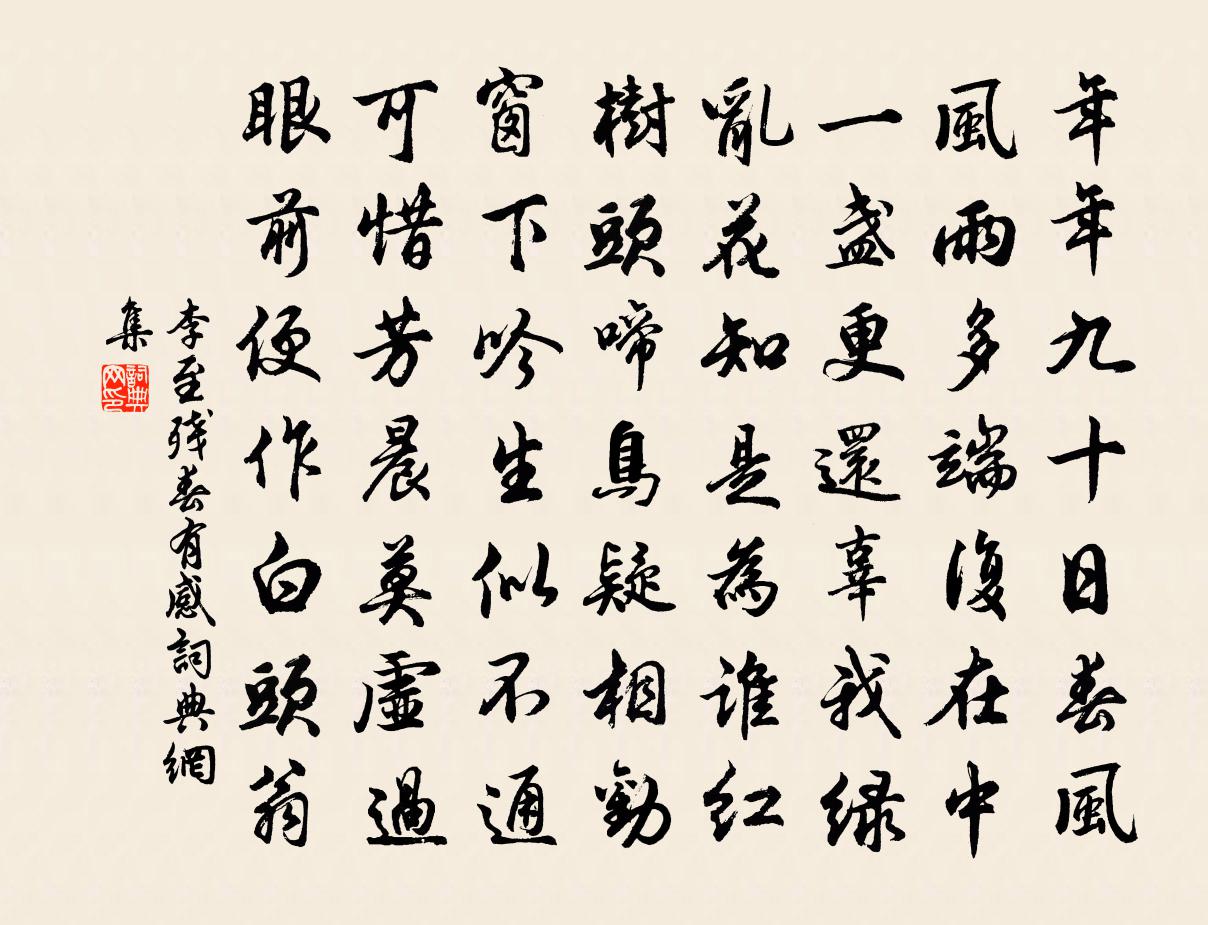 詩詞名句歷史字典書法欣賞書法字典國語詞典說文解字康熙字典古漢語字典標 題 作 者 詩 句 殘春有感作者:李至 朝代:宋代殘春有感原文年年九十日春風,風雨多端復在中。一盞更還辜我綠,亂花知是為誰紅。樹頭啼鳥疑相勸,窗下吟生似不通。可惜芳晨莫虛過,眼前便作白頭翁。詩詞問答問:殘春有感的作者是誰?答:李至問:殘春有感寫於哪個朝代?答:宋代李至殘春有感書法欣賞殘春有感書法作品詩詞推薦黔之驢柳宗元〔唐代〕黔無驢,有好事者船載以入。至則無可用,放之山下。虎見之,龐然大物也,以為神,蔽林間窺之。稍出近之,慭衛王贈桑落酒奉答詩庾信〔南北朝〕愁人坐狹斜。喜得送流霞。跂窗催酒熟。停杯待菊花。霜風亂飄葉。寒水細澄沙。高陽今日晚。應有接?斜。柳公亭范成大〔宋代〕主人敬客有餘情,催喚繩床坐柳亭。曲水流觴非故物,馬鞍山色舊青青。菩薩蠻佚名〔宋代〕長淮渺渺寒煙白。憑欄人是霜台客。時句妙春豪。風雲不啻高。樽前人已老。余恨連芳草。一麯酒醒時。梧桐月欲有所感陸游〔宋代〕世事真成風馬牛,細思愈覺此生浮。舊交散後知心少,行路難來出戶愁。氣節陵夷誰獨立,文章衰壞正橫流。魯中拄笏亭晚望范成大〔宋代〕林泉隨處有清涼,山繞闌乾客自忙。溪雨不飛虹尚飲,亂蟬高柳滿斜陽。水調歌頭鄭元秀〔宋代〕園林夸富貴,紅綠簇枝頭。陽和毓秀,氣劘屈賈壓曹劉。翰墨場中獨步,灑落胸中萬卷,橫截百川流。邈視青雲侶奉川道中四絕釋寶曇〔宋代〕摘星黃漢在何許,淺水平山容易過。未必山靈慣看客,勒回俗駕奈渠何。揚州雜詠七首晁補之〔宋代〕雷陂新作麥田荒,曾說風興沒兩郎。誰似當年李刺史,春波還引句城塘。春集東園詩李淑〔宋代〕東城桃李春,結客玩珍花。試過辟疆園,兼屈中郎屣。筠苞煙蔽虧,柳帶風眠起。岸幘藉芳艿,銜杯嗅新蕊。留連聽雨項安世〔宋代〕幸自蓬窗好,儂家企腳眠。雨聲無賴得,相喚著愁邊。蕭灑桐廬郡十絕范仲淹〔宋代〕蕭灑桐廬郡,開軒即解顏。勞生一何幸,日日面青山。送隱者一絕杜牧〔唐代〕無媒徑路草蕭蕭,自古雲林遠市朝。公道世間唯白髮,貴人頭上不曾饒。伏蒙知縣縣尉二寮友以夏旱得雨賡石徂徠喜雨王之道〔宋代〕綠槐陰外聽蟬吟,節過分龍夏已深。千里亢陽憂歲旱,一時甘雨快人心。養禾不害連朝噎,沃暑應容數日霖。多謝無調名 贈丹陽王哲〔元代〕酒初醒。夢初驚。月初明。性初平。如覺悟,是前程。題蛻龍洞伏虎岩佚名〔宋代〕空岩深峻可棲真,猛虎溫馴異類親。正節天師時憩此,逍遙忘返詠章新。梅花引 過天門關作趙秉文〔金代〕山如峽。天如席。石顛樹老冰崖坼。雪霏霏。水洄洄。先生此道,胡為乎來哉。石頭路滑馬蹄蹶。昂頭貪看山奇絕偈二首釋方會〔宋代〕楊歧一要,千聖同妙。布施大眾,果然失照。贈蜀醫鍾正甫文天祥〔宋代〕炎皇鑒從草,異種多西州。為君望岷峨,使我雙淚流。向來秦越人,朝洛夕邯鄲。子持鵲經來,自西亦徂南。江南寄題葉路分與君樓如今若肯從徵召總把三峰乞葉適〔宋代〕封侯無便乞名山,只許幽人獨占閒。若會當時與君意,林泉合在市朝間。名句推薦君問歸期未有期,巴山夜雨漲秋池。李商隱《夜雨寄北》 矜偽不長,蓋虛不久。韓非及後人《韓非子·難一》 一葉度春風,芳芳自相接。蕭衍《芳樹》 飢不擇食,寒不擇衣,慌不擇路,貧不擇妻。施耐庵《水滸傳·第三回》 澗戶寂無人,紛紛開且落。王維《辛夷塢》 巧笑東鄰女伴,採桑徑里逢迎。晏殊《破陣子·春景》 紫黯紅愁無緒,日暮春歸甚處?龔自珍《如夢令·紫黯紅愁無緒》 明朝甑復空,母子相持哭。陸游《十月二十八日風雨大作》 記少年、駿馬走韓盧,掀東郭。辛棄疾《滿江紅·和范先之雪》 斷腸片片飛紅,都無人管,倩誰喚、流鶯聲住。辛棄疾《祝英台近·晚春》