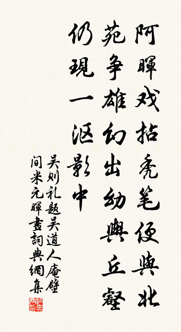 詩詞名句歷史字典書法欣賞書法字典國語詞典說文解字康熙字典古漢語字典標 題 作 者 詩 句 題吳道人庵壁間米元暉畫作者:吳則禮 朝代:宋代題吳道人庵壁間米元暉畫原文阿暉戲拈禿筆,便與北苑爭雄。幻出幼輿丘壑,仍現一漚影中。詩詞問答問:題吳道人庵壁間米元暉畫的作者是誰?答:吳則禮問:題吳道人庵壁間米元暉畫寫於哪個朝代?答:宋代吳則禮題吳道人庵壁間米元暉畫書法欣賞題吳道人庵壁間米元暉畫書法作品詩詞推薦學古詩鮑照〔南北朝〕北風十二月。雪下如亂巾。實是愁苦節。惆悵憶情親。會得兩少妾。同是洛陽人。嬛綿好眉目。閒麗美腰身。凝膚塘上行文同〔宋代〕寒塘漲新雨,灩灩翠波滿。沙晴步聲澀,風引羅帶緩。蒲牙妒舌利,荷葉歡心卷。生平玉衣夢,至此神亦誕。徒誦端午帖子皇帝合六首歐陽修〔宋代〕聖主憂勤致治平,仁風惠澤被群生。自然四海歸文德,何用靈符號辟兵。哭邢芻父六首蘇泂〔宋代〕未晬俄孤子,垂髫便俊聲。深知表獨立,敢謂竟無成。嗜好惟經史,情親到友生。回看真夢幻,未必泯神明。起水陸堂釋普濟〔宋代〕一漚大覺海中興,十趣波濤不暫停。返本還源空覺海,滿堂風月雨初晴。古風一首奉送淳叟太博通守豫章喻良能〔宋代〕劉侯精神秋隼緊,高論懸河傾不盡。至尊動卮色嗟諤,權幸切齒畏謇謇。致君未覺賈誼疏,濟時尚嫌馬周窘。三年若耶村老人陸游〔宋代〕昔聞若耶村,意象乃物外。皤然阡陌間,來往幾鮐背。無論百歲翁,甲子數至再,我來親見之,殊未輟耕耒。曩事漁父詞一十八首疾瞥地呂岩〔唐代〕萬劫千生得個人,須知先世種來因。速覺悟。出迷津,莫使輪迴受苦辛。至鄂期年以饟事不給於詩己亥夏五廿有八日始岳珂〔宋代〕一江漲碧碧於藍,健櫓鳴鵝舳正銜。才似過都空萬馬,又驚倚岸閱千帆。問漁父黃庭堅〔宋代〕白髮丈人持竹竿,繫船留我坐柴關。偶然領會一談勝,落日使人思故山。盆中四時木犀何應龍〔宋代〕一樹婆娑月里栽,是誰移種下天來。金英恰似清霄月,一度圓時一度開。清平樂(七月十三日潘令生朝)韓淲〔宋代〕鳴琴單父。鳧舄宜飛去。不比河陽花滿樹。此意直高千古。清秋誕日相逢。乃同澗上村儂。笑指壺山為壽,仁心靜金蕉葉(大石調)柳永〔宋代〕厭厭夜飲平陽第。添銀燭、旋呼佳麗。巧笑難禁,艷歌無間聲相繼。準擬幕天席地。金蕉葉泛金波齊,未更闌、已詠史上鄒衍陳普〔宋代〕六月鹹陽霜亦飛,五行正是水昌時。族秦自是談天衍,不用陶朱與仲尼。鵲橋仙 上都金蓮劉敏中〔元代〕重房自拆,嬌黃誰注。爛熳風前無數。凌波夢斷幾番秋,只認得、三生月露。川平野闊,山遮水護。不似溪塘遲暮題石井泉沈揆〔宋代〕上方高閣倚層巒,下有清泉一鑒寒。更作小亭供勝覽,盡收吟思入毫端。送曾德邁歸寧宜春曹松〔唐代〕湘東山川有清輝,袁水詞人得意歸。幾府爭馳毛義檄,一鄉看侍老萊衣。筵開灞岸臨清淺,路去藍關入翠微。想到寄謝黃元信惠茶薛師石〔宋代〕建溪金鋌直幾千,余性所嗜一已偏。尋常草卉不足進,龍團鳳夸如珉堅。長須健卒前月到,手提茶器急取煎。妻兒萬年春馬鈺〔元代〕秦川勝景果非常。最好終南珍藏鄉。竹徑梅溪生秀氣,鳳巢龍窟吐祥光。雲庵處處成雲集,道友多多論道長。劉蔣淳熙八年春帖子詞太上皇后合六首崔敦詩〔宋代〕春夕慈闈永,瑤池樂未央。管弦聲合奏,燈月影交光。名句推薦三冬暫就儒生學,千耦還從父老耕。陸游《觀村童戲溪上》 天時不如地利,地利不如人和。孟子《孟子·公孫丑章句下·第一節》 梳洗罷,獨倚望江樓。溫庭筠《望江南·梳洗罷》 人無遠慮,必有近憂。佚名《增廣賢文·上集》 逆其根則伐其本,壞其真矣。佚名《黃帝內經·四氣調神大論》 誰忍窺河漢,迢迢問鬥牛。孟浩然《他鄉七夕》 紙屏石枕竹方床,手倦拋書午夢長。蔡確《夏日登車蓋亭》 雪粉華,舞梨花,再不見煙村四五家。關漢卿《大德歌·冬景》 新寒中酒敲窗雨,殘香細裊秋情緒。納蘭性德《菩薩蠻·新寒中酒敲窗雨》 手攜稚子夜歸院,月冷空房不見人。白居易《為薛台悼亡》