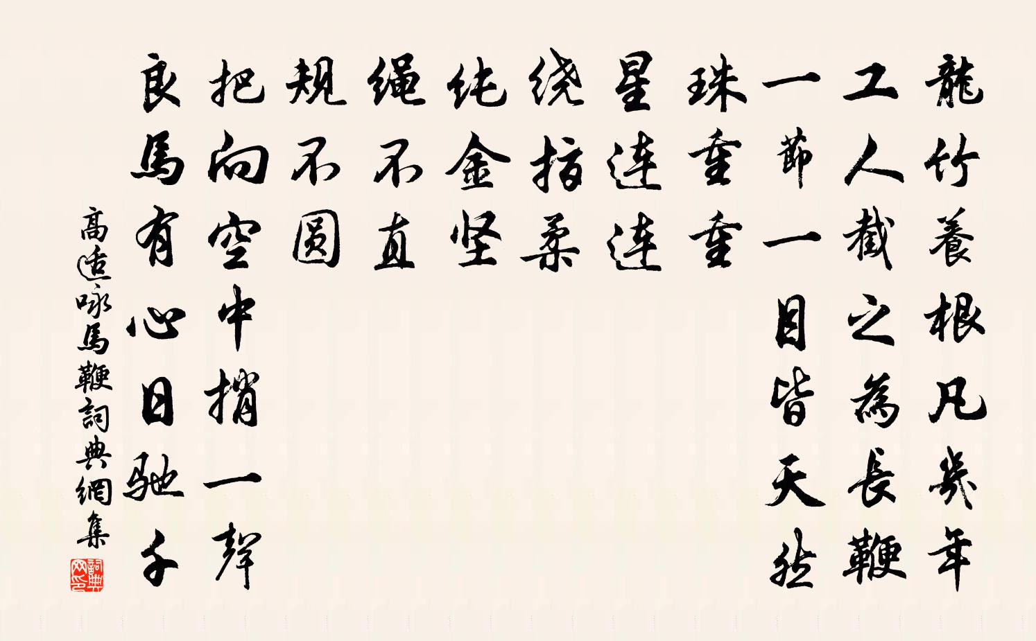 詩詞名句歷史字典書法欣賞書法字典國語詞典說文解字康熙字典古漢語字典標 題 作 者 詩 句 詠馬鞭作者:高適 朝代:唐代詠馬鞭原文龍竹養根凡幾年,工人截之為長鞭,一節一目皆天然。珠重重,星連連。繞指柔,純金堅。繩不直,規不圓。把向空中捎一聲,良馬有心日馳千。詩詞問答問:詠馬鞭的作者是誰?答:高適問:詠馬鞭寫於哪個朝代?答:唐代問:詠馬鞭是什麼體裁?答:七古問:高適的名句有哪些?答:高適名句大全高適詠馬鞭書法欣賞詠馬鞭書法作品注釋全唐詩:卷213_29詩詞推薦與謝三學士唱和八首和八月十五日齋宮對月歐陽修〔宋代〕皓月三川靜,晴氛萬里銷。靈光望日滿,寒色入波搖。灝氣成山霧,浮雲蔽壠苗。廟荒陰磷出,苑廢露螢飄。齋館閨思楊億〔宋代〕征夫萬里戍交河,塞外蕭條朔氣多。古壁暗蛩催夜織,朝來一葉下庭柯。思佳客陳允平〔宋代〕一曲清歌酒一鍾。舞裙搖曳石榴紅。寶箏弦矗冰蠶縷,珠箔香飄水麝風。嬌婭奼,笑迎逢。合歡羅帶兩心同。彩雲送韓紳卿李端〔唐代〕春雨昨開花,秋霜忽沾草。榮枯催日夕,去住皆須老。君望漢家原,高墳漸成道。送韓嶼秀才南遊趙湘〔唐代〕楊柳一蟬清,關河九日行。卻來時未熟,此去雨初晴。仆懶嫌書重,驢幽喜骨輕。還因得新句,山寺遍題名。李中令輓詞二首宋祁〔宋代〕家賜齊侯履,人推卻縠文。結婚榮外館,謀帥得中軍。盛集追園蓋,遒章托隴雲。不圖新渚畔,更作死生分。兄長有計省之命宋祁〔宋代〕長簡蓬山藏,娑娑試滿年。頻書對命笏,長負出休錢。運復光華旦,恩回咫尺天。罷披窮石訴,入佐計台員。近對念奴嬌(老人用僧仲殊韻詠荷花橫披,謹和)洪咨夔〔宋代〕香山老矣,正商量不下,去留蠻素。獨立躊躇腸欲斷,一段若耶溪女。水底新妝,空中香袖,斜日疏風浦。向人慾真情虞儔〔宋代〕魏紫姚黃次第榮,政須親戚話真情。樓台是處增詩興,羅綺叢中放酒行。下榻能留黃叔度,高齋端有謝宣城。卻憐送族子春叟游西廣李昴英〔宋代〕鳳出丹出定九苞,桂林要揀一枝巢。久聞岩竇須幽討,不是豪人莫汎交。鶴髮頻將安問寄,螢窗勤把舊書抄。功名戴帥初九日無憀以滿城風雨近重陽為韻七首袖陳著〔宋代〕履險須頓足,逢躁須戒吻。況今為何時,正恐無地隱。柴門倘可閉,即與桃源近。豈無耆舊在,努力各自謹。詠竹杯珓子魏野〔宋代〕誰知破筠根,還同一氣分。吉凶終在我,翻覆謾勞君。酒欲祈先酹,香臨擲更焚。吾嘗學丘禱,懶把祝云云。題撫州驛曾黯〔宋代〕一出都門五見春,衣冠空染九衢塵。山林有約誰留汝,猿鶴無言解怨人。送崇鏡上人歸剡因寄聲高九萬孫季蕃林表民〔宋代〕送師歸隱鏡山中,萬壑千岩指顧間。磵恭維馬如見問,為言憔悴老江關。早蟬白居易〔唐代〕月出先照山,風生先動水。亦如早蟬聲,先入閒人耳。一聞愁意結,再聽鄉心起。渭上村蟬聲,先聽渾相似。衡門秦郵道中即目查慎行〔清代〕不知淫潦齧城根,但看泥沙記水痕。去郭幾家猶傍柳?邊淮一帶已無村。長堤凍裂功難就,濁浪侵南勢易奔。賤買詠才德魯訔〔宋代〕韻如風蟬蛻塵垢,氣如春容在楊柳。風流翰墨俱細事,自是吾家道門友。秋晚雜興陸游〔宋代〕漠漠漁村煙雨中,參差蒼檜映丹楓。古來畫手知多少,除卻范寬無此工。秋雲王安石〔宋代〕秋雲放雨靜山林,萬壑崩湍共一音。欲記荒寒無善畫,賴傳悲壯有能琴。頌古一百則釋正覺〔宋代〕三老暗轉舵,孤舟夜回頭。蘆花兩岸雪,煙水一江秋。風力扶帆行不棹,笛聲喚月下滄洲。名句推薦三歲為婦,靡室勞矣。夙興夜寐,靡有朝矣。佚名《氓》 明犯強漢者,雖遠必誅。班固《漢書·傳·傅常鄭甘陳段傳》 益者三友,損者三友。友直、友諒、友多聞,益矣;友便辟、友善柔、友便佞,損矣。孔子弟子《論語·季氏篇》 江春不肯留歸客,草色青青送馬蹄。劉長卿《送李判官之潤州行營》 不躓于山,而躓於垤。韓非及後人《韓非子·六反》 攜扙來追柳外涼,畫橋南畔倚胡床。秦觀《納涼》 採桑秦氏女,織錦竇家妻。薛道衡《昔昔鹽》 飄飄何所似,天地一沙鷗。杜甫《旅夜書懷》 天地之性,人為貴。 人之行,莫大於孝。孔子及其弟子《孝經·聖治》 聞道春還未相識,走傍寒梅訪訊息。李白《早春寄王漢陽》