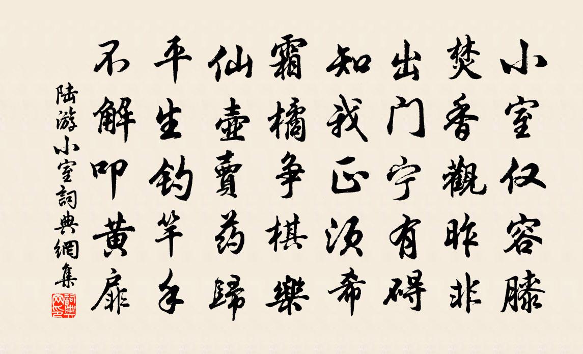 詩詞名句歷史字典書法欣賞書法字典國語詞典說文解字康熙字典古漢語字典標 題 作 者 詩 句 小室作者:陸游 朝代:宋代小室原文小室僅容膝,焚香觀昨非。出門寧有礙?知我正須希。霜橘爭棋樂,仙壺賣藥歸。平生釣竿手,不解叩黃扉。詩詞問答問:小室的作者是誰?答:陸游問:小室寫於哪個朝代?答:宋代問:陸游的名句有哪些?答:陸游名句大全陸游小室書法欣賞小室書法作品詩詞推薦和故人韻文天祥〔宋代〕人情嗟愈變,世法合何如。氣以心平定,才因意廣疏。時行或時止,無咎亦無譽。第一嚴交際,琴紳敢不書。曲尺山雲居寺王灼〔宋代〕循溪上坡坨,溪亦因山曲。行盡高深處,招提隱山腹。往者灰燼餘,白塔但孤矗。十年鬧斤斧,有此千間屋。阿師子夜四時歌·秋風入窗里佚名〔南北朝〕秋風入窗里,羅帳起飄揚。仰頭看明月,寄情千里光。偈頌十七首釋智愚〔宋代〕有意待不來,無心忽會面。頂發垂絲,眼光如電。說盡湖海風波,論量柴米貴賤。更有一處少人知,也是重安眼上戛玉有餘聲管雄甫〔唐代〕戛玉音難盡,凝人思轉清。依稀流戶牖,仿佛在檐楹。更逐松風起,還將澗水並。樂中和舊曲,天際轉餘聲。漂渺嘉泰癸亥元日口占寄呈永和乘成兄周必大〔宋代〕歸田初不隔江淮,底事新元未往來。賭酒彈棋真夢爾,膠牙藍尾亦悠哉。莫思樂事年年減,且喜春花日日開。兄弟用黃侍郎韻題宇文發運瑞萱亭二首魏了翁〔宋代〕春風拍拍壽觴前,人有何憂樹爾萱。老眼未忘兒女愛,花隨人意瑞家園。釣魚蘇泂〔宋代〕是非不上釣魚舟,從此閒身得自由。一色藕花三十丈,明年歸住鑑湖頭。送湯倅二首虞儔〔宋代〕青衫試吏古桐川,識面池陽別駕賢。但喜論交時一笑,不知為客度三年。新來懷抱愁分袂,此去功名好著鞭。未必得告上冢宋庠〔宋代〕拜墓標唐令,褒親漏漢恩。永懷淒欲寄,忠訓藹如存。宰樹錦城陌,農疇潁曲村。異時裁敘傳,容或記皋門。歸雁亭白玉蟾〔宋代〕嗟予尚未發星星,今日杯茶歸雁亭。幾見霜翎巢白草,數行雲足篆青冥。方將寄字來苕霅,莫便翻身過洞庭。握手挽仁宗皇帝詞金君卿〔宋代〕慈儉身先治道間,未嘗論罰不從寬。成功日比堯年盛,與子人知夏鼎安。憑几遺音傷萬古,抱弓銜恨泣千官。昭陵水調歌頭(壽段知事。時方旱,祈雨大作)胡幼黃〔宋代〕有喜君初度,風雨作秋聲。連旬烈日,稻畦麥壠欲揚塵。好似天瓢在手,笑把群龍呵叱,四野注如傾。勃勃生意滿寄上兄長韓偓〔唐代〕兩地支離路八千,襟懷悽愴鬢蒼然。亂來未必長團會,其奈而今更長年。白狗峽范成大〔宋代〕江紋圓復破,樹色昏還明。連灘竹節稠,洶怒奔夷陵。石磯鐵色頑,相望如奸朋。踞岸意不佳,當流勢尤獰。山回園中作陸游〔宋代〕病侵衰境頻須藥,日漏寒雲旋作晴。幽鳥喚回殘枕夢,蠻童扶下野堂行。書生本自安窮處,豐歲何妨樂太平。新買許敬之用余言作松山草堂然游山之意猶未已也葉適〔宋代〕許子家住松山邊,門開路闢登山巔。千年茂樹不改葉,百尺甘井常流泉。堂中悄然人境絕,時有剝啄延臞仙。天下運司園亭湲玉亭杜敏求〔宋代〕林亭幽且深,砌下玉溪水。淙琤環佩聲,曉夕清心耳。使君性所樂,愛玩不少已。方持利物心,默坐窮至理。校書朱君示及園居勝概新篇一軸皆有標目軋成盧革〔宋代〕姑蘇右浙會,園榭森相望。之子脫名鎖,自主無何鄉。虛堂布遺經,周孔之文章。靜齋播風雅,弦音日洋洋。吮豪依韻和唐彥猷華亭十詠秦始皇馳道梅堯臣〔宋代〕秦帝觀滄海,勞人何得修。石橋虹霓斷,馳道鹿麋游。車轍久已沒,馬跡亦無留。驪山寶衣盡,萬古空冢丘。名句推薦朝騁騖兮江皋,夕弭節兮北渚;屈原《九歌》 杜鵑再拜憂天淚,精衛無窮填海心。黃遵憲《贈梁任父母同年 / 題梁任父同年》 上有青冥之長天,下有淥水之波瀾李白《長相思·其一》 江上旗亭,送君還是逢君處吳大有《點絳唇·送李琴泉》 家國興亡自有時,吳人何苦怨西施。羅隱《西施》 塞北梅花羌笛吹,淮南桂樹小山詞。劉禹錫《楊柳枝詞九首·其一》 衰楊古柳,幾經攀折,憔悴楚宮腰柳永《少年游·參差煙樹灞陵橋》 殷勤花下同攜手。更盡杯中酒。美人不用斂蛾眉。葉夢得《虞美人·雨後同乾譽才卿置酒來禽花下作》 今夜月明江上、酒初醒。黃庭堅《南歌子·槐綠低窗暗》 欲利己,便是害己;肯下人,終能上人。王永彬《圍爐夜話·第二一五則》
