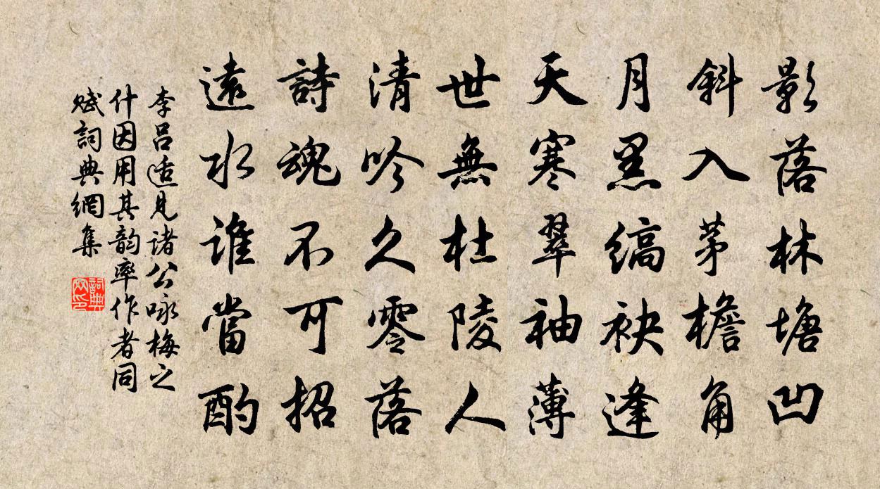 詩詞名句歷史字典書法欣賞書法字典國語詞典說文解字康熙字典古漢語字典標 題 作 者 詩 句 適見諸公詠梅之什因用其韻率作者同賦作者:李呂 朝代:宋代原文影落林塘凹,斜入茅檐角。月黑縞袂逢,天寒翠袖薄。世無杜陵人,清吟久零落。詩魂不可招,遠水誰當酌。詩詞問答問:《適見諸公詠梅之什因用其韻率作者同賦》的作者是誰?答:李呂問:該詩寫於哪個朝代?答:宋代書法欣賞適見諸公詠梅之什因用其韻率作者同賦書法作品詩詞推薦湖南午坐雨作歸山堂共成四絕句張鎡〔宋代〕平時吾亦愛吾廬,今雨巢禽亦引雛。好是階前四高檜,枝枝葉葉綴明珠。和斯遠西軒竹二首趙蕃〔宋代〕道上行人暍,林間釋子幽。去無相趣迫,聊得小夷猶。竹樹擁檐立,溪山隨檻流。自非能賦者,常是欲眠休。信手翻古人詩隨所得次韻夜坐除夜沐浴陸游〔宋代〕病起瘦可驚,崚嶒夜窗影。八十遂當至,何止踐衰境。食簞幸能盡,藥裹亦已屏,汲泉煮日鑄,舌本味方永。士苦陰漫漫行王安石〔宋代〕愁雲怒風相追逐,青山滅沒滄江覆。少留燈火就空床,更聽波濤圍野屋。憶昨踏雪度長安,夜宿木瘤還苦寒。誰雲太常引 為萬奴總管壽王惲〔元代〕重於山嶽藹如蘭。喜一旦,得同官。裁*笑談間。道不似、當年將壇。一年好處,中秋節近,涼露洗金盤。丹桂月閒居感懷和屏山韻趙時韶〔宋代〕還我山林且買鄰,荊榛不礙自由身。梅兄竹弟相依舊,李婢桃奴一任新。湖海到今無劍客,江山如作老詩人。不知松菊堂讀史五首晁補之〔宋代〕當年伏地全楊李,公亦何知愛惡間。千古論心許公近,百年歸意與誰閒。偈頌六十五首釋普濟〔宋代〕南山虎齩大蟲,鱉鼻蛇頭生角。大地六反震動,文殊普賢驚愕。過登源英濟廟祈雨虞儔〔宋代〕連年因旱禱叢祠,未免斯民有怨咨。擬學催科今晚矣,不能引去更何之。下田敢有百車望,好雨猶寬三日期。慚愧六月二十日夜渡海蘇軾〔宋代〕參橫斗轉欲三更,苦雨終風也解晴。雲散月明誰點綴,天容海色本澄清。空餘魯叟乘桴意,粗識軒轅奏樂聲。九死余將北征先送同解宋祁〔宋代〕動地箕風白草乾,旗亭歌闋據征鞍。三冬大雪梁台路,不敢逢君唱苦寒。劉致政壽藏歸庵姜特立〔宋代〕我愛青溪山,峰巒秀如刻。作庵賢主人,只恐歸未得。且住三千秋,遊戲人間客。遺蛻何足論,西乾有真宅。霜天曉角陳著〔宋代〕感不已江寒雁咽。短棹還催發。曾是玉堂仙伯,相別處、滿蓬雪。此別。那堪說。溯風空淚血。惟有梅花依舊,香夜行船侯善淵〔元代〕*雪囊中無俗物。恣疏慵、有誰拘束。不患虛名,無榮無辱。佻佻幾人相逐。獨坐弦歌*盈卮。昂簪看、斷雲相續郡送桃符戲書方回〔宋代〕狂頗如豪拙似痴,人難忍者我能之。六旬老境三椽屋,四海虛名萬首詩。不惜黃金償酒債,猶將白髮綴花枝。兒孫春日韓元吉〔宋代〕霏霏小雨映煙光,睡起文書正滿床。芍藥倚階才弄色,酴醾堆駕漸吹香。林端好鳥猶相應,葉底殘花欲自藏。便覺句梅詢〔宋代〕鶴樓試望晴霞斷,鸚渚行吟綠蕙春。跋羅春伯所藏高氏樂毅論楊萬里〔宋代〕右軍樂毅論,大令洛神賦。王家小楷天取將,秪余驚鸞尚雙翥。昭陵銀海閟銀鉤,秦王臥看偷兒偷。秣陵井苔剝山送四子耜倅四明二首曹勛〔宋代〕高秋風月變新涼,老淚何堪不計雙。從此夢魂應逐汝,南雲夜夜過鄞江。水調歌頭呂渭老〔宋代〕其韻而寄之暮雲遮遠眼,疊疊入青煙。十年不見,醯雞同舞瓮中天。聞道山陰回棹,相去都無百里,李郭可同船。名句推薦道雖邇,不行不至;事雖小,不為不成。荀子《荀子·修身》 風雨端陽生晦冥,汨羅無處吊英靈。貝瓊《已酉端午》 萬事莫貴於義。墨子《墨子·47章 貴義》 落梅庭榭香,芳草池塘綠。晏幾道《生查子·落梅庭榭香》 只在此山中,雲深不知處。賈島《尋隱者不遇 / 孫革訪羊尊師詩》 夫百病者,多以旦慧晝安,夕加夜甚佚名《黃帝內經·順氣一日分為四時》 興國在於務農。陳壽《三國志·魏書·辛毗楊阜高堂隆傳》 劍河風急雪片闊,沙口石凍馬蹄脫。岑參《輪台歌奉送封大夫出師西征》 夜來城外一尺雪,曉駕炭車輾冰轍。白居易《賣炭翁》 當時輕別意中人,山長水遠知何處。晏殊《踏莎行·碧海無波》