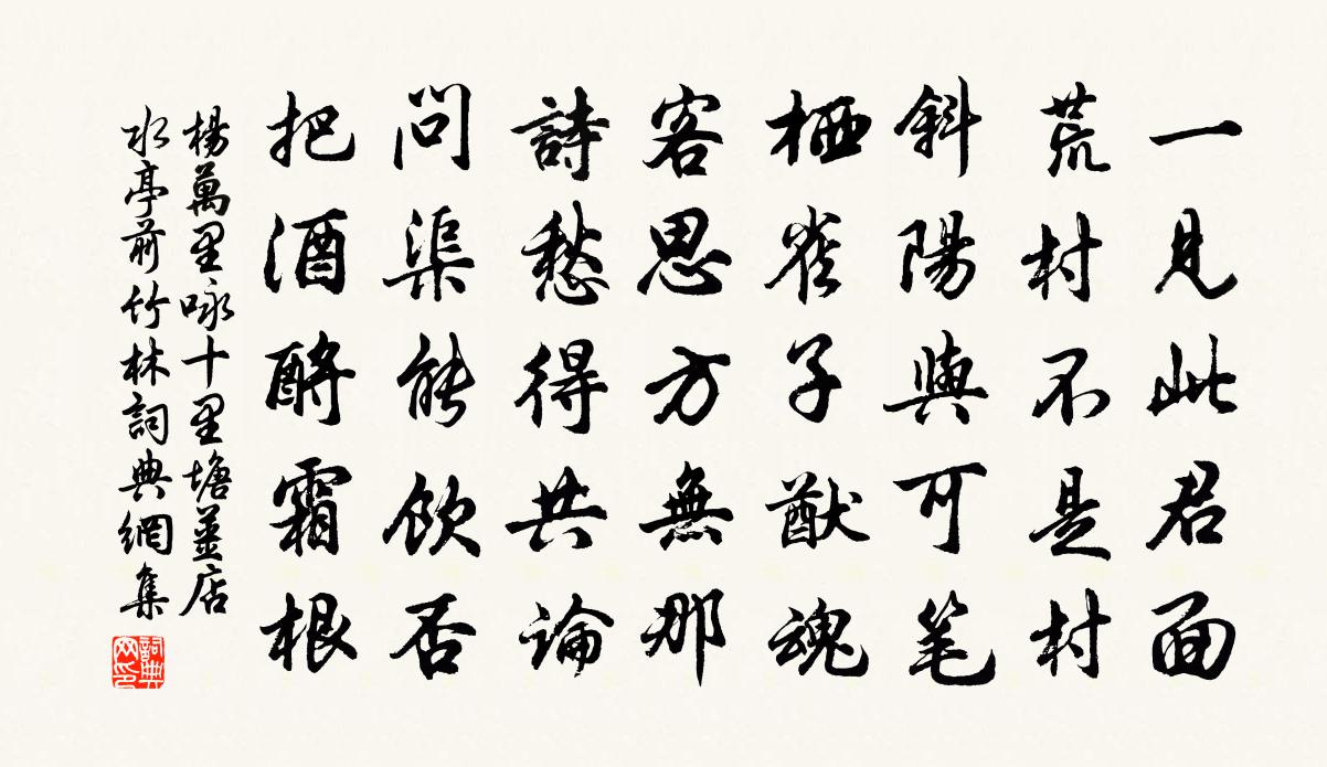 詩詞名句歷史字典書法欣賞書法字典國語詞典說文解字康熙字典古漢語字典標 題 作 者 詩 句 詠十里塘姜店水亭前竹林作者:楊萬里 朝代:宋代詠十里塘姜店水亭前竹林原文一見此君面,荒村不是村。斜陽與可筆,棲雀子猷魂。客思方無那,詩愁得共論。問渠能飲否,把酒酹霜根。詩詞問答問:詠十里塘姜店水亭前竹林的作者是誰?答:楊萬里問:詠十里塘姜店水亭前竹林寫於哪個朝代?答:宋代問:楊萬里的名句有哪些?答:楊萬里名句大全楊萬里詠十里塘姜店水亭前竹林書法欣賞詠十里塘姜店水亭前竹林書法作品詩詞推薦和黃山秋吟衛宗武〔宋代〕從教日日把巫焚,無補河流一尺渾。甘霔要從方寸出,土龍芻狗不須論。維夫君兮桂舟一首送梁正受歸汶陽晁補之〔宋代〕維君兮桂舟,酌余酒兮攬君留。君何為兮此野,菊菲菲兮蜨下。韡韡兮煌煌,爛金敷兮襲余堂。茱萸兮芙蓉,眾芳縣圃十絕和朱待制薛抗〔宋代〕鬥牛不能神,梟盧無好采。碌碌甘抱關,誰能媚時宰。三月三日白居易〔唐代〕暮春風景初三日,流世光陰半百年。欲作閒遊無好伴,半江惆悵卻回船。贈織錦人李詢〔唐代〕札札機聲曉復晡,眼穿力盡竟何如。美人一曲成千賜,心裡猶嫌花樣疏。後天易吟三十首方回〔宋代〕觀身不見背,動體悉由心。向陽負陰處,離坎細推尋。雜興六言十首劉克莊〔宋代〕重來已白髮老,獨斷擢紫薇郎。雅量雖慚子固,熱情不倩君房。送熊飛將軍赴丞相麾下李春叟〔宋代〕龍泉出匣鬼神驚,獵獵霜風送客程。白髮垂堂千里別,丹心報國一身輕。劃開雲路沖牛斗,挽落天河洗甲兵。馬革含章殿胡仲弓〔宋代〕千古風流說壽陽,梅花飄落粉猶香。寄言長信宮中女,莫學當時亡國妝。題汪水雲詩卷兜率長老〔宋代〕窮髮歸來脫孟勞,何嗟澹與泊相遭。瑤琴摘罷意猶在,石鼎聯成韻更高。世事可能書咄咄,人情只合醉陶陶。雁門少年行其一李白〔唐代〕擊築飲美酒,劍歌易水湄。經過燕太子,結托并州兒。少年負壯氣,奮烈自有時。因擊魯勾踐,爭博勿相欺。寄題吳介夫專壑七詠負閒劉學箕〔宋代〕鐘鼎本玩世,富貴徒苦人。何似天地間,蕭然一閒身。牧童盧肇〔唐代〕誰人得似牧童心,牛上橫眠秋聽深。時復往來吹一曲,何愁南北不知音。奉和景純十四丈三絕王安石〔宋代〕幾年相約在林丘,眼見京江更阻游。遺我珠璣何以報,恨無瑤玉與公舟。梅花五首楊公遠〔宋代〕半黏殘雪不勝清,可惜梢頭欠月明。影不橫斜冰未泮,香微漏洩曉初晴。餐氈蘇武應同調,披氅王恭想再生。忍凍上歸州刺史代通狀二首懷濬〔唐代〕家在閩山西復西,其中歲歲有鶯啼。如今不在鶯啼處,鶯在舊時啼處啼。家在閩山東復東,其中歲歲有花紅。而今賀新郎 題錢楞仙同年玉堂歸娶圖二首曾國藩〔清代〕寂寞深閨里。憶東風,泥金乍報,若何歡喜?撤帳筵圍停燭夜,細問當時原委。更密詢燒香詩婢。西舍東鄰多士女山園四詠煙壑姜特立〔宋代〕蒼然面者為煙,面呀然者成面壑。賴此面十八公,與之相領略。中間制小亭,面勢巧安著。千山攢修眉,一水環青記夢陸游〔宋代〕我夢結束游何邦,小憩野館臨幽窗。千峰廬山錦繡谷,一水蜀道玻璃江。春耕叱犢翁眉厖,曉汲負盎女髻雙。忽然和晦庵齋居聞磬韻鄭可學〔宋代〕纖月照幽林,秋氣一何爽。散步豁煩襟,曠然息群想。忽聞玉磬里,冷冷送清響。頓令塵慮空,頗覺道心長。名句推薦天命之謂性;率性之謂道子思《中庸·第一章》 新知遭薄俗,舊好隔良緣。李商隱《風雨》 之子歸窮泉,重壤永幽隔。潘安《悼亡詩三首》 愛子心無盡,歸家喜及辰。蔣士銓《歲暮到家》 年年今夜,月華如練,長是人千里。范仲淹《御街行·秋日懷舊》 庭前時有東風入,楊柳千條盡向西。劉方平《代春怨》 為報今年春色好。花光月影宜相照。李清照《蝶戀花·上巳召親族》 烽火連三月,家書抵萬金。杜甫《春望》 細雨春蕪上林苑,頹垣夜月洛陽宮。陸游《書憤五首·其二》 誰教歲歲紅蓮夜,兩處沉吟各自知。姜夔《鷓鴣天·元夕有所夢》