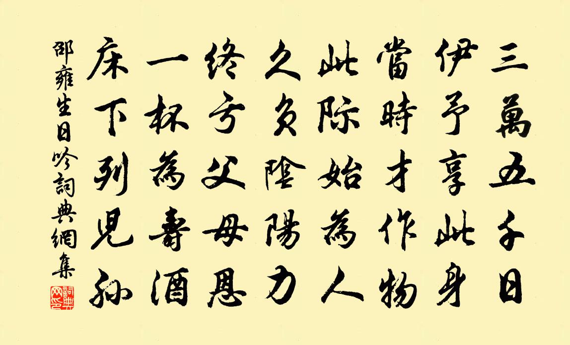詩詞名句歷史字典書法欣賞書法字典國語詞典說文解字康熙字典古漢語字典標 題 作 者 詩 句 生日吟作者:邵雍 朝代:宋代生日吟原文三萬五千日,伊予享此身。當時才作物,此際始為人。久負陰陽力,終虧父母恩。一杯為壽酒,床下列兒孫。詩詞問答問:生日吟的作者是誰?答:邵雍問:生日吟寫於哪個朝代?答:宋代邵雍生日吟書法欣賞生日吟書法作品詩詞推薦呈謝仲連章甫〔宋代〕一葦江頭風雨寒,邂逅三日同清驩。諸塵不染眼自碧,萬事隨緣心已安。雨晴歸路馬蹄疾,問君呼船定何日。杖藜歸去好鄭起〔宋代〕歸去豈不好,平田帶淺林。春猿鳴雪澗,晴日上雲岑。世久無鳴犢,時當學展禽。吾生今老矣,梁父豈能吟。和晦庵啟蒙韻丘葵〔宋代〕有人見得地中雷,三十六宮從此回。盡太虛中俱是易,底須龍馬負圖來。資中八首范祖禹〔宋代〕醮壇高倚碧天開,中有清都白玉台。霧擁霓旌乘月去,風吹仙樂下天來。王氏螟羅氏子邵雍〔宋代〕庚星一點光無涯,日來飛入江東家。江東江左舊聲氣,叔氏得之真差事。歸來瑞光凌九霄,叔氏喜亦迎眉鬢。家人瞿唐峽陽枋〔宋代〕萬太危民水墨圖,江流帶窄映雲衢。莫怪波平瀾不倒,回狂灩澦一峰孤。好事近(二月十八日)佚名〔宋代〕桃李緣陰濃,屈指中和三六。恰是仙翁初度,靄瑞煙芬馥。歌喉宛轉繞華堂,總是長生曲。他日臨清亭上,看兒孫玉蝴蝶(和梁才甫遊園作)王安中〔宋代〕御水縠紋風皺,畫橋橫處,沙路晴時。曲塢藏春,朱戶翠竹參差。過牆花、嬌無限思,籠檻柳、低不勝垂。海棠枝閏月定四時徐至〔唐代〕積數歸成閏,羲和職舊司。分銖標斗建,盈縮正人時。節候潛相應,星辰自合期。寸陰寧越度,長曆信無欺。定向柯山道上作陸游〔宋代〕道路如繩直,郊園似砥平。山為翠螺踴,橋作彩虹明。午酌金丸橘,晨炊玉粒粳。江村好時節,及我疾初平。秋興陸游〔宋代〕孤城寂寞近江乾,處處疏碪送早寒。水落才余半篙綠,霜高初染一林丹。民租屢減追胥少,吏責全輕法令寬。偶有櫻桃花范成大〔宋代〕借暖沖寒不用媒,勻朱勻粉最先來。玉梅一見憐痴小,教向傍邊自在開。詠史下諸葛孔明八首陳普〔宋代〕飛羽凋零又秭歸,卯金余息孔明知。春秋兩字誅千古,不用當年磔操丕。寄天台梵才上人梅堯臣〔宋代〕常觀月從東海出,想照石橋旁畔人。試問當年與今日,清光不改只如新。賀新郎辛棄疾〔宋代〕肘後俄生柳。嘆人生、不如意事,十常 * 。右手淋浪才有用,閒卻持螯左手。謾贏得、傷今感舊。投閣先生惟寂奉和聖制幸鳳湯泉應制張說〔唐代〕周狩聞岐禮,秦都辨雍名。獻禽天子孝,存老聖皇情。溫潤宜冬幸,游畋樂歲成。湯雲出水殿,暖氣入山營。坎意寄題滁州醉翁亭梅堯臣〔宋代〕琅琊谷口泉,分流漾山翠。使君愛泉清,每來泉上醉。醉纓濯潺湲,醉吟異憔悴。日暮使君歸,野老紛紛至。但留紹興以後時享二十五首真宗〔宋代〕於皇濬哲,遹駿有聲。率時歸考,丕在位刑。功光大業,道協三靈。永綏厥後,來燕來寧。信國魯夫人輓詩二首陳元晉〔宋代〕曾是王珪坐上人,孰知孟母德無鄰。長懷就養板輿日,一笑能回縣春天。詩感棘風知痛苦,歌翻薤露亦酸辛。送車奉和聖制經河上公廟應制蘇頲〔唐代〕河流無日夜,河上有神仙。輦路曾經此,壇場即宛然。下疑成洞穴,高若在空煙。善物遺方外,和光繞道邊。事因名句推薦善附者異旨如肝膽,拙會者同音如胡越。劉勰《文心雕龍·附會》 勿貪意外之財,勿飲過量之酒。朱柏廬《朱子家訓·全文》 莫莫高山,深谷逶迤佚名《紫芝歌》 敕勒川,陰山下。天似穹廬,籠蓋四野佚名《敕勒歌》 暗教愁損蘭成,可憐夜夜關情張炎《清平樂·候蛩淒斷》 烏絲闌紙嬌紅篆,歷歷春星。納蘭性德《紅窗月·燕歸花謝》 裊裊兮秋風,洞庭波兮木葉下。屈原《九歌·湘夫人》 雨色秋來寒,風嚴清江爽。李白《酬裴侍御對雨感時見贈》 一聲何滿子,雙淚落君前。張祜《宮詞·故國三千里》 檳榔無柯,椰葉無陰。左思《三都賦》