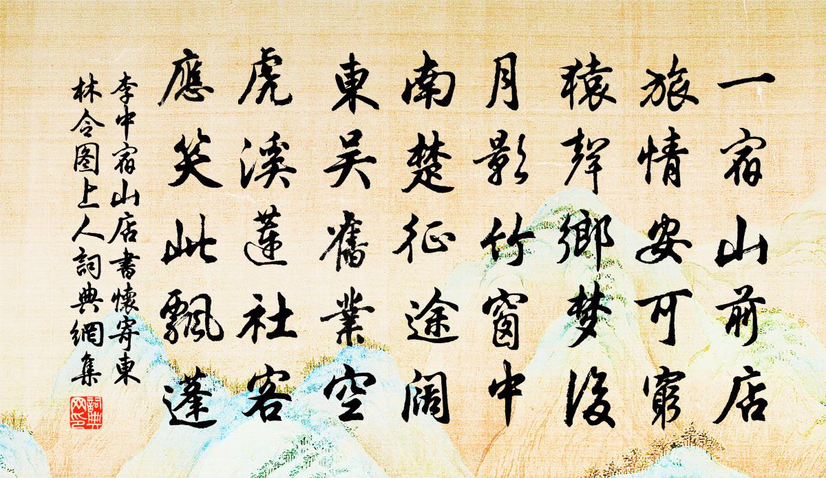 詩詞名句歷史字典書法欣賞書法字典國語詞典說文解字康熙字典古漢語字典標 題 作 者 詩 句 宿山店書懷寄東林令圖上人作者:李中 朝代:唐代宿山店書懷寄東林令圖上人原文一宿山前店,旅情安可窮。猿聲鄉夢後,月影竹窗中。南楚征途闊,東吳舊業空。虎溪蓮社客,應笑此飄蓬。詩詞問答問:宿山店書懷寄東林令圖上人的作者是誰?答:李中問:宿山店書懷寄東林令圖上人寫於哪個朝代?答:唐代問:宿山店書懷寄東林令圖上人是什麼體裁?答:五律李中宿山店書懷寄東林令圖上人書法欣賞宿山店書懷寄東林令圖上人書法作品注釋全唐詩:卷747-35詩詞推薦朝中措(上錢知郡、符主管、朱知錄三首)趙長卿〔宋代〕南樓風物一番新。春暮畀斯民。豈但仁人愷弟,更兼政事如神。人生最貴,榮登五馬,千里蒙恩。祗恐促歸廊廟,見牧牛人隔江吹笛梅堯臣〔宋代〕朝與牛出牧,晝與牛在野。日暮穿林歸,長笛初在骻。面尾騎且吹,音響未成雅。隨風散遠近,舉調任高下。我方程節推輓詩魏了翁〔宋代〕入官當是學優時,政學尤知念昨非。鬴實剖爭真識變,寶刀佩信解知幾。人謀是處雖同好,天於是當然識者希。易戲題無常鍾二絕范成大〔宋代〕著衫脫褲兩浮休,切莫隨渠認路頭。三尺蒲牢關底事,尋聲接響大悠悠。禱雨木欄堂四首陳造〔宋代〕醮壇煙斷金鼎,缺月印天一梳。想知瞻望雲漢,君王寢帳猶虛。寄福勝長老釋宗杲〔宋代〕真人十八界元空,三十一人同姓呂。分散游山各占山,三十一人又同處。感昔陸游〔宋代〕神女祠前猿夜鳴,相公溪上草初生。重遊惟有西窗夢,一點燈青夢不成。夏日集李司直縱溪齋皎然〔唐代〕修景屬良會,遠飆生煩襟。泄雲收淨綠,眾木積芳陰。疏滌府中務,迢遙湖上心。習閒得招我,賞夜宜泛琴。山近賦林景參梅嶼陳允平〔宋代〕結廬分得雁山雲,嶼上梅花是四鄰。水月一天薌世界,冰霜千古玉精神。短檠夜雨西窗夢,長鋏秋風北塞塵。我亦郊居秋晚五首趙蕃〔宋代〕只道秋蕭索,木犀能再開。驚看倚修竹,便恐滿蒼苔。花瘦非疇昔,香深有自來。微吟真浪爾,細折為誰哉。歲旱絕糧饋米三斗曾黯〔宋代〕晚景窮如許,饑寒只自憐。有書遮老眼,無策度荒年。故交分瓶粟,豪家貸子錢。本無從理相,溝壑未應填。出居庸關朱彝尊〔清代〕居庸關上子規啼,飲馬流泉落日低。雨雪自飛千嶂外,榆林只隔數峰西。送徐仲洪尉南安八首彭龜年〔宋代〕若見村中小校師,教將義理訓童兒。四端五品人人有,莫道冥頑不與知。西興陳允平〔宋代〕西興潮半落,漁浦日初昏。岳面雲收腳,沙頭浪積痕。樓鐘鳴野寺,船鼓入江村。回首長安路,歸心幾斷魂。閱道書衛宗武〔宋代〕抱璞含和道俗同,寥寥萬代想皇風。後來賢智知多少,未似當年牧馬童。玉樓春方千里〔宋代〕華堂銀燭堆紅淚。解說離人多少意。恨從別後恨無窮,愁到濃時惟一味。江南渭北三千里。憔悴相思何日已。馬蹄夜坐二首楊萬里〔宋代〕繡簾無力護東風,燭影何曾正當紅。獸炭貂裘猶道冷,梅花不易玉霜中。沁園春(送馬正君歸東嘉)陳人傑〔宋代〕盡典春衣,換酒津亭,送君此行。嘆清朝有道,何曾逐客,有司議法,忍及書生。歸去來兮,噫其甚矣,見說江濤悟空寺白玉蟾〔宋代〕迷則僧只悟剎那,遍將此事勘禪和。春深未解桃花旨,日永其如燕語何。曉殿冷凝山色重,夜樓闊占月華多。西來秋懷寄陳宗之黃簡〔宋代〕秋聲四壁動,寒事日駸駸。紅剝林閒子,青除架底陰。積閒殊有味,安拙本無心。獨愧陳徵士,賒書不問金。名句推薦有耳莫洗潁川水,有口莫食首陽蕨李白《行路難三首》 寒色孤村幕,悲風四野聞。洪升《雪望》 湖闊兼雲霧,樓孤屬晚晴。杜甫《陪裴使君登岳陽樓》 曉寒料峭尚欺人,春態苗條先到柳。毛滂《玉樓春·己卯歲元日》 桃花落。閒池閣。山盟雖在,錦書難托。陸游《釵頭鳳·紅酥手》 菊花何太苦,遭此兩重陽?李白《九月十日即事》 非淡泊無以明志,非寧靜無以致遠。諸葛亮《誡子書》 西陸蟬聲唱,南冠客思深。駱賓王《詠蟬 / 在獄詠蟬》 曲終過盡松陵路,回首煙波十四橋。姜夔《過垂虹》 一聲畫角譙門,豐庭新月黃昏,雪裡山前水濱。白樸《天淨沙·冬》