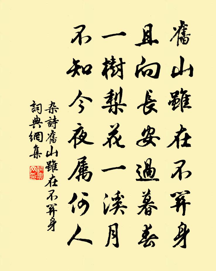 這裡所寫的美景,只是遊子對舊山片斷的記憶,而非現實身歷之境。眼下又是暮春時節,舊山的梨花怕又開了吧,她沐浴著月光,靜聽溪水潺溪,就像亭亭玉立的仙子。然而這一切都“雖在不關身”了。“不知今夜屬何人?”總之,是不屬於“我”了。這是非常苦澀難受的心情。花月本無情,詩人卻從“無情翻出有情”。這種手法也為許多唐詩人喜用。蘇頲的“可惜東園樹,無人也著花”(《將赴益州題小園壁》)、岑參的“庭樹不知人去盡,春來還發舊時花”(《山房春事》),都是著例。此詩後聯與蘇、岑句不同者,一是非寫眼前景,乃是寫想像回憶之境,境界較為空靈;一是不用陳述語氣,而出以設問,有一唱三嘆之音。