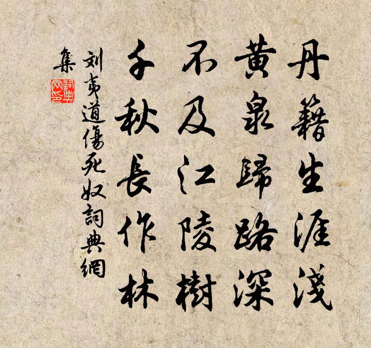 詩詞名句歷史字典書法欣賞書法字典國語詞典說文解字康熙字典古漢語字典標 題 作 者 詩 句 傷死奴作者:劉夷道 朝代:唐代傷死奴原文丹籍生涯淺,黃泉歸路深。不及江陵樹,千秋長作林。詩詞問答問:傷死奴的作者是誰?答:劉夷道問:傷死奴寫於哪個朝代?答:唐代問:傷死奴是什麼體裁?答:五絕劉夷道傷死奴書法欣賞傷死奴書法作品注釋全唐詩:卷769-4詩詞推薦投獻吏部張侍郎十韻李洞〔唐代〕苔染馬蹄青,何曾似在城。不於僧院宿,多傍御溝行。隱岫侵巴疊,租田帶渭平。肩囊尋省寺,袖軸遍公卿。夢入幽谷釋文珦〔宋代〕幽谷寒偏早,初秋御裌衣。山田禾未熟,徑樹葉先飛。澗淺樵夫涉,籬疎野鹿歸。不嫌生計薄,且與世人違。答王雪窗惠詩陳郁〔宋代〕窗以雪為名,窗中人亦清。聽無多淡話,含不盡幽情。世態秋雲薄,吟懷霽月明。似聞藏古硯,石眼可曾晴。白馬翁綬〔唐代〕渥窪龍種雪霜同,毛骨天生膽氣雄。金埒乍調光照地,玉關初別遠嘶風。花明錦襜垂楊下,露濕朱纓細草中。一夜訪僧居徐照〔宋代〕客至無他事,房門不厭敲。好山元帶郭,損屋旋鋪茅。靜砌生靈藥,高林出遠郊。水禽冬不見,春暖漸營巢。念奴嬌沈端節〔宋代〕嫩涼清曉,淡秋容、橫寫鮫綃十幅。山水光中參意味,不管人間榮辱。藜杖棕鞋,綸巾鶴氅,賓主俱遺俗。倚闌舒送邵裔長洲主簿梅堯臣〔宋代〕姑蘇城頭烏哺時,長洲草綠春袍歸。魯桑葉小蠶出遲,吳田水暖牛耕肥。里胥爭迎縣寮喜,入門先自易彩衣。拜親如山堂二首姜特立〔宋代〕飯余行挾冊,醉後臥看山。舉世皆忙者,無人伴我閒。句仇遠〔宋代〕高荷不受雨,傾瀉與低荷。低荷強自持,聚雨傾入波。朝雨尚滴瀝,晚雨忽滂沱。臨池臥以聽,雨聲靜中多。兩耳梅花 其四王冕〔元代〕昔年曾踏西湖路,巢居閣上春無數。雪晴月白影精神,瑪瑙坡前第三樹。虬枝屈夷交碧苔,疏花暖送珍珠胎。初疑春旱忽兩五絕劉克莊〔宋代〕鮭菜饁耕者,雞豚賽社公。不聞車軋軋,但見鼓冬冬。巴州薛刺史歌佚名〔唐代〕日出而耕,日入而歸。吏不到門,夜不掩扉。有孩有童,願以名垂。何以字之,薛孫薛兒。百一詩 十九應璩〔魏晉〕茍欲娛耳目。快心樂腹腸。我躬不悅歡。安能慮死亡。會昌號湘江岸有小峴亭癸卯六月與瑞金吳丞飲曾豐〔宋代〕占斷江西景,臨川擬峴台。今猶千里隔,我更幾時回。幸此亭相似,非公坐莫陪。古今隨水去,風月送詩來。環村踏雪樓鑰〔宋代〕一冬求雪雨還晴,賸喜春朝見玉霙。不為偶同佳客到,誰通常人入亂山行。雲窗霧閣知何限,玉樹瓊枝到處明。更送黃仲秉侍郎出守鎮江李流謙〔宋代〕十年朝露厭鳴珂,華發蕭蕭奈倦何。鸞翮九霄空日月,龍驤萬斛飽風波。古人不見吾猶夢,直道能行恨亦多。駟馬水調歌頭(九日醉中)方岳〔宋代〕左手紫螯蟹,右手綠螺杯。古今多少遺恨,俯仰已塵埃。不共青山一笑,不與黃花一醉,懷抱向誰開。舉酒屬吾子滿江紅(和陳漕使仙湖韻)蕭崱〔宋代〕莫是西湖,分一派、殘波勝碧。間問著、鶯仙丹事,老榕知得。荇水帶長鷗踏損,柳風絮暖魚吞入。只前山、依舊題竹房釋文珦〔宋代〕野水連苔徑,山雲掩竹房。人閒清晝永,鳥語綠陰涼。斷刻排簽古,新茶入焙香。眼前清事足,不道在殊方。楊昌英示性說次韻為謝周必大〔宋代〕聖學榛蕪欠掃際,誠齋刻意紹淵輿。羊岐自昔迷多徑,雞甕從今識廣居。西洛窮源談近似,南宗投隙說真如。早知名句推薦白頭宮女在,閒坐說玄宗。元稹《行宮》 當年曾勝賞,生香熏袖,活火分茶。李清照《轉調滿庭芳·芳草池塘》 銀燭秋光冷畫屏,輕羅小扇撲流螢。杜牧《秋夕》 嫩寒鎖夢因春冷,芳氣籠人是酒香。曹雪芹《紅樓夢·第五回》 人之所助者,信也。佚名《易傳·繫辭傳上·第十二章》 中夜四五嘆,常為大國憂。李白《經亂離後天恩流夜郎憶舊遊書懷贈江夏韋太守良宰》 願將腰下劍,直為斬樓蘭。李白《塞下曲六首》 孔子亦矙其亡也,而往拜之。孟子《孟子·滕文公章句下·第七節》 佳期大堤下,淚向南雲滿李白《大堤曲》 非其地而樹之,不生也。劉向《說苑·雜言》