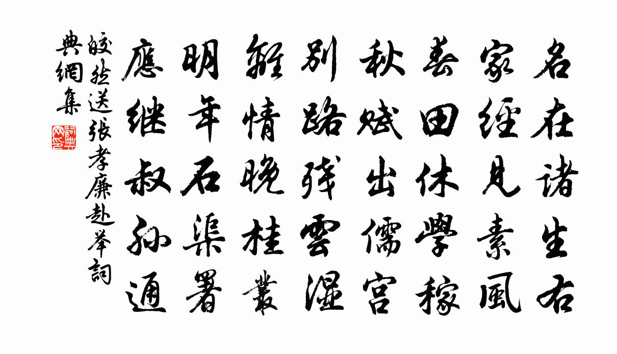詩詞名句歷史字典書法欣賞書法字典國語詞典說文解字康熙字典古漢語字典標 題 作 者 詩 句 送張孝廉赴舉作者:皎然 朝代:唐代送張孝廉赴舉原文名在諸生右,家經見素風。春田休學稼,秋賦出儒宮。別路殘雲濕,離情晚桂叢。明年石渠署,應繼叔孫通。詩詞問答問:送張孝廉赴舉的作者是誰?答:皎然問:送張孝廉赴舉寫於哪個朝代?答:唐代問:送張孝廉赴舉是什麼體裁?答:五律皎然送張孝廉赴舉書法欣賞送張孝廉赴舉書法作品注釋全唐詩:卷818-54詩詞推薦宿囊山懷洪岳二上人劉克莊〔宋代〕憶在山中識二僧,一亡一已拂衣行。壁間笠徒名藍掛,寺外松過壽塔生。隴月定知今夕恨,澗泉猶咽舊時聲。隔房湘月/念奴嬌董嗣杲〔宋代〕蓮幽竹邃,舊池亭幾處,多愛君子。醉玉吹香還認取,忙裡得閒標緻。心逐雲帆,情隨煙笛,高會知誰繼。宵筵會秦洞趙希鶚〔宋代〕白鷗曾此識機心,渭水翻波自不禁。當日尚嫌文網闊,後來誰測武陵深。西風落葉吹秦晉,流水桃花迭古今。世豈方太君生日項安世〔宋代〕金鴨煙青蠟炬紅, * 山上勸春風。乍寒還暖花無數,似缺疑圓桂欲中。八十又三人所羨,雙曈如潦壽難窮。七千西湖冰合忽見小舟曾由基〔宋代〕四望黯同雲,平湖墮銀漢。一葉柳邊來,應是寒澌泮。旅中臥病杜荀鶴〔唐代〕秋來誰料病相縈,枕上心猶算去程。風射破窗燈易滅,月穿疏屋夢難成。故園何啻三千里,新雁才聞一兩聲。我自送兄歸洛使謁嚴司空武元衡〔唐代〕六歲蜀城守,千莖蓬鬢絲。憂心不自遣,骨肉又傷離。楚峽饒雲雨,巴江足夢思。殷勤孔北海,時節易流移。憶秦娥高觀國〔宋代〕棲烏驚。隔窗月色寒於冰。寒於冰。澹移梅影,冷印疏欞。幽香未覺魂先清。無端勾起相思情。相思情。惱人無睡白蓮池王之道〔宋代〕白蓮如玉人,高潔謝脂澤。圓荷作翠蓋,掩映秋水碧。小亭日相對,無言倚輕策。偈傾一百三十三首釋法薰〔宋代〕古人一期恁麽道,白玉地瑕卻有瑕。路途之樂,終不到家。聞息有變羅公升〔宋代〕斗粟將誰憾,關弓只自憐。竟成瓜蔓摘,深愧棣華翩。甘苦同三月,幽明冀百年。衰宗更如此,愁絕古松煙。食淮白魚二首曾幾〔宋代〕十年不踏盱眙路,想見長淮屬玉飛。安得玻璃泉上酒,藉糟空有白魚肥。簡仙遊宰共瀛甫登二首王邁〔宋代〕詩要淵明賦,琴須宓子鳴。幸哉吾百里,行矣見雙清。民瘼需綏撫,人才待作成。豬肝非我嗜,無事累高明。句劉接〔宋代〕興於東晉廢於陳。山行陳宗禮〔宋代〕川原綠已張,春去今何在。深樹涵幽姿,微雲弄晴態。禽聲互酬應,林霏閒明晦。漸遠人跡稀,清音自虛籟。儀曹直廬陸游〔宋代〕春晚氣始和,微雲淡朝陽,開軒面小庭,露漬薔薇香。遊絲卷欲盡,忽復百尺長;而我正遺事,枕藉書一床。讒波懷林維國二首劉宰〔宋代〕尚記升堂拜母時,滿前兒女競牽衣。鳳雛想見今成立,雁序遙聞已奮飛。身後聲名終不朽,家傅詩禮足相輝。傷心寄范季隨范季隨父〔宋代〕萬里投殊俗,餘生老一丘。常憐子之秀,能慰此生愁。只欲連牆住,胡為下邑留。黃塵詩思盡,乞與四山秋。臨江仙·洞庭波浪颭晴天牛希濟〔五代〕洞庭波浪颭晴天,君山一點凝煙。此中真境屬神仙。玉樓珠殿,相映月輪邊。萬里平湖秋色冷,星辰垂影參然。橘長安客感雍陶〔唐代〕客淚如危葉,長懸零落心。況是悲秋日,臨風制不禁。名句推薦荊吳相接水為鄉,君去春江正淼茫。孟浩然《送杜十四之江南 / 送杜晃進士之東吳》 既生瑜,何生亮!羅貫中《三國演義·第五十七回》 路出寒雲外,人歸暮雪時。盧綸《李端公 / 送李端》 君子時詘則詘,時伸則伸也。荀子《荀子·仲尼》 行盡江南,不與離人遇。晏幾道《蝶戀花·夢入江南煙水路》 誰知得酒尚能狂,脫帽向人時大叫。陸游《三月十七日夜醉中作》 梨花院落溶溶月,柳絮池塘淡淡風。晏殊《無題·油壁香車不再逢》 何用慰相思,裁書寄關右。李益《送諸暨王主簿之任》 害人之心不可有,防人之心不可無,此戒疏於慮者。洪應明《菜根譚·概論》 眼孔淺時無大量,心田偏處有奸謀。馮夢龍《醒世恆言·卷一》