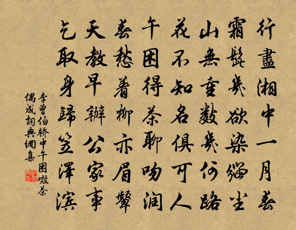 詩詞名句歷史字典書法欣賞書法字典國語詞典說文解字康熙字典古漢語字典標 題 作 者 詩 句 轎中午困啜茶偶成作者:李曾伯 朝代:宋代轎中午困啜茶偶成原文行盡湘中一月春,霜髭幾欲染緇塵。山無重數幾何路,花不知名俱可人。午困得茶聊吻潤,春愁著柳亦眉顰。天教早辦公家事,乞取身歸笠澤濱。詩詞問答問:轎中午困啜茶偶成的作者是誰?答:李曾伯問:轎中午困啜茶偶成寫於哪個朝代?答:宋代李曾伯轎中午困啜茶偶成書法欣賞轎中午困啜茶偶成書法作品詩詞推薦達磨贊釋法薰〔宋代〕白璧暗投,遭他按劍。折得莖蘆,還衝巨浪。闔國人追亦不回,掩羞賴有閒和尚。送零陵賈使君二首張栻〔宋代〕孝友傳家法,如君好弟兄。只應推此意,便足慰民情。間歲仍艱食,新書督勤耕。想今瀟水畔,惟日望雙旌。題羅溪李店二首楊萬里〔宋代〕誰道村郊野味侵,柴扉竹榻草花清。行行且止成佳夢,不減崔張驚夢身。偶書三首李處權〔宋代〕朝雲漠漠雨絲勻,山路清無一點塵。桃李著花溪水滿,斷腸何處故園深。禪人並化主寫真求贊釋正覺〔宋代〕默默湛存,昭昭元鑒。發用也連乾繼坤,緣應也明離暗坎。和趙茂州即事六首郭印〔宋代〕邊城贏得自由身,富有江山豈是貧。水榭晴雲來幾席,月庭香霧濕衣巾。已邀松竹為三友,更列圖書作四鄰。不會懷曾景建二首劉克莊〔宋代〕曾有舂陵逐客篇,流傳哀動紫陽仙。安知太白長流處,亦在重華野葬邊。碎板一如坡貶日,蓋棺不見檜薨年。誰雲興田鋪范雲山〔宋代〕曲坡行盡處,雞犬兩三家。十里長亭路,青山道正賒。山海關送季弟南還袁崇煥〔明代〕弟兄於汝倍關情,此日臨歧感慨生。磊落丈夫誰好劍?牢騷男子爾能兵。才堪逐電三驅捷,身上飛鵬一羽輕。行矣首夏同諸校正游開元觀,因宿玩月白居易〔唐代〕我與二三子,策名在京師。官小無職事,閒於為客時。沉沉道觀中,心賞期在茲。到門車馬回,入院巾杖隨。清和和北軒薜荔蘇頌〔宋代〕分得岩枝帶蘚文,壁間延蔓密含春。搖風似展垂雲翼,和雨疑騫化浪鱗。寒對竹軒陵霰雪,靜陪犀柄辟埃塵。省闈寓嘆陸游〔宋代〕五福惟無富,嗟予得已多。禪房時托宿,酒市每酣歌。詩瘦慵看鏡,棋鏖恐爛柯。殘年猶有幾,切莫負漁蓑。洛陽詠古(一作胡曾詩)司空圖〔唐代〕石勒童年有戰機,洛陽長嘯倚門時。晉朝不是王夷甫,大智何由得預知。和靖州判官陳子從山水圖十韻載酒尋梅魏了翁〔宋代〕松竹貫寒暑,而梅時往來。不知姤復意,隨人謾徨徊。一半兒查德卿〔元代〕海棠紅暈潤初妍,楊柳纖腰舞自偏。笑倚玉奴嬌欲眠。粉郎前,一半兒支吾一半兒軟。琴曲歌辭。蔡氏五弄。秋思二首李白〔唐代〕春陽如昨日,碧樹鳴黃鸝。蕪然蕙草暮,颯爾涼風吹。天秋木葉下,月冷莎雞悲。坐愁群芳歇,白露凋華滋。閼氏上元夜戲作王安石〔宋代〕馬頭乘興尚誰先,曲巷橫街一一穿。盡道滿城無國艷,不知朱戶鎖嬋娟。薔薇花聯句裴度〔唐代〕似錦如霞色,連春接夏開。——劉禹錫波紅分影入,風好帶香來。 ——裴度得地依東閣,當階奉上台。 ——行句田開〔宋代〕我愛臨封好,從來禮義鄉。西樓曲元好問〔金代〕遊絲落絮春漫漫,西樓曉晴花作團。樓中少婦弄瑤瑟,一曲未終坐長嘆。去年與郎西入關,春風浩蕩隨金鞍。今年名句推薦欲寄彩箋兼尺素,山長水闊知何處?晏殊《蝶戀花·檻菊愁煙蘭泣露》 當事者迷,旁觀者清。佚名《增廣賢文·下集》 愛親者,不敢惡於人;敬親者,不敢慢於人。孔子及其弟子《孝經·天子》 臥聞兒女夸翁健,詩句年光一樣新劉克莊《戊午元日二首》 庭中有奇樹,綠葉發華滋。佚名《庭中有奇樹》 內不失真,而外不殊俗王通《中說·卷六·禮樂篇》 只恐夜深花睡去,故燒高燭照紅妝。蘇軾《海棠》 知之者不如好之者,好之者不如樂之者。孔子弟子《論語·雍也篇》 秋到長門秋草黃。畫梁雙燕去,出宮牆。薛昭蘊《小重山·秋到長門秋草黃》 己有能,勿自私。人所能,勿輕訾。李毓秀《弟子規·泛愛眾》