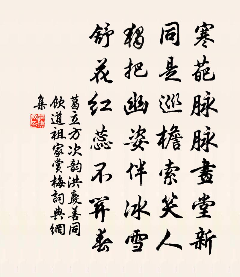 詩詞名句歷史字典書法欣賞書法字典國語詞典說文解字康熙字典古漢語字典標 題 作 者 詩 句 次韻洪慶善同飲道祖家賞梅作者:葛立方 朝代:宋代次韻洪慶善同飲道祖家賞梅原文寒葩脈脈畫堂新,同是巡檐索笑人。獨把幽姿伴冰雪,舒花紅蕊不關春。詩詞問答問:次韻洪慶善同飲道祖家賞梅的作者是誰?答:葛立方問:次韻洪慶善同飲道祖家賞梅寫於哪個朝代?答:宋代葛立方次韻洪慶善同飲道祖家賞梅書法欣賞次韻洪慶善同飲道祖家賞梅書法作品詩詞推薦句邵伯溫〔宋代〕霜後秋香千樹橘,雨余春色一川花。訴衷情(壽)晏殊〔宋代〕幕天席地斗豪奢。歌妓捧紅牙。從他醉醒醒醉,斜插滿頭花。車載酒,解貂貰。盡繁華。兒孫賢俊,家道榮昌,祝華下司空圖〔唐代〕日炙旱雲裂,迸為千道血。天地沸一鑊,竟自烹妖孽。堯湯遇災數,災數還中輟。何事奸與邪,古來難撲滅。和陳宰諸官登羅漢閣看草書經卷韻釋善珍〔宋代〕柳公遺蹟留芳扁,一度摩挲一嘆嗟。佛閣僧居如穴蟻,梵編蟲蠹失驚蛇。文占天上奎星聚,語到宵中斗柄斜。老衲自思益寺次楞伽寺作白居易〔唐代〕朝從思益峰游後,晚到楞伽寺歇時。照水姿容雖已老,上山筋力未全衰。行逢禪客多相問,坐倚漁舟一自思。猶去端午內中帖子詞皇帝閣王珪〔唐代〕采絲纏粽動嘉辰,浴殿風生畫扇輪。拂曉千門放金鑰,玉階還有謝衣人。不赴十姊初度之席陳淳〔宋代〕吾姊今朝度誕辰,奈何賤弟亦同倫。汝逢壽考榮雙老,我感劬勞悼昔人。贊祝欲陪千歲願,追思難遏寸心真。一懽橫山劉倓〔宋代〕大小萬竹望不見,上下牢岩過若飛。紅綴舞衣山躑躅,白裁玉版野薔薇。梅根夾范成大〔宋代〕辛苦淩波棹,平安入夾船。日明漁浦綱,風側瓦窯煙。老圃容挑菜,村巫橫索錢。且投人處宿,終夜得佳眠。寄趙及父華岳〔宋代〕欲邀詩社同蓮社,為築將壇並杏壇。圖得有材皆命世,不隨風月報平安。送江子我歸嚴陵張元乾〔宋代〕久客驚秋晚,懷歸更送君。亂來俱避地,老去惜雜群。山閣杯浮菊,江城雁度雲。行行經釣瀨,時事不須聞。元豐行示德逢王安石〔宋代〕四山翛翛映赤日,田背坼如龜兆出。湖陰先生坐草室,看踏溝車望秋實。雷蟠電掣雲滔滔,夜半載雨輸亭皋。旱禾寄圓長老釋智圓〔宋代〕澹慮棲幽境,閒將水石鄰。信衣傳往祖。禪語示來人。晚屋茶煙細,晴軒岳翠勻。相懷獨南望,林木又經春。本意(癸丑三月十九日,用明楊孟載韻)陳維崧〔清代〕中酒心情,拆棉時節,瞢騰剛送春歸。一畝池塘,綠蔭濃觸簾衣。柳花攪碎晴暉,更畫梁玉剪交飛。販茶船重,挑自傷陸游〔宋代〕朝雨暮雨梅子黃,東家西家鬻蘭香。白頭老鰥哭空堂,不獨悼死亦自傷。齒如敗屐鬢如霜,計此光景寧久長?扶杖後峒月溪寺李昴英〔宋代〕森森杉檜郁相繆,散策何妨逐勝游。梵宇莊嚴傳浙樣,碧池蕩漾納泉流。將軍贏得山林在,衲子多因粥飯留。眼界書懷羅隱〔唐代〕釣船拋卻異鄉來,擬向何門用不才。日晚獨登樓上望,馬蹄車轍滿塵埃。游黃山次韻程元岳〔宋代〕謾宿林間夜對床,鍾魚衍度幾星霜。月高花影頻開畫,鳳動松聲自鼓簧。人事縣知春日好,禪心不作少年狂。重來丫頭岩方岳〔宋代〕君不見新寺磯,女兒浦,小姑嫁與彭郎去。天開地辟本何心,以邪見我成疑誤。風煙高並雙丫石,舊已知名今始識和菜花二首陳普〔宋代〕華實根荄若個般,深知始解識鹹酸。爭春豈敢當紅紫,貼地何能助碧丹。未說餘膏尤濟用,最令中色真堪餐。洛陽名句推薦天時人事日相催,冬至陽生春又來。杜甫《小至》 謀先事則昌,事先謀則亡。劉向《說苑·談叢》 公子王孫逐後塵,綠珠垂淚滴羅巾。崔郊《贈去婢》 已知泉路近,欲別故鄉難。夏完淳《別雲間》 蜂須輕惹百花心,蕙風蘭思寄清琴。薛昭蘊《浣溪沙·握手河橋柳似金》 但使龍城飛將在,不教胡馬度陰山。王昌齡《出塞二首》 賈傳自憐多感慨,東門何意泥孤虛。王惲《送姬仲實隱士北還》 是節東籬菊,紛披為誰秀。杜甫《九日寄岑參》 弟子入則孝,出則弟,謹而信,泛愛眾,而親仁,行有餘力,則以學文。孔子弟子《論語·學而篇》 誰料同心結不成,翻就相思結。夏完淳《卜運算元·秋色到空閨》