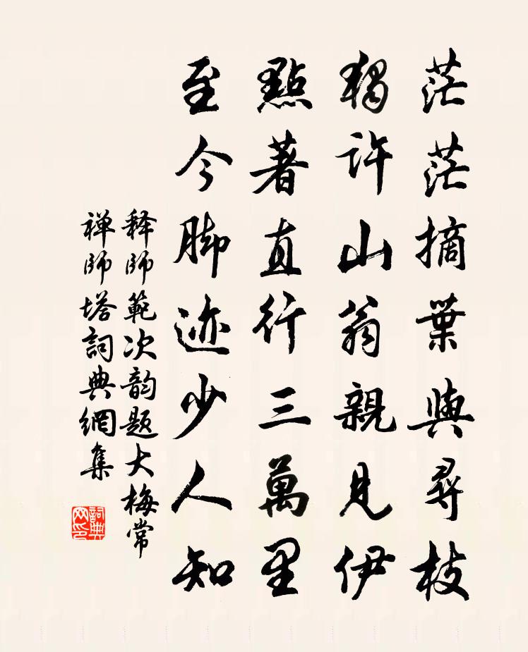 詩詞名句歷史字典書法欣賞書法字典國語詞典說文解字康熙字典古漢語字典標 題 作 者 詩 句 次韻題大梅常禪師塔作者:釋師範 朝代:宋代次韻題大梅常禪師塔原文茫茫摘葉與尋枝,獨許山翁親見伊。點著直行三萬里,至今腳跡少人知。詩詞問答問:次韻題大梅常禪師塔的作者是誰?答:釋師範問:次韻題大梅常禪師塔寫於哪個朝代?答:宋代釋師範次韻題大梅常禪師塔書法欣賞次韻題大梅常禪師塔書法作品詩詞推薦蝶戀花(贈丁爽、丁旦及第)王庭珪〔宋代〕桂樹新生都幾許。兄弟騎龍,雙入蟾宮去。一日兩枝同折處。姮娥拍手都分與。楊柳江頭春色暮。白馬青衫,兩郡奉和子龍大監與舍弟贈答之什徐鉉〔唐代〕石渠東觀兩優賢,明主知臣豈偶然。鵷鷺分行皆接武,金蘭同好共忘年。懷恩未遂林泉約,竊位空慚組綬懸。多少題華亭尉廳梅館李洪〔宋代〕古梅瘦竹助蕭疏,剪薙蒿蓬亦甚都。報政未容須五月,卻尋疏影向西湖。和陶命子韻示津調官吳芾〔宋代〕我不望汝,勳業濟時。縱得入侍,朝夕論思。欲供子職,何如在茲。人能盡孝,忠豈遠而。送李崧才歸閩二首張栻〔宋代〕公事妨開卷,遐征念索居。能來數月款,端為百憂紓。師友洛川上,人才元佑初。歸來有新益,不惜幾行書。惜黃花(重陽)史浩〔宋代〕秋光將老。黃花開早。露浥清曉,金錢萬疊猶小。簪遍碧雲鬟,壓倒烏紗帽。更把來、玉觴同釂。過□添爐鼎,朱別崔少府高適〔唐代〕知府少得意,汶上掩柴扉。寒食仍留火,春風未授衣。皆言黃綬屈,早向青雲飛。借問他鄉事,今年歸不歸。清平樂·風光緊急朱淑真〔宋代〕風光緊急。三月俄三十。擬欲留連計無及。綠野煙愁露泣。倩誰寄語春宵。城頭畫鼓輕敲。繾綣臨歧囑付,來年早僕射陂晚望羅鄴〔唐代〕離人到此倍堪傷,陂水蘆花似故鄉。身事未知何日了,馬蹄唯覺到秋忙。田園牢落東歸晚,道路辛勤北去長。卻羨鹹淳夏五求王先生墨戲梅竹二首梅金履祥〔宋代〕溽暑初蒸日正長,人間何處有清涼。先生筆下風威勁,便放寒梅次第香。會合聯句韓愈〔唐代〕離別言無期,會合意彌重。 ——張籍病添兒女戀,老喪丈夫勇。 ——韓愈劍心知未死,詩思猶孤聳。 ——孟踏雲行 師父贈譚仙詞曰,張公吃酒李公來,馬鈺〔元代〕豁豁洋洋,詳詳審審。仙家出語何須恁。山侗自揣一鰲,金鱗晃日如新錦。雲水逍遙,身心恣任。欲為上士相爭甚述懷釋行海〔宋代〕山郡人來水郡游,雁驚秋色向南州。日長意懶無消遣,醉劈芙蓉付水流。安溪勸農詩勸息訟陳宓〔宋代〕田無所入最為艱,終歲辛勤不得閒。勸爾小爭須隱忍,破家只在片時間。劉九法曹鄭瑕邱石門宴集杜甫〔唐代〕秋水清無底,蕭然靜客心。椽曹乘逸興,鞍馬到荒林。能吏逢聊璧,華筵直一金。晚來橫吹好,泓下亦龍吟。和元員外題昇平里新齋楊巨源〔唐代〕自知休沐諸幽勝,遂肯高齋枕廣衢。舊地已開新玉圃,春山仍展綠雲圖。心源邀得閒詩證,肺氣宜將慢酒扶。此外送陸拾遺東歸許渾〔唐代〕獨振儒風遇盛時,紫泥初降世人知。文章報主非無意,書劍還家素有期。秋寺臥雲移棹晚,暮江乘月落帆遲。東歸思故山陸游〔宋代〕千金不須買畫圖,聽我長歌歌鏡湖。湖山奇麗說不盡,且復為子陳吾廬。柳姑廟前魚作市,道士莊畔菱為租。一彎白溝劉因〔元代〕寶符藏山自可攻,兒孫誰是出群雄。幽燕不照中天月,豐沛空歌海內風。趙普元無四方誌,澶淵堪笑百年功。白溝延華觀陳岩〔宋代〕五百年間岸谷移,邯鄲枕上夢回時。兔葵燕麥玄都觀,好繼劉郎舊日詩。名句推薦死之能受,痛之難忍,刑人取其不堪。來俊臣《羅織經·刑罰卷第十一》 晚來風起花如雪,飛入宮牆不見人。劉禹錫《楊柳枝詞九首》 台榭空濛煙柳暗,白鳥銜魚欲舞。納蘭性德《摸魚兒·午日雨眺》 安得五彩虹,駕天作長橋。李白《焦山望寥山》 無端聽畫角,枕畔紅冰薄。納蘭性德《菩薩蠻·朔風吹散三更雪》 千雷萬霆,激繞其身,霰雪雨雹,一時皆下。李朝威《柳毅傳》 惟順於父母,可以解憂。孟子《孟子·萬章章句上·第一節》 君子敬以直內,義以方外,敬義立而德不孤。佚名《易傳·文言傳·坤文言》 稻根科斗行如塊,田水今年一尺寬。范成大《夏日田園雜興》 賭勝馬蹄下,由來輕七尺。李頎《古意》