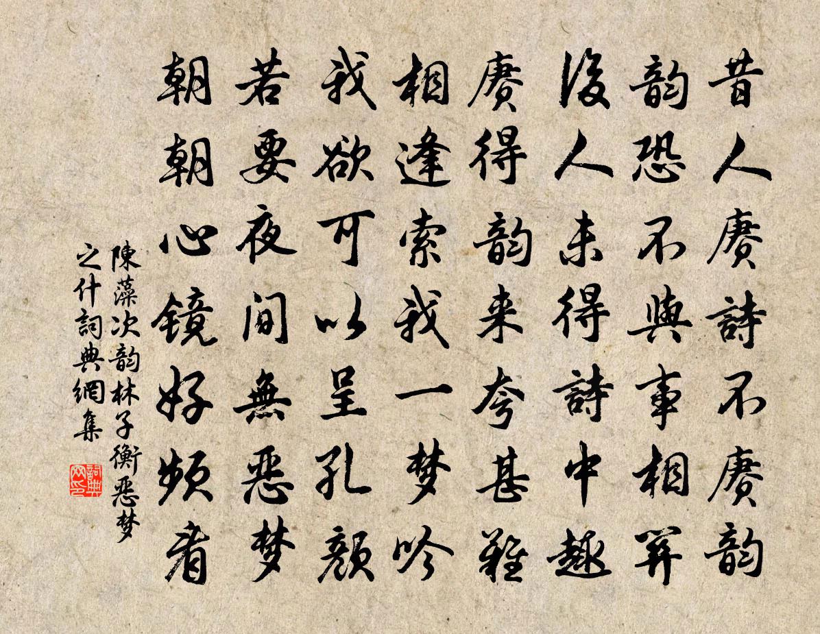 詩詞名句歷史字典書法欣賞書法字典國語詞典說文解字康熙字典古漢語字典標 題 作 者 詩 句 次韻林子衡惡夢之什作者:陳藻 朝代:宋代次韻林子衡惡夢之什原文昔人賡詩不賡韻,韻恐不與事相關。後人未得詩中趣,賡得韻來夸甚難。相逢索我一夢吟,我欲可以呈孔顏。若要夜間無惡夢,朝朝心鏡好頻看。詩詞問答問:次韻林子衡惡夢之什的作者是誰?答:陳藻問:次韻林子衡惡夢之什寫於哪個朝代?答:宋代陳藻次韻林子衡惡夢之什書法欣賞次韻林子衡惡夢之什書法作品詩詞推薦金溪道中陸游〔宋代〕雲闇苦竹市,雨來烏石岡。駕犁雙犢健,(苘口換加)繭一村香。天地君恩重,風埃吏責忙。敢辭坡路滑,且領筍再次前韻(系織錦圖上回文)蘇軾〔宋代〕春機滿織迴文錦,粉淚揮殘露井桐。人遠寄情書字小,柳絲低目晚庭空。紅箋短寫空深恨,錦句新翻欲斷腸。風葉客至陸游〔宋代〕官閒身自得,客至眼殊明。靜算棋生死,閒分酒濁清。悠然劇談罷,偶爾小詩成。但恨桑麻事,無人與共評。感懷宋祁〔宋代〕夕風搜前林,墜葉快如剪。老月扣戶低,傾河去人遠。吉士感物化,勞勞意不展。輟飲屏樽杓,留釭討墳典。觸事春日村居章甫〔宋代〕土室宜冬夏,柴門玩歲時。不嫌貧作祟,直恐老相欺。草茁牛羊壯,山空虎豹飢。天晴好挑菜,吾亦伴兒嬉。醉蓬萊(燈前想像勝集,和韻)李曾伯〔宋代〕問前身應在,香醉山中,今存風烈。佳夕招延,清論度飛屑。玉斝盈盈,金英點點,標格儂家別。好個涼天,更無三用韻奉酬楊公遠〔宋代〕不是騷人不是農,筆耕墨耒原年豐。有時啜罷盧仝茗,羽羽能生兩腋風。晚次東亭獻鄭州宋使君文儲光羲〔唐代〕自初賓上國,乃到鄒人鄉。曾點與曾子,俱升闕里堂。武皇恢大略,逸翮思寥廓。三居清憲台,兩拜文昌閣。為道系裙腰歐陽修〔宋代〕水軒檐幕透薰風。銀塘外、柳煙濃。方床遍展魚鱗簟,碧紗籠。小墀面、對芙蓉。玉人共處霜鴛枕,和嬌困、睡朦奉和魯望樵人十詠樵家皮日休〔唐代〕空山最深處,太古兩三家。雲蘿共夙世,猿鳥同生涯。衣服濯春泉,盤餐烹野花。居茲老復老,不解嘆年華。送張君玉赴寧江幕府七首晁公溯〔宋代〕子去夔州頗自矜,舉杯大叫氣憑陵。新詩硤內流傳滿,今有高人王右丞。巫山一段雲馬鈺〔元代〕休要呼師叔,相看若弟兄。煉心雲補玉京城。何必謁公卿。因撫心琴益壽。謂飲刀圭戒酒。瑤台上面放瓊花。同去臨江仙王之望〔宋代〕霓作衣裳冰作面,鉛華不涴天真。臨風幾待逐行雲。自從留得住,不肯系仙裙。對客揮毫驚滿座,銀鉤蠆尾爭新。得故人書偶題陸游〔宋代〕小築稽山下,狂歌剡曲傍。鄉鄰共雞黍,童稚學農桑。白首餘年促,青編後日長。此心誰復許,三嘆付書囊。高平縣東私路李賀〔唐代〕侵侵槲葉相,木花滯寒雨。今夕山上秋,永謝無人處。石溪遠荒澀,棠實懸辛苦。古者定幽尋,呼君作私路。榆河曉發謝榛〔明代〕朝暉開眾山,遙見居庸關。雲出三邊外,風生萬馬間。征塵何日靜,古戍幾人閒。忽憶棄繻者,空慚旅鬢斑。借虛谷太博狂吟十詩韻書懷並呈太博楊公遠〔宋代〕竹馬才拋又是翁,年來自覺轉疎慵。欲開竹下三三逕,還借毫端六六峰。處世竟無非理事,對人那有可慚容。浮沈定王台戴復古〔宋代〕長沙米換長安土,築此崔嵬寄遠觀。客子登台千載後,倚欄亦欲望長安。點絳唇(和張文伯)王之道〔宋代〕宿雨朝寒,芳時又過酴醿了。舞環歌繞。應恨金杯小。零亂霜蕤,點綴青青草。花間道。曾遭花惱。把酒呼晴昊。桂州陪王都督晦日宴逍遙樓宋之問〔唐代〕晦節高樓望,山川一半春。意隨蓂葉盡,愁共柳條新。投刺登龍日,開懷納鳥晨。兀然心似醉,不覺有吾身。名句推薦可憐青冢已蕪沒,尚有哀弦留至今。王安石《明妃曲二首》 槲葉落山路,枳花明驛牆。溫庭筠《商山早行》 此心隨去馬,迢遞過千峰。方乾《送從兄郜 / 韋郜 / 途中別孫璐》 何處可為別,長安青綺門。李白《送裴十八圖南歸嵩山二首》 野橋梅幾樹,並是白紛紛。洪升《雪望》 菩薩應如是布施。不住於相。鳩摩羅什譯《金剛經·妙行無住》 落盡梨花春又了。滿地殘陽,翠色和煙老。梅堯臣《蘇幕遮·草》 以權利合者,權利盡而交疏。司馬遷《史記·鄭世家》 水調數聲持酒聽。午醉醒來愁未醒。張先《天仙子·水調數聲持酒聽》 馬駭輿,則君子不安輿;庶人駭政,則君子不安位。荀子《荀子·王制》