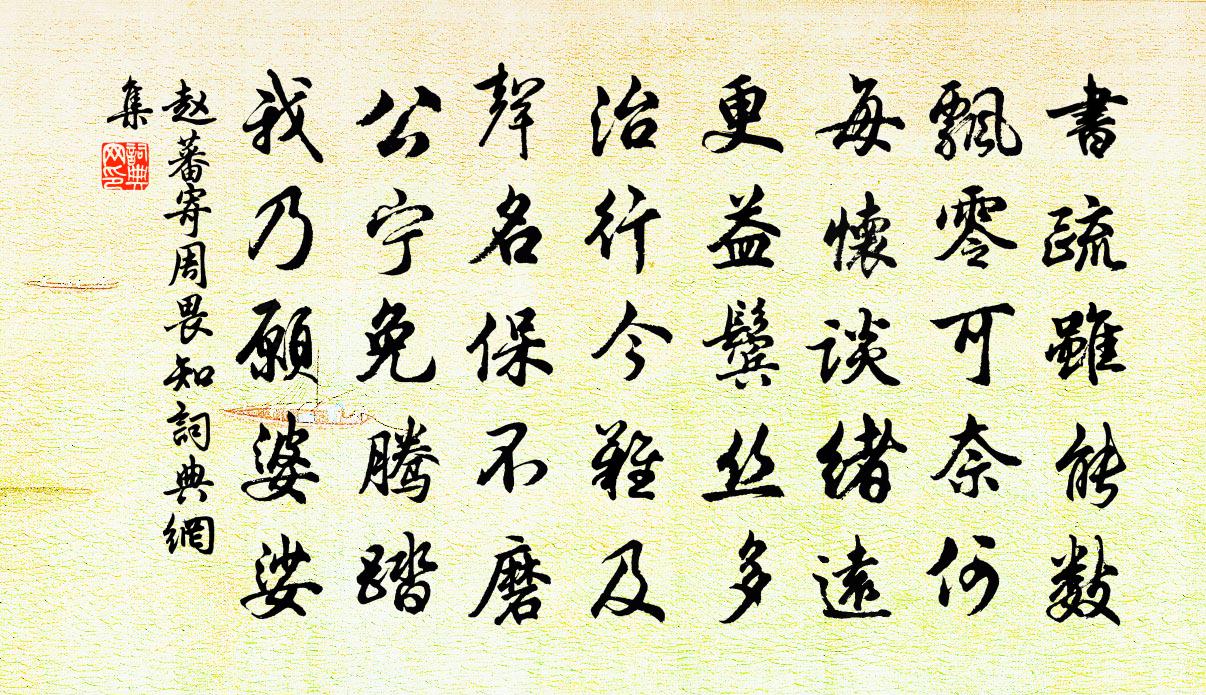 詩詞名句歷史字典書法欣賞書法字典國語詞典說文解字康熙字典古漢語字典標 題 作 者 詩 句 寄周畏知作者:趙蕃 朝代:宋代寄周畏知原文書疏雖能數,飄零可奈何。每懷談緒遠,更益鬢絲多。治行今難及,聲名保不磨。公寧免騰踏,我乃願婆娑。詩詞問答問:寄周畏知的作者是誰?答:趙蕃問:寄周畏知寫於哪個朝代?答:宋代趙蕃寄周畏知書法欣賞寄周畏知書法作品詩詞推薦次韻和德麟過希道作晁說之〔宋代〕笠澤人閒書已叢,分甘寂寞與誰同。故人相遇白頭日,往事獨悲黃葉風。去國貴游驚灞岸,浮家公子樂湘中。此情韓琦大度佚名〔〕韓魏公在大名日,有人獻玉盞二隻,雲耕者入壞冢而得,表里無纖瑕可指,真絕寶也。公以百金答之,尤為寶玩。新秋洪邁〔宋代〕幽人無與娛,耳冷百不聞。新米熟未知,但覺市酒醇。滄洲散秋色,山水逾清新。一醉不忍獨,念我存故人。嘲父陸子〔唐代〕陸餘慶,筆頭無力觜頭硬。一朝受辭訟,十日判不竟。郡中即事三首(一作《寄裴校書》)羊士諤〔唐代〕登臨何事見瓊枝,白露黃花自繞籬。惟有樓中好山色,稻畦殘水入秋池。周祀圜丘歌 皇夏庾信〔南北朝〕國命在禮。君命在天。陳誠惟肅。飲福惟虔。洽斯百禮。福以千年。鉤陳掩映。天駟徘徊。雕禾飾斝。翠羽承罍。奉送韋起居老舅百日假滿歸嵩陽舊居權德輿〔唐代〕威鳳翔紫氣,孤雲出寥天。奇采與幽姿,縹緲皆自然。嘗聞陶唐氏,亦有巢由全。以此聳風俗,豈必效羈牽。大君次韻和度支蘇員外覆考進士文卷鎖宿景福殿宋庠〔宋代〕秘邃嚴廬斗極傍,知君此夕較連章。天移宿幕鄰堯屋,霞灩仙杯雜嵰霜。坐覺銅籤隨漏箭,臥驚銀漢入宮牆。精心偈頌八十七首釋慧開〔宋代〕三教聖人,同歸一理,說理長則。理短則止。虛空無心,牆壁有耳。不涉言詮,單提直指。口縫纏開,不是不是。次令衿游玉壺高詠十絕憑欄看花席羲叟〔宋代〕湖光空闊水天秋,翠蓋紅衣永日留。惟有詩情磨不盡,碧雲吟就喜湯休。王母贈壽圖唐寅〔明代〕蓬萊弱水三千里,王母蝠桃一萬年。鳳鳥自歌鸞自舞,直教銜到壽尊前。聞琴孫氏〔唐代〕玉指朱弦軋復清,湘妃愁怨最難聽。初疑颯颯涼風勁,又似蕭蕭暮雨零。近比流泉來碧嶂,遠如玄鶴下青冥。夜深宿秦生山齋溫庭筠〔唐代〕衡巫路不同,結室在東峰。歲晚得支遁,夜寒逢戴顒。龕燈落葉寺,山雪隔林鐘。行解無由發,曹溪欲施舂。卜居高翥〔宋代〕結屋離黃道,開門對白沙。一莊千古月,三徑四時花。客至旋沽酒,身閒自煮茶。相聞蟲鳥外,不復聽喧譁。紹興十三年發皇后冊寶十三首佚名〔宋代〕款承祗事,時惟肅雍。跪奉冊炷,陳於法宮。以俯以仰,有德有容。明神介之,福祿來崇。紹興親享明堂二十六首佚名〔宋代〕推尊太元,重屋為盛。誰其配之,我祖齊望。開基握符,正位凝命。於萬斯年,孝孫有慶。酷暑葉茵〔宋代〕動息汗流珠,無風可滌除。炎威獄下吏,生意鼎中魚。席地捧冰水,扃門謝客車。因思遊宦者,曾未憶家居。贈吳氏甥二首袁燮〔宋代〕男兒何所急,為學要立志。此志苟堅強,天下無難事。超然貴於物,萬善無不備。厥初本高明,有過則昏蔽。但能以潞公所惠揀芽送公擇次舊韻黃庭堅〔宋代〕慶雲十六升龍樣,國老元年密賜來。披拂龍紋射牛斗,外家英鑒似張雷。再過黃州蘇子瞻東坡雪堂因書即事題於武昌王張舜民〔宋代〕欹帆側柂嶺邊歸,重過東坡叩竹扉。床坐凝塵風自掃,江山無主燕空飛。門前桃李添新逕,井畔梧桐長舊圍。好在名句推薦蝸角虛名,蠅頭微利,算來著甚乾忙。蘇軾《滿庭芳·蝸角虛名》 志足而言文,情信而辭巧劉勰《文心雕龍·徵聖》 莫辭酒味薄,黍地無人耕。杜甫《羌村三首·其三》 稚子金盆脫曉冰,彩絲穿取當銀鉦。楊萬里《稚子弄冰》 柳下繫舟猶未穩,能幾日、又中秋。劉過《唐多令·蘆葉滿汀洲》 瑕不掩瑜、瑜不掩瑕戴聖《禮記·聘義》 家有千口,主事一人。佚名《增廣賢文·下集》 不及夜台塵土隔,冷清清、一片埋愁地納蘭性德《金縷曲·亡婦忌日有感》 群雞正亂叫,客至雞鬥爭。杜甫《羌村三首·其三》 長記別伊時,和淚出門相送。李存勖《如夢令·曾宴桃源深洞》
