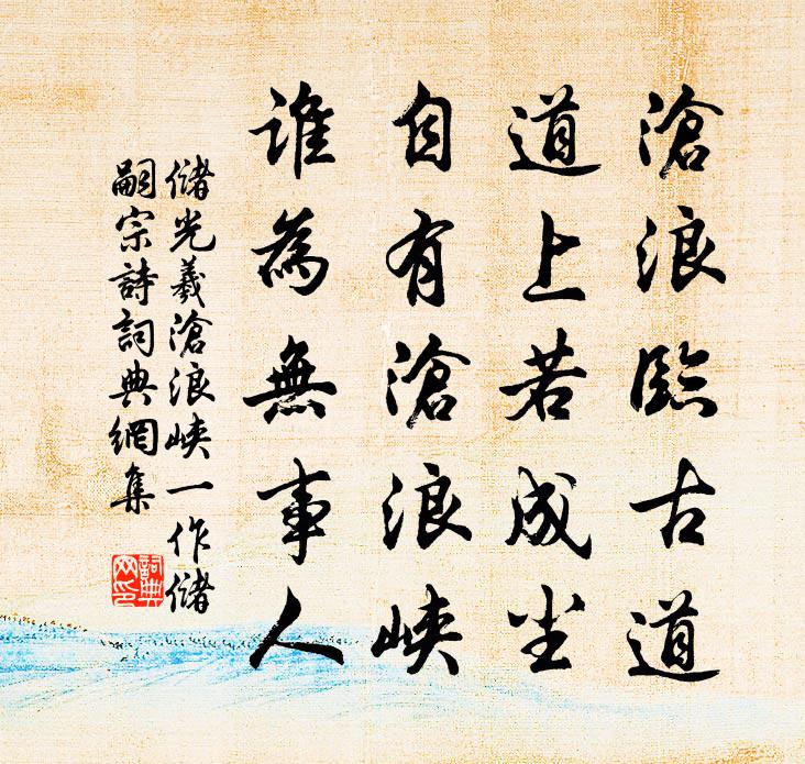 詩詞名句歷史字典書法欣賞書法字典國語詞典說文解字康熙字典古漢語字典標 題 作 者 詩 句 滄浪峽(一作儲嗣宗詩)作者:儲光羲 朝代:唐代滄浪峽(一作儲嗣宗詩)原文滄浪臨古道,道上若成塵。自有滄浪峽,誰為無事人。詩詞問答問:滄浪峽(一作儲嗣宗詩)的作者是誰?答:儲光羲問:滄浪峽(一作儲嗣宗詩)寫於哪個朝代?答:唐代儲光羲滄浪峽(一作儲嗣宗詩)書法欣賞滄浪峽(一作儲嗣宗詩)書法作品注釋全唐詩:卷139_48詩詞推薦山中夜坐寄故里友生李鹹用〔唐代〕展轉檐前睡不成,一床山月竹風清。蟲聲促促催鄉夢,桂影高高掛旅情。禍福既能知倚伏,行藏爭不要分明。可憐次韻關令送魚蘇軾〔宋代〕舉綱驚呼得巨魚,饞涎不易忍流酥。更煩赤腳長須老,來趁西風十幅蒲。自笑釋紹嵩〔宋代〕自笑從來癖,平生斷在詩。鳧鷖共容與,魂夢亦清奇。古調俗不樂,衰容鏡每知。機心吾豈有,休把運行推。夫人閣四首蘇軾〔宋代〕五彩縈筒秫稻香,千門結艾鬢髯張。旋開寶典尋風物,要及靈辰共祓禳。閒居十首陳造〔宋代〕桃李爭先不待催,梅花轉首已青苔。即今蜀種胭脂樹,壓倒群芳尚懶開。戌溪道中樓鑰〔宋代〕寒潮高於埭,黃流濯西河。人牛力俱壯,相與沖流過。潮落勢叵御,轉樛依丘阿。暮靄起平楚,陰雲翳寒莎。夜分春草碧 南金契兄始託交時,與仆俱未弱冠,邵亨貞〔元代〕世故牽掣,迨今未遂。兵後避地溪濱,復得旦暮握手,慨前跡之昀陳,預後期之可擬,不能已於言也。敬借前韻,病中曉思陸龜蒙〔唐代〕月墮霜西竹井寒,轆轤絲凍下瓶難。幽人病久渾成渴,愁見龍書一鼎乾。獅兒詞 賦梅和仇山村韻凌雲翰〔元代〕蹇驢破帽,知是幾度尋春,山南山北。惆悵亭荒仙遠,苔枝空綠。村*正熟。為花醉、何妨留宿。春光似怕人冷落秋日入無量院高翥〔宋代〕僧閒甘寂寞,寺古絕紛華。鳥摘過牆棗,猿爭守樹樝。雨多溪沒井,藤老蔓緣笆。莫坐庭前石,怕傷苔蘚花。十月四日,同子文,克信,子潛,子直,材翁楊萬里〔宋代〕誠齋老子不柰靜,偶拄烏藤出苔徑。獨游無伴卻成愁,群從同行還起興。每過一家添一人,須臾保社如煙雲。褰裳白髮嘆楊萬里〔宋代〕素絲久即黑,黑鬢久即絲。絲黑有涴法,鬢絲無染期。日月有底忙,晝夜馳向西。江漢與之友,卻向東方馳。江漢聞少華崩邵雍〔宋代〕熙寧壬子歲,少華忽然崩。七社民俱死,九泉神不寧。昔天無駭,曠古未之聆。燮理陰陽者,如何略不驚。相和歌辭婕妤怨皇甫冉〔唐代〕由來詠團扇,今已值秋風。事逐時皆往,恩無日再中。早鴻聞上苑,寒露下深宮。顏色年年謝,相如賦豈工。丁亥正月新晴晚步二首楊萬里〔宋代〕急下柴車蹈晚晴,青鞋步步有沙聲。忽逢野沼無人處,兩鴨浮沉最眼明。句諶祜〔宋代〕樹帶夕陽雅半集,萑寒秋浦雁初來。偈頌二十三首釋雲岫〔宋代〕東村王老夜燒錢,保當新年勝舊年。三珓俱通三扣齒,太平無事樂平平。十六夜待月溪濱風露浩然宵中不寐李洪〔宋代〕昨夜中秋月,高唐妒素娥。憑誰修玉戶,未覺減金波。練淨前溪水,銀侵左界河。浩然風露爽,通夕祗長喔。明堂慶成詩文天祥〔宋代〕曉移天仗入思成,雨腳先驅御路清。虹影倒垂雲氣卷,日輪飛上袞衣明。韶音九奏真游格,酌獻三行福酒頃。景命揠苗助長佚名〔先秦〕宋人有閔其苗之不長而揠之者,芒芒然歸,謂其人曰:“今日病矣!予助苗長矣!”其子趨而往視之,苗則槁矣。名句推薦曲徑穿花尋蛺蝶,虛闌傍日教鸚鵡。岳珂《滿江紅·小院深深》 明月樓高休獨倚。酒入愁腸,化作相思淚。范仲淹《蘇幕遮·懷舊》 三日入廚下,洗手作羹湯。王建《新嫁娘詞三首》 饒人不是痴漢,痴漢不會饒人。佚名《增廣賢文·上集》 兒童強不睡,相守夜歡嘩。蘇軾《守歲》 菩提本無樹,明鏡亦非台。惠能《菩提偈》 天涯海角悲涼地,記得當年全盛時。趙鼎《鷓鴣天·建康上元作》 將之器,其用大小不同。諸葛亮《將苑·卷一·將器》 此情可待成追憶?只是當時已惘然。李商隱《錦瑟》 巧言令色,鮮矣仁。孔子弟子《論語·學而篇》
