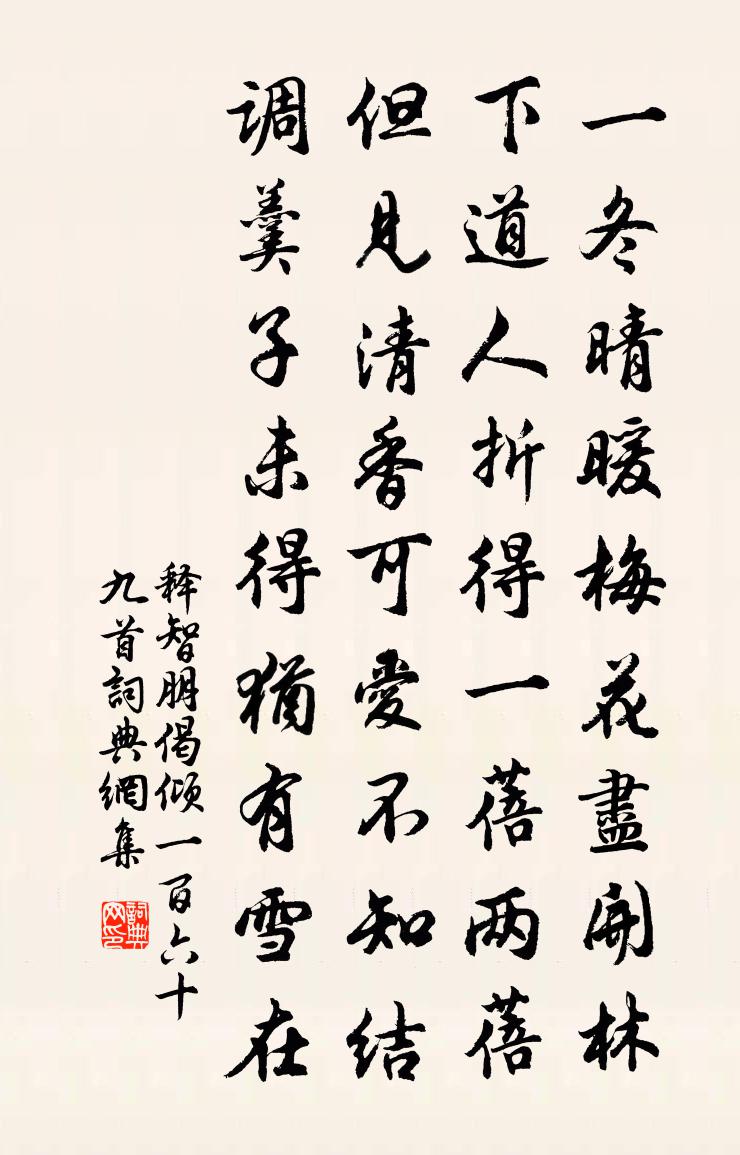 詩詞名句歷史字典書法欣賞書法字典國語詞典說文解字康熙字典古漢語字典標 題 作 者 詩 句 偈傾一百六十九首作者:釋智朋 朝代:宋代偈傾一百六十九首原文一冬晴暖,梅花盡開。林下道人,折得一蓓兩蓓。但見清香可愛,不知結調羹子未得,猶有雪在。詩詞問答問:偈傾一百六十九首的作者是誰?答:釋智朋問:偈傾一百六十九首寫於哪個朝代?答:宋代釋智朋偈傾一百六十九首書法欣賞偈傾一百六十九首書法作品詩詞推薦燒丹示道流陸游〔宋代〕昔燒大藥青牛谷,磊落玉床收箭鏃。扶桑朝暾謹火候,仙掌秋露勤沐浴。帶間小瓢鬼神衛,異氣如虹夜穿屋。點成思夔州陸游〔宋代〕老來百念盡消磨,無奈雲安入夢何!壯憶公孫劍器舞,愁思賓客竹枝歌。次花翁自笑韻杜范〔宋代〕村翁活計謝田莊,肯與時人較短長。餘事詩篇陵鮑謝,太平胸次到黃唐。以通為隱渾無礙,有樂償貧似略當。自笑送黃欽之赴廣州鹽稅三首陳藻〔宋代〕一族名家叔度孫,同時入嶺五華軒。使台帥閫終須到,官職高低且暫論。寄於忠父先生袁說友〔宋代〕詩來已報平安好,猶恨得公詩不早。忽聞單舸下滄浪,卻喜此翁元未老。折腰耐辱來皇州,大手妙割無雞牛。平生偈頌六十五首釋普濟〔宋代〕冬到喪後,沙飛石走。佛祖潛蹤,寸鐵在手。入講論語二首徐元傑〔宋代〕躬承清問及年豐,蠶麥今還與舊同。稼穡艱難周聖慮,農桑勸課即田功。志民深閔僖公雨,勤業猶存豳國風。懇懇秋懷十首陳師道〔宋代〕籊籊孤竹君,長我一身半。凜然霜雪間,時至亦陰換。共與王子猷,永結忘言伴。可使溪壑姿,充我眼中玩。寄歸宗華倒禪師釋宗杲〔宋代〕坐斷金輪第一峰,千妖百怪自潛蹤。年來又得真訊息,說道楊岐正脈通。雨中趙蕃〔宋代〕四月梅黃雨易成,夜來猶是十分晴。吳山越嶺渾遮盡,惟見江流面面平。【雙調】水仙子 鍾離佚名〔元代〕超凡入聖漢鍾離,沉醉誰扶下玉梯。扇圈一部鬍鬚力,絳雲般紅肉皮。做伴的是茶藥琴棋。頭綰著雙髻,身穿著瞿唐峽陽枋〔宋代〕壁絕書昏明,猿 * 佛音。不關天宇窄,自是峽流深。既曉遲朝日,未西還夕陽。扁中舟涉險,憑取有孚心。舟中吳錫疇〔宋代〕一笑起推篷,煙雲望眼中。櫓鳴無調樂,帆飽有情風。山近水偏綠,鵑啼花正紅。前途足奇觀,行色莫匆匆。先醉元稹〔唐代〕今日樽前敗飲名,三杯未盡不能傾。怪來花下長先醉,半是春風盪酒情。雨中別同朝諸公陸游〔宋代〕今日別交舊,街泥盈尺深。極知當作惡,追恨闕相尋。笑語關幽夢,江山入苦吟。新秋才一月,留句待清砧。昭君怨佚名〔宋代〕坐後談禪說道。起後不依些少。心口自尋思。好呆痴。目用機關千萬。何曾滅了一件。欲望做神仙。好難天。龜堂東窗戲弄筆墨偶得絕句陸游〔宋代〕老衰有驗詩先退,勳業無心夢漸稀。淺浦小山孤絕處,數家煙火自相依。雜興張鎡〔宋代〕文仲蔽展禽,難逃竊位名。張湯法家流,推賢被嘉聲。公道日月如,無私天下行。治古本根此,所以休甲兵。嗟嗟偈頌四十一首釋普寧〔宋代〕我此門風,孤危不立。若是臨濟兒孫,便請單刀直入。二月三日艤舟徐城戲呈戚郎張耒〔宋代〕自嗟為客久,羇旅過淮時。雪野挑蔬瘦,霜天暖酒遲。流年下坡轂,萬事一枰棋。異日懷陳跡,孤舟近古祠。名句推薦戍鼓斷人行,邊秋一雁聲。杜甫《月夜憶舍弟》 黃河落天走東海,萬里寫入胸懷間。李白《贈裴十四》 天有陰陽風雨晦明之氣,人有喜怒哀 樂好惡之情。魏徵《隋書·志·卷二十九》 竹邊荷外再相逢,又還是、浮雲飛去。趙以夫《鵲橋仙·富沙七夕為友人賦》 轉禍而為福,因敗而為功。劉向《戰國策·燕一·燕文公時》 愁絕行人天易暮,行向鷓鴣聲里住納蘭性德《菊花新·用韻送張見陽令江華》 邂逅淇南,歲寒獨在,故人襟抱。王惲《水龍吟·送焦和之赴西夏行省》 五嶽尋仙不辭遠,一生好入名山游。李白《廬山謠寄盧侍御虛舟》 才過斜陽,又是黃昏雨。晏幾道《蝶戀花·笑艷秋蓮生綠浦》 言之易,行之難呂不韋《呂氏春秋·論·不苟論》