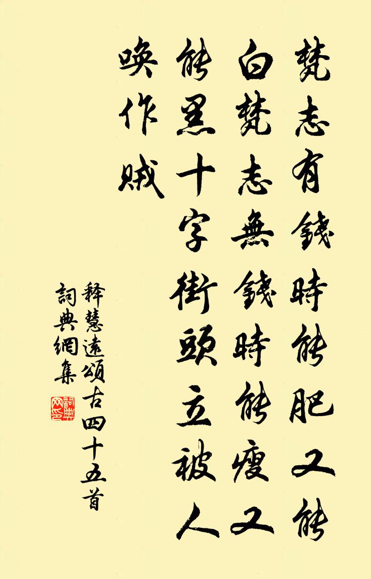 詩詞名句歷史字典書法欣賞書法字典國語詞典說文解字康熙字典古漢語字典標 題 作 者 詩 句 頌古四十五首作者:釋慧遠 朝代:宋代頌古四十五首原文梵志有錢時,能肥又能白。梵志無錢時,能瘦又能黑。十字街頭立,被人喚作賊。詩詞問答問:頌古四十五首的作者是誰?答:釋慧遠問:頌古四十五首寫於哪個朝代?答:宋代釋慧遠頌古四十五首書法欣賞頌古四十五首書法作品詩詞推薦朝中措(安人生日·三之一)張綱〔宋代〕年時生日宴高堂。歡笑擁爐香。今日山前停棹,也須隨分飛觴。東陽太守,攜家遠去,方溯桐江。把酒祝君長健,卜運算元(曹守生朝十二月初六日)劉克莊〔宋代〕東圳寧馨兒,南國循良守。先把爐熏祝帝堯,次祝君侯壽。廣致米商船,多釀兵廚酒。客有鬚眉似蓋延,許至華堂驀山溪晁端禮〔宋代〕輕衫短帽,重入長安道。屈指十年中,一回來、一回漸老。朋游在否,落托更能無,朱弦悄。知音少。撥斷相思調題常樂寺唐求〔唐代〕桂冷香聞十裡間,殿台渾不似人寰。日斜回首江頭望,一片晴雲落後山。次龍吟寺壁間韻趙汝育〔宋代〕解鞍游古寺,夕照滿疎林。雨過山如畫,風生竹解吟。龍眠秋水靜,豹隱暮雲深。喚醒遊仙夢,數聲何處碪。陳寺丞輓詩魏了翁〔宋代〕聖主搜賢詔,愚臣薦士書。高岡看治鳳,靈治蟄潛魚。時數自信{左言右出},帝心誰戚疏。臧倉徒擾擾,窮達不句种放〔宋代〕胡雛負恩信,聖主恥干戈。紹興以後蜡祭四十二首佚名〔宋代〕歌磬臚驩,蒙蕭激香。飈御奄留,申以貳鐵。相興震澹,告靈其醉。庶幾聽之,成我熙事。偶詠不才明主棄多病故人疏之句感孟浩然事作趙蕃〔宋代〕吾評孟浩然,雅意作詩人。死經四百載,賦詩名愈新。爵祿豈不賞,不義寧賤貧。身雖遭放還,未必非得亡。菩薩蠻·枕前發盡千般佚名〔五代〕枕前發盡千般願,要休且待青山爛。水面上秤錘浮,直待黃河徹底枯。白日參辰現,北斗回南面。休即未能休,且長安仲春二首張耒〔宋代〕長安仲春七日風,蒼茫頓撼天地同。應門縹闕岌欲動,況我窮巷連蒿蓬。暮寒卷雪連芳草,平門萬屋青城縞。無言永嘉張仲思相士過訪坐間索詩張鎡〔宋代〕便靜非形色,相逢子獨知。功名槐蟻話,文字壁魚痴。剩取朝賢譽,何須隱者詩。南湖鷗正狎,休誤鳳凰池。拍欄趙汝鐩〔宋代〕偶把欄乾拍,沙鷗水上驚。晚紅殘照在,秋碧遠山橫。盡被浮名役,皆從妄念生。不如歸去好,杖屨老柴荊。夏日夜憶張二駱賓王〔唐代〕伏枕憂思深,擁膝獨長吟。烹鯉無尺素,筌魚勞寸心。疏麻空有折,芳桂湛無斟。廣庭含夕氣,閒宇澹虛陰。織蟲送唐別駕赴郢州錢起〔唐代〕少年從事好,此去別愁輕。滿座詩人興,隨君郢路行。蒹葭侵驛樹,雲水抱山城。遙愛下車日,江皋春草生。秋思白玉蟾〔宋代〕滴盡池荷無奈雨,吹翻井葉可憐風。溪毛山骨猶無恙,尚有蘆花對蓼紅。和劉後村梅花百詠方蒙仲〔宋代〕夫人可共倚雕欄,折得橫枝獨自看。梅癖難醫君信否,東陽瘦損少陵酸。河朔吟范仲淹〔宋代〕太平燕趙許閒遊,三十從知壯士羞。敢話詩書為上將,猶憐仁義對諸侯。子房帷幄方無事,李牧耕桑合有秋。民得甲辰人日病中,吟六言六首以自嘲范成大〔宋代〕攢眉輒作山字,啾耳惟聞水聲。人應見憐久病,我亦自厭餘生。寒食寓懷梁顥〔宋代〕明日一百五,春風余幾何。愁隨新火出,病憶故人多。草色牆陰合。花香宿雨和。耿懷殊不寐,終夕扣壺歌。名句推薦天下無事,不可廢武佚名《百戰奇略·第十卷·忘戰》 送客自傷身易老,不知何處待先生。劉滄《贈道者》 樹樹皆秋色,山山唯落暉。王績《野望》 三十功名塵與土,八千里路雲和月。岳飛《滿江紅·寫懷》 瞻彼洛城郭,微子為哀傷。曹操《薤露行》 聽於無聲,視於無形。戴聖《禮記·曲禮上》 夜來南風起,小麥覆隴黃。白居易《觀刈麥》 況復煩促倦,激烈思時康。杜甫《夏夜嘆》 贈君明月滿前溪,直到西湖畔。毛滂《燭影搖紅·送會宗》 四邊伐鼓雪海涌,三軍大呼陰山動。岑參《輪台歌奉送封大夫出師西征》