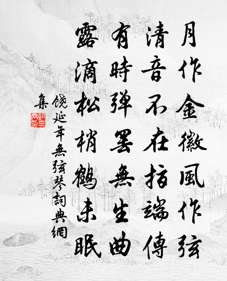 詩詞名句歷史字典書法欣賞書法字典國語詞典說文解字康熙字典古漢語字典標 題 作 者 詩 句 無弦琴作者:饒延年 朝代:宋代無弦琴原文月作金徽風作弦,清音不在指端傳。有時彈罷無生曲,露滴松梢鶴未眠。詩詞問答問:無弦琴的作者是誰?答:饒延年問:無弦琴寫於哪個朝代?答:宋代饒延年無弦琴書法欣賞無弦琴書法作品詩詞推薦五貺詩華頂杖皮日休〔唐代〕金庭仙樹枝,道客自攜持。探洞求丹粟,挑雲覓白芝。量泉將濯足,闌鶴把支頤。以此將為贈,惟君盡得知。閒居二首鄭獬〔宋代〕空庭羅雀網,應似翟侯居。多病惟尋藥,忘機不著書。僧來留石鼎,人在典金魚。惟有南窗睡,春來分不疏。武陵別文瑩上人張師正〔宋代〕碧嶂孤雲冉冉歸,解攜情緒異當時。餘生歲月能多少,此別應難約後期。百舌真山民〔宋代〕花間報曉晴,巧弄百般聲。未可嫌饒舌,猶勝雁不鳴。首尾吟邵雍〔宋代〕堯夫非是愛吟詩,詩是堯夫曠望時。一片園林擁京國,幾層樓觀犯雲霓。朝昏天氣屢變易,今古人情旋合離。欲問挽陳東湖先生張衡〔兩漢〕清溝名父子,濁世福人家。二妙手誰抗,一翁顛未華。天方章猿鶴,歲忽值龍蛇。公死可無憾,吾生未有涯。亂世庭橘貫休〔唐代〕蟻踏金苞四五株,洞庭山上味何殊。不緣松樹稱君子,肯便甘人喚木奴。陳石泉送芍藥花董嗣杲〔宋代〕花分近侍了春殘,分付荼醾糝雪寒。天色轉陰陰轉雨,愁人可憑柳邊闌。王氏昆仲歸寧梅堯臣〔宋代〕昨夜雪霏霏,梁山吟未歸。關河誰道遠,鴻雁自相依。落日人煙少,寒雲驛路微。共將彭澤酒,稱壽向庭闈。東城滕塛〔宋代〕東城有高樓,峨峨冠城闕。我來屬昏暮,見此初上月。遙天羅江山,極目如霽雪。江山秀如此,豈不生豪傑。臨風品令呂渭老〔宋代〕繡衣未整。傍窗格、臨清鏡。新霜薄霧,這下幾日,陰晴不定。欲插黃花,心事又還記省。去年香徑。共粉蝶、閒誰言答聖俞見寄兼簡東京諸友歐陽修〔宋代〕昔君居洛陽,樂事無時有。竇府富文章,謝墅從親友。豐年政頗簡,命駕時為偶。不問竹林主,仍攜步兵酒。芬芳溪上避暑陸游〔宋代〕暮年事業轉悠悠,盡日投竿杜若洲。世上漫言天愛酒,古來寧有地埋憂?全家只合雲山老,萬事空驚歲月遒。褫帶武林感舊又二首方回〔宋代〕錢塘多少少年人,孰識回頭跡已陳。綠草地元無綠草,紅塵天更不紅塵。三茅觀頂燈猶在,六部橋南塔頓新。試問鶴李中〔唐代〕警露精神異,沖天羽翼新。千年一歸日,誰識令威身。暮秋感興寇準〔宋代〕苒苒前期遠,窮途一可傷。有時聞落葉,不語立殘陽。塞草秋先白,溪沙晚更光。那堪望天末,燕雁又成行。壬辰十二月車駕東狩後即事元好問〔金代〕慘澹龍蛇日鬥爭,干戈直欲盡生靈。高原出水山河改,戰地風來草木腥。精衛有冤填瀚海,包胥無淚哭秦庭。并州詠史上張釋之三首陳普〔宋代〕瓦器山陵刑措時,釋之而後固無之。公車不作他年計,聊使君王識教兒。蝶戀花秦觀〔宋代〕語燕飛來驚晝睡。起步花闌,更覺無情緒。綠草離離蝴蝶戲。南園正是相思地。池上晚來微雨霽。楊柳芙蓉,已作西江月陳德武〔宋代〕山拱羅城四面,柳營橫接江東。十年前事影隨風。今日宛如春夢。天下幾多郵驛,人生到處飄蓬。丹霞樓上再相逢名句推薦郭門臨渡頭,村樹連谿口。王維《新晴野望》 昨夢西湖,老扁舟身世。吳文英《拜星月慢·林鐘羽姜石帚以盆蓮數十置中庭宴客其中》 金樽清酒斗十千,玉盤珍羞直萬錢。李白《行路難·其一》 江天一色無纖塵,皎皎空中孤月輪。張若虛《春江花月夜》 城上風光鶯語亂,城下煙波春拍岸。錢惟演《木蘭花·城上風光鶯語亂》 開花必早落,桃李不如松。李白《箜篌謠》 三年不上門,當親也不親。吳承恩《西遊記·第四十回》 一切都是命,半點不由人。佚名《增廣賢文·上集》 重重疊疊上瑤台,幾度呼童掃不開。蘇軾《花影》 君子進則能益上之譽,而損下之憂戴聖《大戴禮記·曾子制言中第五十五》