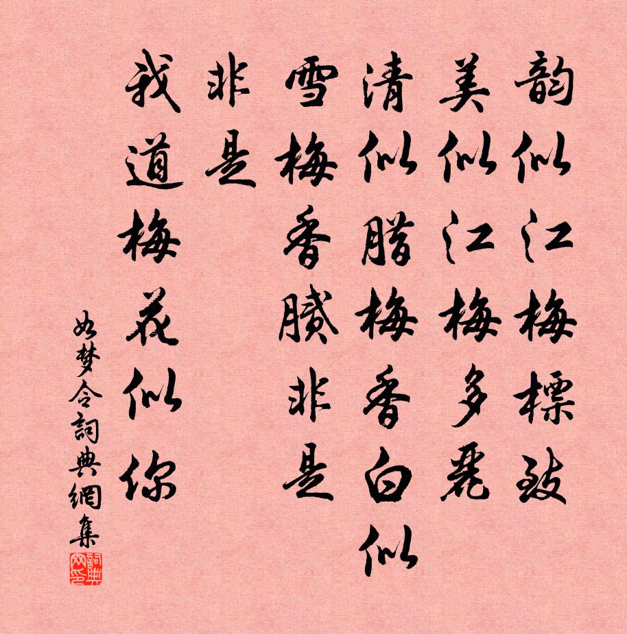詩詞名句歷史字典書法欣賞書法字典國語詞典說文解字康熙字典古漢語字典標 題 作 者 詩 句 如夢令作者:佚名 朝代:宋代如夢令原文韻似江梅標緻。美似江梅多麗。清似臘梅香,白似雪梅香膩,非是。非是。我道梅花似你。詩詞問答問:如夢令的作者是誰?答:佚名問:如夢令寫於哪個朝代?答:宋代問:如夢令是什麼體裁?答:詞問:佚名的名句有哪些?答:佚名名句大全佚名如夢令書法欣賞如夢令書法作品詩詞推薦山居偶成釋智圓〔宋代〕世上喧譁耳不聞,煙蘿深處絕人群。歲寒弗改憐高柏,舒捲無機愛白雲。閒採藥苗醫故疾,旋編紅葉寫新文。有人燭影搖紅(雪樓得次子,行台時治金陵)鄧剡〔宋代〕郢雪歌高,天教鶴子參鳴和。薰風旌節瑞華□,光動垂弧左。早是煙樓撞破。更明珠、重添一顆。鏡容中夜,摩頂晚春出箭溪二首陸九淵〔宋代〕晴雲冉冉薄斜暉,春靜衡門半掩扉。風入牆頭丹杏晚,高枝頻颭亂花飛。游東山松風王炎〔宋代〕松公奮鬣如嘯,終日清風颯然。佳處元非宮徵,誰能寫入朱弦。次韻平仲侍郎移居見簡李彌遜〔宋代〕不寄斜封歲已餘,那聞異縣更移居。羈懷易動野馬也,歸夢自成胡蝶與。有宅一區如子少,受薪十束見予疏。遙知寶墨亭蘇軾〔宋代〕山陰不見換鵝經,京口空傳瘱鶴銘。瀟灑謫仙來作郡,風流太守為開亭。兩篇玉蕊塵初滌,四體銀鉤跡尚青。我久橫浦樓賈成之〔宋代〕橫槎三月江如束,風浪縈行接天綠。郡樓新創插雲飛,盡日江山對雙目。樓中刺史幽興長,百斛載春供不足。委順趙君見遺千里小景鴉鵲圖有詩將之用韻為蒲壽宬〔宋代〕朝拂扶桑影,暮尋明日枝。群飛心共遠,三匝意猶遲。相向無聲里,應思落筆時。寸程千里闊,惟可與君知。寄題喻叔奇國傅郎中園亭二十六詠野塘楊萬里〔宋代〕鴈下菰蒲報夕寒,鷺將荇藻作朝餐。野塘只許野人到,不要金張許史看。余作探使以繚綾手帛子寄賀因而有詩韓偓〔唐代〕解寄繚綾小字封,探花筵上映春叢。黛眉印在微微綠,檀口消來薄薄紅。緶處直應心共緊,砑時兼恐汗先融。帝台宿裴氏山莊王昌齡〔唐代〕蒼蒼竹林暮,吾亦知所投。靜坐山齋月,清溪聞遠流。西峰下微雨,向曉白雲收。遂解塵中組,終南春可游。讀本朝史有感十首項安世〔宋代〕垂簾復辟身居穩,送呂迎章話又新。瞞得庭中相泣者,難瞞屏後竊聽人。水龍吟(和野渡生朝)衛宗武〔宋代〕桑蓬掃盡閒愁,未應人比梅花瘦。眉峰頓展,恰如雲卷,北山□九。縈錦繡腸,袖絲綸手,駸駸希有。□□□博取詩上堯夫先生兼寄伯游正叔張載〔宋代〕先生高臥洛城中,洛邑簪纓幸所同。顧我七年清渭上,並游無侶又春風。鳳池吟吳文英〔宋代〕萬丈巍台,碧罘罳外,袞袞野馬游塵。舊文書幾閣,昏朝醉暮,覆雨翻雲。忽變清明,紫垣敕使下星辰。經年事靜跋范寬小景張舜民〔宋代〕對鏡傳神了不殊,峴山黃落數峰孤。既能咫尺成千里,何必吾家十幅圖。次韻奉送李季言四首張元乾〔宋代〕藩鎮各傳新號令,山河那復舊提封。歸時剩語騎鯨老,堅臥無如澗底松。和孔純老按屬邑六首王之道〔宋代〕行並焦湖試問塗,何如震澤占姑蘇。提壺聒聒勸誰飲,我不知君渠自呼。學詩吟十首方回〔宋代〕楊氏昔為我,老子實似子。墨氏昔兼愛,釋迦亦如之。孟子辟楊墨,有功此一時。似仁與似義,暗傳匪明垂。梵語乙巳春次中隱先生韻楊冠卿〔宋代〕密勿籌帷今幾春,故山猿鶴尚關情。中書歷遍令公考,樂道要從莘野耕。名句推薦有兼聽之明,而無矜奮之容;有兼覆之厚,而無伐德之色。荀子《荀子·正名》 良冶之子,必學為裘;良弓之子,必學為箕戴聖《禮記·學記》 柳庭風靜人眠晝,晝眠人靜風庭柳。蘇軾《菩薩蠻·回文夏閨怨》 天外黑風吹海立,浙東飛雨過江來。蘇軾《有美堂暴雨》 焚琴煮鶴從來有,惜玉憐香幾個知!馮夢龍《醒世恆言·卷三》 疲馬山中愁日晚,孤舟江上畏春寒。張謂《杜侍御送貢物戲贈》 明日相思莫上樓,樓上多風雨。游次公《卜運算元·風雨送人來》 佳人彩雲里,欲贈隔遠天。李白《折荷有贈》 寒笛對京口,故人在襄陽。劉昚虛《暮秋揚子江寄孟浩然》 思君若汶水,浩蕩寄南征。李白《沙丘城下寄杜甫》