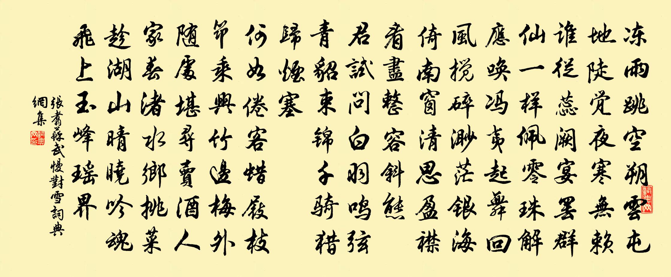 詩詞名句歷史字典書法欣賞書法字典國語詞典說文解字康熙字典古漢語字典標 題 作 者 詩 句 蘇武慢 對雪作者:張翥 朝代:元代蘇武慢 對雪原文凍雨跳空,朔雲屯地,陡覺夜寒無賴。誰從蕊闕,宴罷群仙,一樣佩零珠解。應喚馮夷,起舞迴風,攪碎渺茫銀海。倚南窗清思,盈襟看盡,整容斜態。君試問、白羽鳴弦,青貂束錦,千騎獵歸煙塞。何如倦客,蠟屐枝筇,乘興竹邊梅外。隨處堪尋,賣酒人家,春渚水鄉挑菜。趁湖山晴曉,吟魂飛上,玉峰瑤界。詩詞問答問:蘇武慢 對雪的作者是誰?答:張翥問:蘇武慢 對雪寫於哪個朝代?答:元代問:蘇武慢 對雪是什麼體裁?答:詞張翥蘇武慢 對雪書法欣賞蘇武慢 對雪書法作品詩詞推薦西江月(為范南伯壽)辛棄疾〔宋代〕秀骨青松不老,新詞玉佩相磨。靈槎準擬泛銀河。剩摘天星幾個。奠枕樓東風月,駐春亭上笙歌。留君一醉意如何贈別通古周金〔宋代〕良人輕一別,奄忽幾經秋。明月望不見,白雲徒自愁。征鴻悲北渡,江水奈東流。會話知何日,如今已白頭。清明湖上周端臣〔宋代〕誰家園裹一聲鶯,啼向春風似有情。驚趣起少年治興,插花沽酒醉清明。送僧妙通游平江萬壽周弼〔宋代〕故鄉離幾日,何處躡秋陵。梵葉床頭樹,唐衣壁面僧。雨花粘舊錫,風籜掃寒簦。新偈期相寄,呵彈破小乘。龍游八景瀫水晴風鄭得彝〔宋代〕鮫鮹藍色染初勻,風皺粼粼渺水雲。安得此溪還姓冉,名高千載柳州文。九日陪金市諸友登高陽山二首王阮〔宋代〕途窮已負菊花期,尚得諸公慰所思。不遣白衣持酒至,共將烏帽入風吹。紫萸秋淺浮觴少,黃葉山高策杖遲。卻恨悟空塔釋贊寧〔宋代〕浮圖蕭瑟入虛空,一聚全身罔像中。傳馬祖心開佛印,識龍潛主示神通。毫光委墜江樓月,道氣馨香海岸風。此地送別同用闊字(三韻)權德輿〔唐代〕耿耿離念繁,蕭蕭涼葉脫。緇塵素衣敝,風露秋江闊。想得讀書窗,岩花對巾褐。題袁耕道所收小飛來晁補之〔宋代〕藏山常恐負而走,壺中九華安在哉。憶似冷泉亭畔見,為君題作小飛來。冬盡日睢陽感事強至〔宋代〕天邊愁緒細如毛,眼底詩情付濁醪。張許忠魂空日月,鄒枚樂事委蓬蒿。積成鄉思心頻折,送盡年華首重搔。杜子感事朱槔〔宋代〕大弓竅陽氏,神鼎淪泗淵。何須識微士,周魯必不全。武庫一朝火,斬蛇逐飛煙。傷心睨前事,氐虜定紛然。病中曉思陸龜蒙〔唐代〕月墮霜西竹井寒,轆轤絲凍下瓶難。幽人病久渾成渴,愁見龍書一鼎乾。偈頌一百六十首釋宗杲〔宋代〕行不到處說不難,說不到處行不難。行說難到不難到,拈卻門前大案山。詠般若台一首贈源□長□錢端禮〔宋代〕□□雲收出遠林,兩山不隔□□鳴。層台迥出層霄外,霜□還同霜月平。修竹可人無俗韻,疏梅能事□僧清。寶□金陵覽古後湖朱存〔唐代〕雷轟疊鼓火翻旗,三翼翩翩試水師。驚起黑龍眠不得,狂風猛雨下多時。所失吟邵雍〔宋代〕所失彌多所得微,中間贏得一噓欷。人榮人悴乃常理,花謝花開何足追。偶爾相逢卻相別,乍然同喜又同悲。只消戲成白髮二首張鎡〔宋代〕怕見人言老,梳頭夜二更。誰知燈燭夜,漏逗愈分明。馬戴居華山因寄賈島〔唐代〕玉女洗頭盆,孤高不可言。瀑流蓮岳頂,河注華山根。絕雀林藏鶻,無人境有猿。秋蟾才過雨,石上古松門。望前山雪寄葉山人蘇泂〔宋代〕煙雲出沒微微白,知道前山雪出來。應在山中望城郭,爛銀宮闕是蓬萊。山行逢勤禪德釋重顯〔宋代〕乳岩秋日無他作,策杖層層止寥廓。四顧有誰分野情,一點彤雲起深壑。蘚石遲遲略輕踞,逢箇衲僧忽驟步。頻喚名句推薦惟有河邊雁,秋來南向飛。庾信《重別周尚書》 千古英雄同一嘆,傷懷豈止為蛾眉沈約《昭君辭》 黃葉覆溪橋,荒村唯古木。柳宗元《秋曉行南谷經荒村》 冬則溫,夏則凊。晨則省,昏則定。李毓秀《弟子規·入則孝》 撩亂邊愁聽不盡,高高秋月照長城。王昌齡《從軍行七首》 欲往從之雪雰雰,側身北望涕沾巾。張衡《四愁詩》 如何亡國恨,盡在大江東!屈大均《秣陵》 帶雨牡丹無氣力,黃鸝愁雨濕。汪莘《謁金門·簾漏滴》 黃花深巷,紅葉低窗,淒涼一片秋聲。蔣捷《聲聲慢·秋聲》 樹木何蕭瑟,北風聲正悲。曹操《苦寒行》