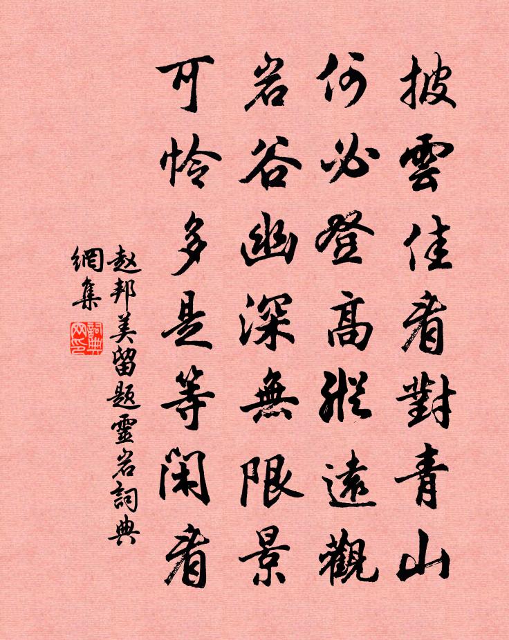 詩詞名句歷史字典書法欣賞書法字典國語詞典說文解字康熙字典古漢語字典標 題 作 者 詩 句 留題靈岩作者:趙邦美 朝代:宋代留題靈岩原文披雲佳看對青山,何必登高縱遠觀。岩谷幽深無限景,可憐多是等閒看。詩詞問答問:留題靈岩的作者是誰?答:趙邦美問:留題靈岩寫於哪個朝代?答:宋代趙邦美留題靈岩書法欣賞留題靈岩書法作品詩詞推薦清平樂張樞〔宋代〕鳳樓人獨。飛盡羅心燭。夢繞屏山三十六。依約水西雲北。曉奩懶試脂鉛。一紂鸞髻微偏。留得宿妝眉在,要教知過猷講主桑瀆精舍陸游〔宋代〕寂寞衡門傍水開,放翁曳杖此徘徊。林疏時見釣篷過,風急忽聞菱唱來。講罷繩床懸塵柄,齋余童子供茶杯。解衣普陀山觀音岩祈雨一首王阮〔宋代〕南我不為雨,躬即寶陀求。地勢到此盡,天河相接流。鰲舒千丈背,蜃吐數層樓。念彼觀音力,楊枝灑有秋。偈頌一百零四首釋紹曇〔宋代〕撮藥場中驗作家,一枝手髂兩條蛇。劉寄奴草雖靈驗,已是遭它毒口來。句江休復〔宋代〕郡邸獄冤誰與辯,皋橋客死世同悲。賦得月下聞蛩送別劉商〔唐代〕物候改秋節,炎涼此夕分。暗蟲聲遍草,明月夜無雲。清迥檐外見,淒其籬下聞。感時兼惜別,覉思自紛紛。廣濟道中孔武仲〔宋代〕牽確山坡瘦馬行,年朝春色未分明。蔫黃猶是舊時葉,格礫稍聞新歲聲。強涉遠塗非我好,亦逢佳景得心平。寒威謝韋大夫柳栽皇甫冉〔唐代〕本在胡笳曲,今從漢將營。濃陰方待庇,弱植豈無情。比雪花應吐,藏烏葉未成。五株蒙遠賜,應使號先生。景福東廂詩柏寒司馬光〔宋代〕落落抱高節,秀出青雲端。無言磵谷幽,自致宮廷難。芳風襲玉宇,余露分銅盤。不使萬年木,嘉名高歲寒。羅江驛唐彥謙〔唐代〕數枝高柳帶鳴鴉,一樹山榴自落花。已是向來多淚眼,短亭回首在天涯。奉和七夕宴懸圃應制二首許敬宗〔唐代〕牛閨臨淺漢,鸞駟涉秋河。兩懷縈別緒,一宿慶停梭。星模鉛里靨,月寫黛中蛾。奈許今宵度,長嬰離恨多。婺閨秋夜感舊十二韻陸游〔宋代〕冷螢綴蓬根,忽復照高樹。年光逝不留,百感集遲暮。往者秦蜀間,慷慨事征戍。猿啼鬼迷店,馬噤飛石舖。危嶺奉和嚴大夫軍城早秋杜甫〔唐代〕秋風褭褭動高旌,玉帳分弓射虜營。已收滴博雲間戍,更奪蓬婆雪外城。長安冬夜書事任翻〔唐代〕憂來長不寐,往事重思量。清渭幾年客,故衣今夜霜。春風誰識面,水國但牽腸。十二門車馬,昏明各自忙。西江月郭應祥〔宋代〕不但酴醿芍藥,此花亦殿餘春。麝囊初破酒初醺。恰有這般風韻。斕坼真成絕倒,半開猶帶輕顰。不知抵死笑何人出城陸游〔宋代〕羈枕不成寐,羸驂曉出城。驛門深閉草,苑樹密藏鶯。老病安閒散,疏慵負聖明。津亭凝望久,惟是待潮平。陸務觀讀道書名其齋曰玉笈曾幾〔宋代〕自生民以來,未有夫子盛。六經更百代,略不睹疵病。瞿聃書角立,亦各談性命。空門甚宏放,果報駭觀聽。是以湖上遇雨鄭獬〔宋代〕老龍怒相搏,快雨忽噴灑。天公白羽箭,竦竦射萬瓦。電眼窺人屋,狂雷震欲下。直疑惡溪山,掃除重造化。頃之張元覽追和東坡詠梅要予同賦李處權〔宋代〕江空月掛疏梅村,生香湔祓何郎魂。亭亭自是塵表物,玉質敢有煙埃昏。西州風土似南國,高樹繚台丞相園。居然和康提刑過康州陳懌〔宋代〕民居城柵盡非元,唯有江山似昔年。聽訟棠陰遺舊址,按行台旆照晴川。重來自喜恩威洽,別後常嗟歲月遷。道側名句推薦儉則傷事,侈則傷貨管仲《管子·乘馬》 琴瑟在御,莫不靜好。佚名《女曰雞鳴》 山川蕭條極邊土,胡騎憑陵雜風雨。高適《燕歌行》 學問無大小,能者為尊。李汝珍《鏡花緣·第二十三回》 先生名利比塵灰,綠竹青鬆手自栽。王汝舟《詠歸堂隱鱗洞》 赤闌橋盡香街直,籠街細柳嬌無力。陳克《菩薩蠻·赤闌橋盡香街直》 故國山川,故園心眼,還似王粲登樓。周密《一萼紅·登蓬萊閣有感》 飛錫離鄉久,寧親喜臘初。錢起《送外甥懷素上人歸鄉侍奉》 長安故人問我,道尋常、泥酒只依然。辛棄疾《木蘭花慢·滁州送范倅》 錦江春色來天地,玉壘浮雲變古今。杜甫《登樓》