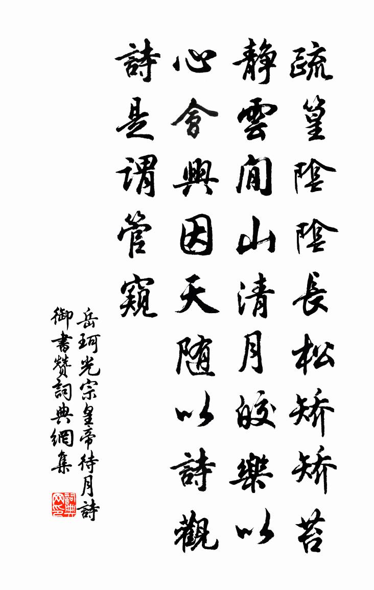 詩詞名句歷史字典書法欣賞書法字典國語詞典說文解字康熙字典古漢語字典標 題 作 者 詩 句 光宗皇帝待月詩御書贊作者:岳珂 朝代:宋代光宗皇帝待月詩御書贊原文疏篁陰陰,長松矯矯。苔靜雲閒,山清月皎。樂以心會,興因天隨。以詩觀詩,是謂管窺。詩詞問答問:光宗皇帝待月詩御書贊的作者是誰?答:岳珂問:光宗皇帝待月詩御書贊寫於哪個朝代?答:宋代岳珂光宗皇帝待月詩御書贊書法欣賞光宗皇帝待月詩御書贊書法作品詩詞推薦過華山懷白雲陳先生張詠〔宋代〕性愚不肯林泉住,強要清流擬致君。今日星馳劍南去,回頭慚愧華山雲。廣愛寺歐陽修〔宋代〕都人布金地,紺宇巋然存。山氣蒸經閣,鍾聲山國門。老杉春自綠,古壁雨先昏。應有幽人屐,來留石蘚痕。五月九日甲子至月望庚午大雨水不已十首方回〔宋代〕今日雲霄管客,何人禹稷思。樹高堪避溺,稻盡底充飢。苦口非吾事,衰軀異昔時。東溟容有限,細讀後山詩。題余府浮香亭白玉蟾〔宋代〕小亭低瞰小池邊,日日春風醉管弦。盤礴好窮詩世界,登臨疑是水神仙。玉萍掩映壺中月,錦鯉浮沉鏡里天。芍藥夜臥舟中聞有唱山歌者倚其聲作二首王道父〔宋代〕生來不識大門邊,一片丹心石樣堅。聞道阿郎難得婦,無媒爭得到郎前。春眠白居易〔唐代〕新浴肢體暢,獨寢神魂安。況因夜深坐,遂成日高眠。春被薄亦暖,朝窗深更閒。卻忘人間事,似得枕上仙。至適送楊少尹序韓愈〔唐代〕昔疏廣、受二子,以年老,一朝辭位而去。於是公卿設供帳,祖道都門外,車數百輛;道路觀者,多嘆息泣下,共聞喜燕上贈狀元葉祖洽王珪〔唐代〕黼座親臨唱第初,宴嬉猶及苑花余。青廂特訪安危策,紫府應將姓字書。御酒連傾金鑒落,宮床曾賜玉蟾蜍。從來送僧歸國清寺杜荀鶴〔唐代〕吟送越僧歸海涯,僧行渾不覺程賒。路沿山腳潮痕出,睡倚松根日色斜。撼錫度岡猿抱樹,挈瓶盛浪鷺翹沙。到參懷珦潛山釋行海〔宋代〕楚雨吳煙動客思,江梅發後失歸期。傳來蹤跡渾無定,飄泊情懷已可知。鼓角每驚多事日,鶯花空度少年時。與君丁丑別金壇劉漫塘七首杜范〔宋代〕崇山郁嵯峨,千章自交陰。培樓植松柏,斧斤日相尋。物小固不容,名大亦難任。智哉甯夫子,其愚非本心。和人古劍王令〔宋代〕安知歲月幾經今,傳記汗漫不可尋。得自廢墟埋萬古,失曾飛將購千金。客思秋水龍泉冷,士嘆中原虎穴深。好與寧都縣道中鄭會〔宋代〕綠水橋頭小釣車,數椽敗屋柱槎牙。年年賊火無人住,風落棠梨幾片段預告。偈二十七首釋守淨〔宋代〕瞿曇鼓動三寸舌,四十九年無法說。達磨不立一字腳,列派分枝無處著。青山不鎖長飛勢,滄海合知來處高。和花庵上牽牛花邵雍〔宋代〕葉鬧深如幄,花繁翠似鈿。瀼瀼零曉露,羃羃蔽晴煙。謝既成番次,開仍有後先。主人凝佇苦,長是廢朝眠。三禽言方岳〔宋代〕麥熟熟,黃雲肩堆滿屋。大兒燒穟事治谷,小兒擷蔬歸作粥。阿翁飽去摩挲腹,柿葉濃陰對黃犢,快活一生甘碌碌更漏子李煜〔唐代〕柳絲長,春雨細,花外漏聲迢遞。驚塞雁,起城烏,畫屏金鷓鴣。香霧薄,透重幕,惆悵謝家池閣。紅燭背,繡幃閒詠園中草木陸游〔宋代〕麝香萱草移東郭,錦子葵花買上原。兒喚乃翁閒一看,欣然曳杖出籬門。送中書潘舍人省上二首蘇籀〔宋代〕亟紓多難一群心,惕厲咨嗟憯測深。漢制春溫勸敦本,周家夙戒豈無箴。該淹伯始萬端理,煩悉姬公五誥尋。愈近次韻程願二首許月卿〔宋代〕我家張許同生歲,果者堯時值聖明。丙子與君無貴者,甲辰惟我亦同庚。閒雲萬嶺林泉興,明月一溪邱壑情。同歲名句推薦萬里平湖秋色冷,星辰垂影參然。牛希濟《臨江仙·洞庭波浪颭晴天》 衣懶換,酒難賒。可憐此夕看梅花。吳文英《思佳客·癸卯除夜》 火形嚴,故人獻灼;水形懦,人多溺。韓非及後人《韓非子·內儲說上七術》 柳葉開銀鏑,桃花照玉鞍。駱賓王《送鄭少府入遼共賦俠客遠從戎》 瀚海闌乾百丈冰,愁雲慘澹萬里凝。岑參《白雪歌送武判官歸京》 君看六幅南朝事,老木寒雲滿故城。韋莊《金陵圖》 送子軍中飲,家書醉里題。岑參《磧西頭送李判官入京》 遙想獨游佳味少,無方騅馬但鳴嘶。蘇轍《懷澠池寄子瞻兄》 十二闌乾,故國三千里。王庭筠《鳳棲梧·衰柳疏疏苔滿地》 故人何處。帶我離愁江外去。呂本中《減字木蘭花·去年今夜》