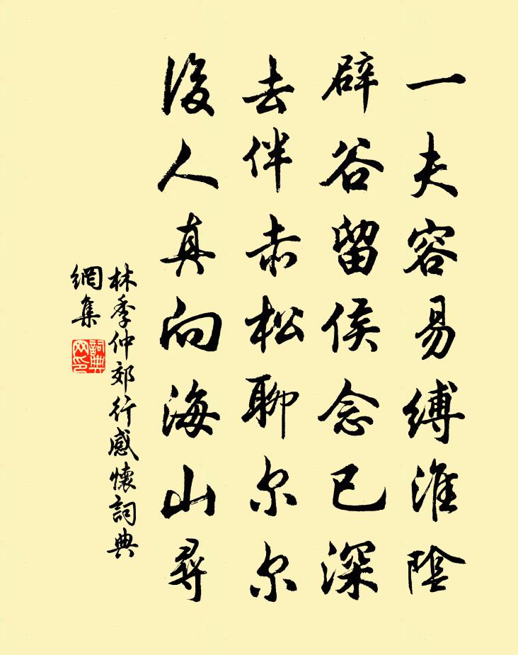 詩詞名句歷史字典書法欣賞書法字典國語詞典說文解字康熙字典古漢語字典標 題 作 者 詩 句 郊行感懷作者:林季仲 朝代:宋代郊行感懷原文一夫容易縛淮陰,辟穀留侯念已深。去伴赤松聊爾爾,後人真向海山尋。詩詞問答問:郊行感懷的作者是誰?答:林季仲問:郊行感懷寫於哪個朝代?答:宋代林季仲郊行感懷書法欣賞郊行感懷書法作品詩詞推薦和余時升周子美江雨有懷雨不絕詩韻各賦一首郭印〔宋代〕檐前萬點落珠璣,乳燕梁間嫩學飛。水匯百川人跡絕,苔封三徑馬蹄稀。田塍湓溢禾生耳,薜荔芊綿垣有衣。江上正朝摘梅張說〔唐代〕蜀地寒猶暖,正朝發早梅。偏驚萬里客,已復一年來。竹間榴花陳宓〔宋代〕五月林梢未著禪,節根新換玉娟娟。露華團翠濃堪滴,澆得殷紅不敢然。僻居秋思寄友人伍喬〔唐代〕門巷秋歸更寂寥,雨餘閒砌委蘭苗。夢回月夜蟲吟壁,病起茅齋藥滿瓢。澤國舊遊關遠思,竹林前會負佳招。身名偈頌一百一十七首釋紹曇〔宋代〕四十年同參,廿餘年相別。不唱菩薩蠻,休暇說佛法。驀劄相逢十二峰,我患生盲你患聾。是聖是凡都莫問,且分雜言二首李流謙〔宋代〕一萍無根托瀰渺,分頭常多聚常少。天涯碧草又傷心,況是一分春已了。啼禽飛來窺酒樽,樽中綠波吹鱗鱗。東君龍游八景雙港明月鄭得彝〔宋代〕沄沄逝水夾滄洲,金耀浮光碎碧流。夜半漁歌聲再起,一天明月兩溪秋。送客劉克莊〔宋代〕騎驢送客一壺隨,汗透中單熱似炊。客又不來天落雨,路邊茅舍坐移時。餘干登眺有懷趙蕃〔宋代〕溪山雖好政須人,終日倀倀此水濱。試並欄乾一回首,只余鷗鳥似相親。菩薩蠻舒亶〔宋代〕三年江上風吹淚。夭桃艷杏無春意。今日欲開眉。那堪更別離。莫折長亭柳。折盡愁依舊。只有醉如狂。人生空斷題蔡主簿小園董嗣杲〔宋代〕聒耳禽聲細,澄顏池景浮。襟懷猶徼塞,松竹自林丘。剪韭疏畦闊,分蘭貼石幽。吟箋滿芸架,閒樂野僧留。送楊屯田通判永興王禹偁〔宋代〕長安棄廢比藩方,通理猶宜占省郎。入洛才名齊二陸,有唐門戶本三楊。袖中丹桂家聲在,道畔豐碑祖德光。莫向題袁州邵錄三老圖王義山〔宋代〕不夸九老寫成圖,要似一家三老無。滿把壽觴拼一醉,父前母后子來扶。右軍得示帖贊岳珂〔宋代〕淳古有真味,不特見於結子。茲帖之名得示,縱摹倣於唐世,隱然猶有西晉之遺意。彼昌黎者,或肆譏議。謂以俗梅花落曹勛〔宋代〕殖雖無遠近,開獨占三冬。怨入胡笳切,香凝素臉穠。有了調金鼎,遺根益縣封。佳人初睡起,留取照芳容。寄趙德莊以過去生中作弟兄為韻七首韓元吉〔宋代〕我生少孤貧,四海兩兄弟。拊嫗賴母慈,離別幾揮涕。宦遊與夫子,中外輒相值。所恨姓氏殊,孰雲情好異。山中答劉書記寓懷李山甫〔唐代〕貴門多冠冕,日與榮辱並。山中有 * ,笑傲出衰盛。正直任天真,鬼神亦相敬。之子賁丘園,戶牖松蘿映。骨將新歲雪霽到西湖作三首宋庠〔宋代〕間拂苔磯弄釣輪,幽懷先賞潩灘春。沙鷗似未知余意,驚舞時時錯避人。十詩謝寥計使陳造〔宋代〕貧女信難昏,俗子每易忘。文學公世師,一見遽倒囊。原公出調燮,容我濯滄浪。台躔五雲處,浩歌長相望。賦月華臨靜夜姚合〔唐代〕長空埃壒滅,皎皎月華臨。色正秋將半,光鮮夜自深。九霄晴更徹,四野氣難侵。靜照遙山出,孤明列宿沉。高人名句推薦稱尊長,勿呼名。對尊長,勿見能。李毓秀《弟子規·出則弟》 歲暮鋤犁傍空室,呼兒登山收橡實。張籍《野老歌 / 山農詞》 目不能兩視而明,耳不能兩聽而聰。荀子《荀子·勸學》 莫笑他人老,終須還到老。佚名《增廣賢文·上集》 鳥雀呼晴,侵曉窺檐語。周邦彥《蘇幕遮·燎沉香》 不蹶于山,而蹶於垤,則細微宜防也。王永彬《圍爐夜話·第五二則》 痛飲狂歌空度日,飛揚跋扈為誰雄。杜甫《贈李白》 毋意,毋必,毋固,毋我。孔子弟子《論語·子罕篇》 萬里人南去,三春雁北飛。韋承慶《南中詠雁詩》 斬草除根,萌芽不發馮夢龍《警世通言·卷三十七》