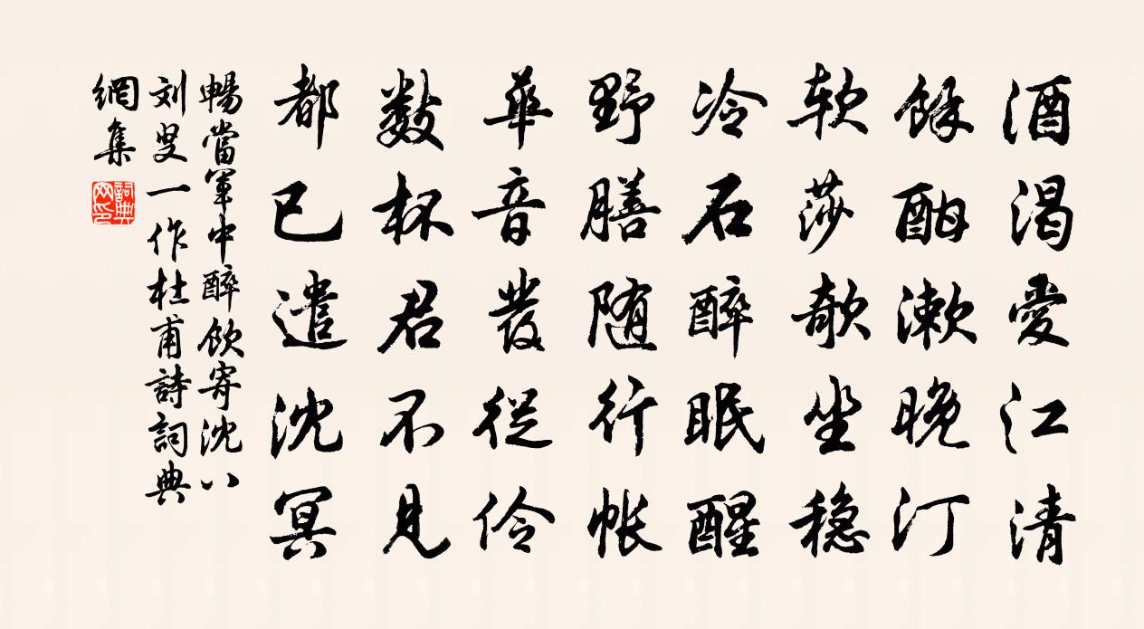 詩詞名句歷史字典書法欣賞書法字典國語詞典說文解字康熙字典古漢語字典標 題 作 者 詩 句 軍中醉飲寄沈八劉叟(一作杜甫詩)作者:暢當 朝代:唐代原文酒渴愛江清,餘酣漱晚汀。軟莎欹坐穩,冷石醉眠醒。野膳隨行帳,華音發從伶。數杯君不見,都已遣沈冥。詩詞問答問:《軍中醉飲寄沈八劉叟(一作杜甫詩)》的作者是誰?答:暢當問:該詩寫於哪個朝代?答:唐代書法欣賞軍中醉飲寄沈八劉叟(一作杜甫詩)書法作品注釋全唐詩:卷287_7詩詞推薦又登碧雲亭感懷三十首吳芾〔宋代〕晚上危亭一憑欄,青青最愛謝家山。謝公陳跡雖磨滅,餘韻遺風尚可攀。長歌行劉復〔唐代〕淮南木落秋雲飛,楚宮商歌今正悲。青春白日不與我,當壚舉酒勸君持。出門驅馳四方事,徒用辛勤不得意。三山瑞鶴仙(嘲博見樓)呂勝己〔宋代〕倚闌觀四遠。近有客登臨,故相磨難。山形欠舒展。小峰巒雲樹,晦明更變。江淮楚甸。又何曾、分明在眼。但臨次韻和康侍郎雪後小雨二首林季仲〔宋代〕殘霙初伴梅梢月,小雨仍禁柳底春。莫厭酒搖金盞浪,更聽歌繞畫染塵。青溪口號查慎行〔清代〕橋壞笮繫繩,水淺牛可跨。牛背度溪人,鬚眉綠如畫。寄題李舍人蒲中新齋司馬光〔宋代〕隴上家聲勇氣殊,邊亭臥鼓欲安居。非同王翦私求宅,更似甘寧晚好書。劍倚寒窗風淅瀝,門無雜客柳蕭疏。蒲州贈劉琨詩二十首 十一盧諶〔魏晉〕由余片言。秦人是憚。日磾效忠。飛聲有漢。桓桓撫軍。古賢作冠。來牧幽都。濟厥塗炭。謝龔養正送蘄竹杖范成大〔宋代〕一聲霜曉謾吹愁,八尺風漪不耐秋。上座獨超三昧地,諾惺庵里證般舟。寄貫休上人修睦〔唐代〕常語亦關詩,常流安得知。楚郊來未久,吳地住多時。立月無人近,歸林有鶴隨。所居渾不遠,相識偶然遲。述國亡詩花蕊夫人〔唐代〕君王城上豎降旗,妾在深宮那得知?十四萬人齊解甲,更無一個是男兒!龍井十題獅子峰釋元淨〔宋代〕獨爾群山里,人稱獅子峰。無心自哮吼,顯晦煙雲中。報謁徐大雅仁因以題贈三首趙蕃〔宋代〕我住東郊只樹園,無人肯顧席為門。多君用意非流俗,忙裡偷閒每見存。雜曲歌辭。壯士吟賈島〔唐代〕壯士不曾悲,悲即無回期。如何易水上,未歌先淚垂。悼室人詩江淹〔南北朝〕適見葉蕭條。已復花庵郁。帳里春風盪。檐前還燕拂。垂涕視去景。摧心向徂物。今悲輒流涕。昔歡常飄忽。幽情春帖子詞皇帝閣十二首宋祁〔宋代〕春風長樂地,春仗大明天。春酒皆千日,春枝即萬年。浪淘沙(余畫墨水仙並題其上)張炎〔宋代〕回首欲婆娑。淡掃修蛾。盈盈不語奈情何。應恨梅兄礬弟遠,雲隔山阿。弱水夜寒多。帶月曾過。羽衣飛過染餘波觀三國吟邵雍〔宋代〕桓桓鼎峙震雷音,絕唱高蹤沒處尋。簫鼓一方情未暢,弓刀萬里力難任。論兵狠石寧無意,飲馬黃河徒有心。雖曰和尉遲贊善病中見寄徐鉉〔唐代〕仙郎移病暑天過,卻似冥鴻避罻羅。晝夢乍驚風動竹,夜吟時覺露沾莎。情親稍喜貧居近,性懶猶嫌上直多。望苑發商州白居易〔唐代〕商州館裡停三日,待得妻孥相逐行。若比李三猶自勝,兒啼婦哭不聞聲。[時李固言新歿。]時事感慨王同祖〔宋代〕蜀又交侵淮又危,江湖風浪沸潢池。連朝雲氣濃於墨,想是英雄血戰時。名句推薦白骨露於野,千里無雞鳴。曹操《蒿里行》 西陸蟬聲唱,南冠客思深。駱賓王《詠蟬 / 在獄詠蟬》 居善地,心善淵,與善仁,言善信,政善治,事善能,動善時。夫唯不爭,故無尤。老子《老子·道經·第八章》 自古聖賢盡貧賤,何況我輩孤且直!鮑照《擬行路難·其六》 目察秋毫之末,耳不聞雷霆之音;耳調玉石之聲,目不見泰山之高劉安及其門客《淮南子·俶真訓》 海上千烽火,沙中百戰場。李頎《古塞下曲》 誠知此恨人人有,貧賤夫妻百事哀。元稹《遣悲懷三首·其二》 人生自是有情痴,此恨不關風與月。歐陽修《玉樓春·尊前擬把歸期說》 人逢喜事精神爽,月到中秋分外明。馮夢龍《醒世恆言·卷十八》 寒食時看郭外春,野人無處不傷神。雲表《寒食詩》