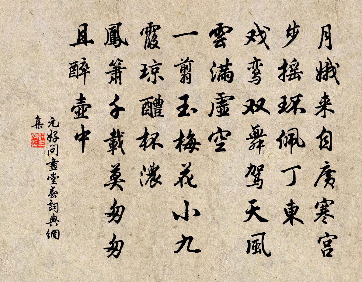 詩詞名句歷史字典書法欣賞書法字典國語詞典說文解字康熙字典古漢語字典標 題 作 者 詩 句 畫堂春作者:元好問 朝代:金代畫堂春原文月娥來自廣寒宮。步搖環佩丁東。戲鸞雙舞駕天風。雲滿虛空。一翦玉梅花小,九霞瓊醴杯濃。鳳簫千載莫匆匆。且醉壺中。詩詞問答問:畫堂春的作者是誰?答:元好問問:畫堂春寫於哪個朝代?答:金代問:畫堂春是什麼體裁?答:詞問:元好問的名句有哪些?答:元好問名句大全元好問畫堂春書法欣賞畫堂春書法作品詩詞推薦雪歐陽修〔宋代〕新陽力微初破萼,客陰用壯猶相薄。朝寒稜稜風莫犯,莫雪緌緌止還作。驅馳風雲初慘澹,炫晃山川漸開廓。光芒題周文矩合樂士女圖宋孝宗〔宋代〕今夜調琴忽有情,欲彈惆悵憶崔卿。何人解愛中徽上,秋思頭邊 * 聲。緣識宋太宗〔宋代〕慈悲與喜舍,歷劫自然深。法要無抱束,緣歸一寸心。永和道中懷成父趙蕃〔宋代〕風帆十幅空百灘,布衾高臥寧知寒。連明風雨曉增劇,嘆我山行逢路難。懷清曠兄弟鄧深〔宋代〕殘臘迎除夕,新春接上元。常進陪內集,排日醉芳樽。歲月驚殊谷,關山隔故園。談邊應記我,頻嚏怪黃昏。晚浴溪上王炎〔宋代〕山腳草深樵徑沒,溪頭水落石樑高。一川風露無人占,古柳玄蟬處處號。讀杜詩陸游〔宋代〕城南杜五少不羈,意輕造物呼作兒。一門酣法到孫子,熟視嚴武名挺之。看渠胸次隘宇宙,惜哉千萬不一施!空回秦富人於濆〔唐代〕高高起華堂,遠遠引流水。糞土視金珍,猶嫌未奢侈。陋巷滿蓬蒿,誰憐有顏子。次答熊去非七夕遇雨見候陳普〔宋代〕志土千載心,爛爛如斜河。道路坦且修,況復陰雨多。女駿不可說,牛痴無奈何。次韻蘇公西湖徙魚三首陳師道〔宋代〕赤手取魚如拾塊,布網鳴舷攻腹背。豈知激濁與清流,恐懼駢頭牽翠帶。居士仁心到魚鳥,會有微生化余鱠。寧容和仲弟十絕劉克莊〔宋代〕懶窺戶外問晴陰,靜向窗前閱古今。江國事稀聊袖手,鈞天夢斷久灰心。失子林季仲〔宋代〕檐鵲哺雛時自喜,壟牛舐犢互相噓。老妻覷我無他語,歡笑何年得似渠。偈頌二十一首釋普寧〔宋代〕檀那夢見大棟樑,高僧羅漢滿雲堂,慷慨重新鋪蓋就,比之兜率更尤強。衲子辦道耐長久,成佛作祖法中王。下等頌證道歌證道歌釋印肅〔宋代〕圓頓教,沒人情,集雲峰下四藤根。天下大禪誰識得,荒茅野地少人耕。次韻李參政見寄三首魏了翁〔宋代〕怕放紅樓目,浮雲斷復連。遠看壺聚拓,近眎室如縣。耿耿自許國,悠悠誰訊天。天心那可識,拄頰看晴川。西江月史達祖〔宋代〕裙摺綠羅芳草,冠梁白玉芙蓉。次公筵上見山公。紅綬欲銜雙鳳。已向冰奩約月,更來玉界乘風。凌波襪冷一尊同又次鄭性之懸尉韻樓鑰〔宋代〕槁項疲農病夏畦,喜聞煙雨四天垂。旋尋秔稻供糜粥,驚見新香玉滿匙。游八關寺後池上陳與義〔宋代〕落日生春色,微瀾動古池。柳林橫絕野,藜杖去尋詩。不有今年謫,爭成此段奇。殷勤雪顱老,隨客轉荒陂。杜子貞遠訪自言山居之勝以二詩送之孫應時〔宋代〕喜說山居勝,蘭亭一盼中。松楸今十世,竹帛故三公。念德心何極,幽棲道未窮。吾歸訪岩壑,雞黍更誰同。題金山宋孝宗〔宋代〕屹然山立枕中流,彈壓東南二百州。狂虜來臨須破膽,何勞平地戰貔貅。名句推薦機中錦字論長恨,樓上花枝笑獨眠。皇甫冉《春思》 小姑織白紵,未解將人語。李白《湖邊採蓮婦》 無數春筍滿林生,柴門密掩斷行人。杜甫《詠春筍》 秋色從西來,蒼然滿關中。岑參《與高適薛據同登慈恩寺浮圖》 紙上得來終覺淺,絕知此事要躬行。陸游《冬夜讀書示子聿》 雁啼紅葉天,人醉黃花地,芭蕉雨聲秋夢裡。張可久《清江引·秋懷》 數枝門柳低衣桁,一片山花落筆床。岑參《山房春事二首》 南風吹其心,搖搖為誰吐?王冕《墨萱圖·其一》 槐葉初勻日氣涼,蔥蔥鼠耳翠成雙。范成大《夏日田園雜興》 寧為蘭摧玉折,不作蕭敷艾榮。劉義慶《世說新語·言語》