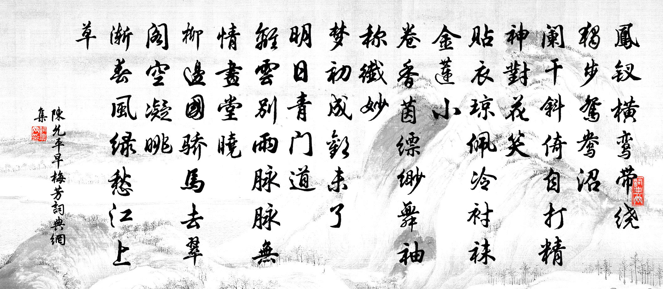 詩詞名句歷史字典書法欣賞書法字典國語詞典說文解字康熙字典古漢語字典標 題 作 者 詩 句 早梅芳/喜遷鶯作者:陳允平 朝代:宋代早梅芳/喜遷鶯原文鳳釵橫,鸞帶繞。獨步鴛鴦沼。闌乾斜倚,自打精神對花笑。貼衣瓊佩冷,襯襪金蓮小。卷香茵縹緲,舞袖稱纖妙。夢初成,歡未了。明日青門道。離雲別雨,脈脈無情畫堂曉。柳邊國驕馬去,翠閣空凝眺。漸春風、綠愁江上草。詩詞問答問:早梅芳/喜遷鶯的作者是誰?答:陳允平問:早梅芳/喜遷鶯寫於哪個朝代?答:宋代問:早梅芳/喜遷鶯是什麼體裁?答:詞陳允平早梅芳/喜遷鶯書法欣賞早梅芳/喜遷鶯書法作品詩詞推薦聯句書桂隱主人齋壁楊維楨〔元代〕九鳳山陽漂瀆陰,十年曾記此登臨。仙人一去橘破斗,小山重招花作金。勺水研池圓洗膽,老蕉書葉倒抽心。瞿曇次韻陳秀才二首陳造〔宋代〕吏治因循俗已疵,可無柱後濟寬慈。顧慚德化一何取,敢意古人三不欺。剔蠹方圖洗薰染,放麑端復惎衰遲。成君次韻八弟西園課經二首二晁補之〔宋代〕懶曠期陶謝,呼兒讀晉書。葛巾傾泛瀲,蠟屐上嶔嶇。回向空門舊,揩磨意地初。未堪朝市隱,且欲去衡廬。同諸子行上畈山戴表元〔宋代〕白石秋更潔,清溪寒自鳴。牛關爭道路,鳥雀聚柴荊。野果高低熟,山田早晚耕。吾歸任衰懶,兒輩托平生。家園臥疾畢太祝曜見尋①孟浩然〔唐代〕伏枕舊遊曠,笙歌勞夢思。②平生重交結,迨此令人疑。冰室無暖氣,炎雲空赫曦。③隙駒不暫駐,日聽涼禪悲。立冬節齋宿竹宮悼姚高士程公許〔宋代〕燕坐心源如止水,余工吟筆爛生花。誰知此老真三昧,孔老瞿曇共一家。別秀亭五首方回〔宋代〕醉翁亭記四時樂,我樂謂何寧不慚。滿地落花供妓席,隔江殘雪認僧庵。邦人解學推敲勢,野叟時同爾汝談。盜賊閨意蒲壽宬〔宋代〕聘得深村玉雪姿,力勝杵臼案齊眉。笑他老大專房寵,猶把房幃比舊時。鷓鴣天向子諲〔宋代〕說著分飛百種猜。泥人細數幾時回。風流可慣曾孤冷,懷抱如何得好開。垂玉箸,下香階。憑肩小語更兜鞋。再三西江月惠洪〔宋代〕大廈吞風吐月,小舟坐水眠空。霧窗春曉翠如蔥。睡起雲濤正涌。往事回頭笑處,此生彈指聲中。玉箋佳句敏驚鴻村居二首白居易〔唐代〕田園莽蒼經春早,籬落蕭條盡日風。若問經過談笑者,不過田舍白頭翁。門閉仍逢雪,廚寒未起煙。貧家重寥落,楚狂接輿歌先秦無名〔先秦〕鳳兮鳳兮何德之衰。往者不可諫。來者猶可追。已而已而。今之從政者殆而。余有三恨一無子二無助三無成抱北苦心娛以文俞文豹〔宋代〕天下奈何無可問,世皆如此有誰聽。為儂指點春知處,惟有垂揚眼獨青。頌古四十八首釋慧開〔宋代〕眼流星,機掣電。 * 刀,活人劍。宮詞王珪〔唐代〕昨日龍輿半寶文,宸毫金軸展鳳雲。前朝御印從頭拆,重整牙籤甲乙分。香山示孔處厚晃沖之〔宋代〕我來南經幾山過,馬行似沖山色破。風煙席捲岩穴開,澗花縈迴水流左。懸崖彷聞松聲下,瞰幽深鳥飛路墜。老夫次韻元禮春懷十首黃庭堅〔宋代〕穿花蹴踏千秋索,挑菜嬉遊二月晴。已被風光催我老,懶隨兒輩遶春城。昭州陶弼〔宋代〕峽束江盤天影隨,輕船雙下幾危機。初晴古木猿三叫,未晚陰崖日半規。篁竹數家何處縣,清溪一曲幾篇詩。木蓮樹生巴峽山谷間巴民亦呼為黃心樹白居易〔唐代〕大者高五丈涉冬不凋身如青楊有白文葉如桂厚大無脊花如蓮香色艷膩皆同獨房蕊有異四月初始開自開迨謝僅二十日相思引袁去華〔宋代〕皓齒清歌絕代音。眼波斜處寄情深。東風吹散,雲雨杳難尋。試手羅箋花樣在,唾窗茸線暗塵侵。向來多事,觸緒名句推薦日落沙明天倒開,波搖石動水縈迴李白《東魯門泛舟二首》 夫為將之道,必順天、因時、依人以立勝也。諸葛亮《將苑·卷一·智用》 君子無入而不自得焉。子思《中庸·第十四章》 上窗風動竹,月微明。呂渭老《小重山·七夕病中》 吾生如寄,尚想三徑菊花叢。楊炎正《水調歌頭·把酒對斜日》 花漸凋疏不耐風,畫簾垂地晚重工,墮階縈蘚舞愁紅孫光憲《浣溪沙·花漸凋疏不耐風》 巧匠目意中繩,然必先以規矩為度韓非及後人《韓非子·有度》 鳥銜野田草,誤入枯桑里。李白《樹中草》 未信此情難系絆,楊花猶有東風管。蘇軾《蝶戀花·蝶懶鶯慵春過半》 常恐秋節至,焜黃華葉衰。佚名《長歌行》