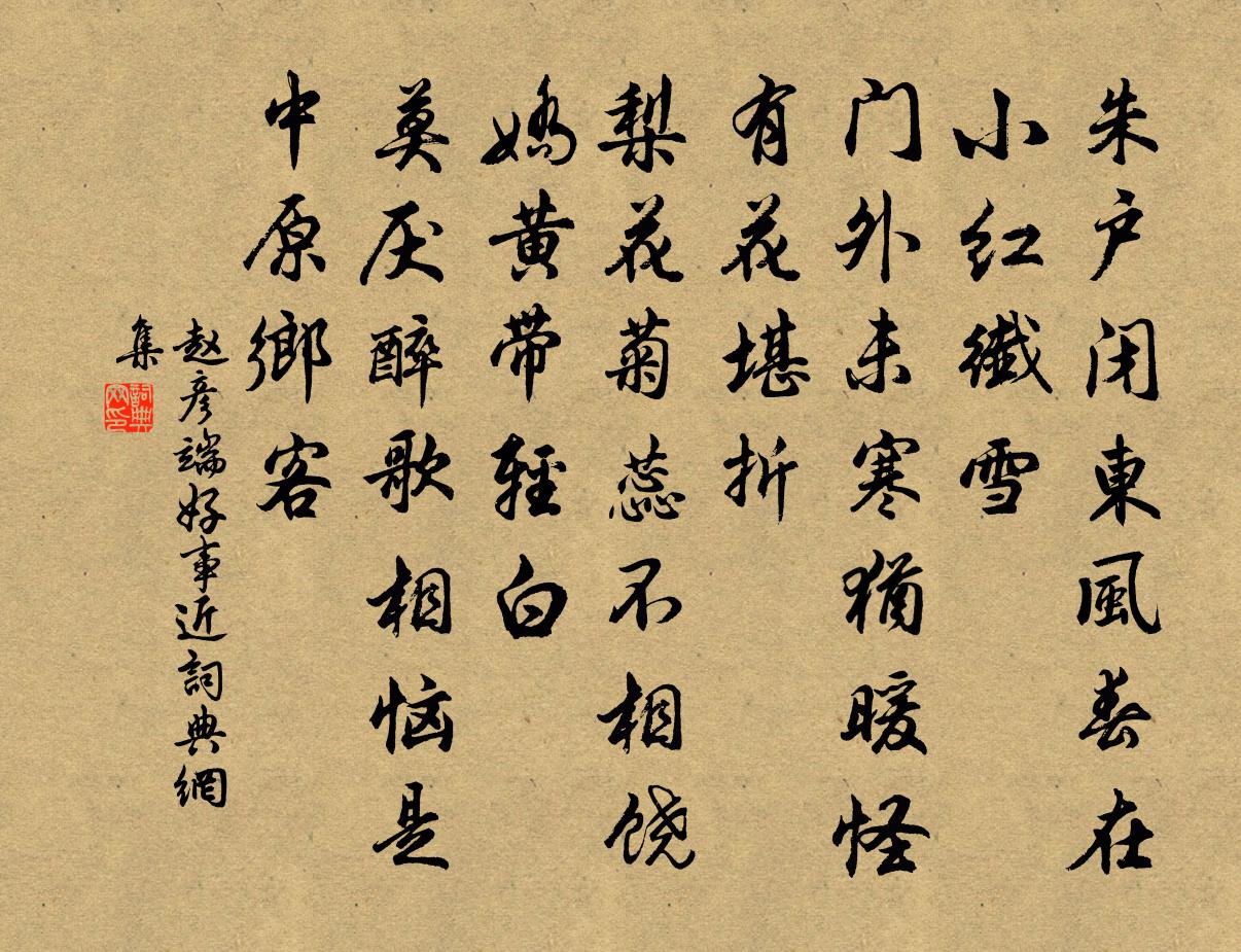 詩詞名句歷史字典書法欣賞書法字典國語詞典說文解字康熙字典古漢語字典標 題 作 者 詩 句 好事近作者:趙彥端 朝代:宋代好事近原文朱戶閉東風,春在小紅纖雪。門外未寒猶暖,怪有花堪折。梨花菊蕊不相饒,嬌黃帶輕白。莫厭醉歌相惱,是中原鄉客。詩詞問答問:好事近的作者是誰?答:趙彥端問:好事近寫於哪個朝代?答:宋代問:好事近是什麼體裁?答:詞趙彥端好事近書法欣賞好事近書法作品詩詞推薦題一家清雅集送植芸胡直內方回〔宋代〕累朝科第總名臣,四世能詩才二人。參透雄深兼雅健,鍛成俊逸更清新。馬班翁季羞前躅,王謝雲仍踵後塵。頗恨示僧釋慧遠〔宋代〕兩個童兒舁木鼓,左邊打了右邊舞。剎那變現百千般,分明示君君記取。瀟湘八景漁村夕照宋寧宗〔宋代〕林表墮金鴉,孤村三兩家。晴光明浦漵,紅影帶蒹葭。傍舍收魚網,隔溪橫釣槎。炊煙未篝火,新月一鉤斜。金雞五言十四韻歐陽修〔宋代〕蠻荊鮮人秀,厥美為物怪。禽鳥得之多,山雞稟其粹。眾彩爛成文,真色不可繪。仙衣霓紛披,女錦花綷縩。輝華贈淘金叟文同〔宋代〕濯石淋沙不自勞,抉光挑屑甚麼麽。世間有客能胠篋,比爾元來得校多。紅樓夢十二曲——留餘慶曹雪芹〔清代〕留餘慶,留餘慶,忽遇恩人;幸娘親,幸娘親,積得陰功。勸人生濟困扶窮,休以俺那愛銀錢忘骨肉的狠舅奸兄。病後小健戲題陸游〔宋代〕行年九十未龍鍾,慚愧天公久見容。醉解病人詩解廋,不如世世作春農。瑞鷓鴣王哲〔元代〕爭似休休事事忘。虛無境內覓清涼。若是會探潭底月,便教認得雪中霜。共我為鄰住洞房。憑作伴*心香。不日修禪人並化主寫真求贊釋正覺〔宋代〕其來何從,雲起孤峰。其去何詣,月落寒水。而今處處相隨處,的的渾身是眼睛。萬像森羅互為用,不許蠅泥黏鼻贈相士桂月岩趙必象〔宋代〕昔有道人張岩電,口不言錢似王衍。卻言姓錢不姓張,滑稽玩世名猶香。昔有岩電今月岩,月眼神舌和天談。江湖悼止齋王先生 其二王冕〔元代〕文採風流今已矣,夫何能見紫芝眉?中天氣黯星河慘,南國春寒草木悲。政事堂堂傳兩省,論談娓娓動諸司。老成次韻能之賀除徐僑〔宋代〕初無家學贍三餘,濫被君恩有此除。非取金華能占對,但令東觀與觀書。汗顏莫稱英髦選,冷眼終輸山澤居。自昔上新定宋使君貫休〔唐代〕禪坐吟行誰與同,杉松共在寂寥中。碧雲詩里終難到,白藕花經講始終。水疊山層擎草疏,砧清月苦立霜風。十年山園小梅得疏影橫斜水清淺暗香浮動月黃十四趙時韶〔宋代〕山前抹出連雲樹,窗外施來帶月枝。數點塞鴻相伴好,一聲羌笛不須吹。淳熙已酉二月二日皇帝登寶位鎡獲廁廷紳輒成張鎡〔宋代〕聖父移居太母傍,鑾輿躬待襲龍香。乍從黃繖窺天表,愈覺英資似壽皇。醉桃源·元日吳文英〔宋代〕五更櫪馬靜無聲。鄰雞猶怕驚。日華平曉弄春明。暮寒愁翳生。新歲夢,去年情。殘宵半酒醒。春風無定落梅輕。唐補闕清風亭薛嵎〔宋代〕去國遺忠藎,朝盤托諷深。因知潔已意,亦是愛君心。貌像意全古,子孫貧至今。清風如可繼,塊土已埋沉。題寶塔釋印肅〔宋代〕塔本無縫,真如不動。說此經處,湧出虛空。釋迦多寶,聽說如夢。東西無二,見見不同。無剎不收,無色不融。偈頌十二首釋原妙〔宋代〕封卻拄杖頭,結卻布袋口。禁在鐵圍山,枷上重增杻。有中拷出無,無中拷出有。痛楚百千般,不離者窠臼。子規來鵠〔唐代〕雨恨花愁同此冤,啼時聞處正春繁。千聲萬血誰哀爾,爭得如花笑不言。名句推薦造化鍾神秀,陰陽割昏曉。杜甫《望岳》 情之所鍾,雖醜不嫌。沈復《浮生六記·閨房記樂》 鴛鴦密語同傾蓋,且莫與、浣紗人說。張炎《疏影·詠荷葉》 兒童相見不相識,笑問客從何處來。賀知章《回鄉偶書二首·其一》 明日客程還幾許,沾衣況是新寒雨。納蘭性德《蝶戀花·又到綠楊曾折處》 慟哭六軍俱縞素,衝冠一怒為紅顏。吳偉業《圓圓曲》 南山截竹為觱篥,此樂本自龜茲出李頎《聽安萬善吹觱篥歌》 大丈夫當橫屍戰場,奈何狼藉都市。李大師、李延壽《南史·列傳·卷十九》 利出者實及,怨往者害來。列子及其弟子《列子·說符》 破帽遮顏過鬧市,漏船載酒泛中流。魯迅《自嘲》