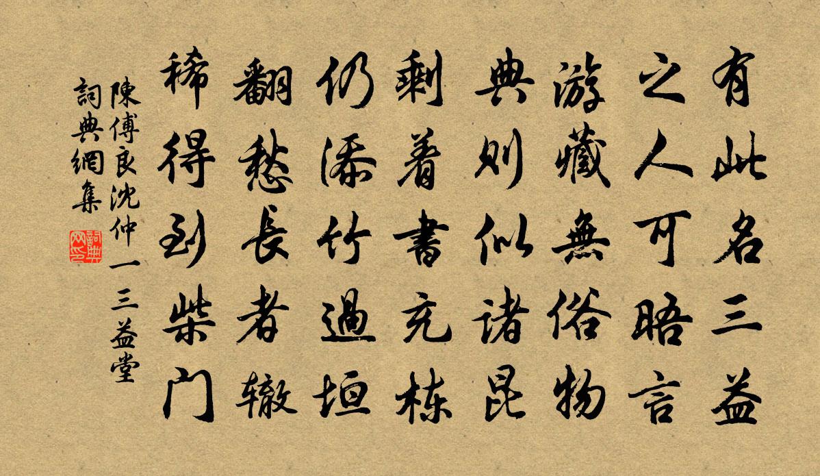 詩詞名句歷史字典書法欣賞書法字典國語詞典說文解字康熙字典古漢語字典標 題 作 者 詩 句 沈仲一三益堂作者:陳傅良 朝代:宋代沈仲一三益堂原文有此名三益,之人可晤言。游藏無俗物,典則似諸昆。剩著書充棟,仍添竹過垣。翻愁長者轍,稀得到柴門。詩詞問答問:沈仲一三益堂的作者是誰?答:陳傅良問:沈仲一三益堂寫於哪個朝代?答:宋代陳傅良沈仲一三益堂書法欣賞沈仲一三益堂書法作品詩詞推薦次韻高子勉十首黃庭堅〔宋代〕君不居郎省,還應上諫坡。才高殊未識,歲晚喜無它。櫪馬羸難出,鄰雞凍不歌。寒爐余幾火,灰里撥陰何。春去曲王建〔唐代〕春已去,花亦不知春去處。緣岡繞澗卻歸來,百回看著無花樹。就中一夜東風惡,收紅拾紫無遺落。老夫不比少年挽湯參議三首劉宰〔宋代〕婦黨名推重,鄉評我棄餘。共嗟身許拙,直與世緣疏。種竹沿修隴,栽花傍小渠。南園重回首,濃綠上畦蔬。度黃葉嶺懷寄清涼白雲庵賀鑄〔宋代〕黃葉嶺頭黃葉飛,白雲庵畔白雲歸。葉隨遊子終相失,雲伴禪翁得所依。會解腰間斬馬劍,肯尋江上釣魚磯。焚香贈術士邵易庵何夢桂〔宋代〕易道面皆萬變,面萬彙寄一面易。大道面降九流,至理散方術。譬猶八面窗,八方可從入。譬猶九達衢,九軌所由一字至七字詩(賦得詩)白居易〔唐代〕詩。綺美,瑰奇。明月夜,落花時。能助歡笑,亦傷別離。調清金石怨,吟苦鬼神悲。天下只應我愛,世間唯有君齊州送祖三王維〔唐代〕〔一作河上送趙仙舟,又作淇上別趙仙舟〕相逢方一笑。相送還成泣。祖帳已(一作悵忽)傷離。荒城復愁入。天題康侍郎所居二首林季仲〔宋代〕莫道水清偏得月,須知水濁亦全天。請看風定波平後,一顆靈珠依舊圓。中秋夜思鄭延美有作孫緯〔唐代〕中秋中夜月,世說懾妖精。顧兔雲初蔽,長蛇誰與勍。未追良友玩,安用玉輪盈。此意人誰喻,裁詩穿禁城。將之官留辭裴令公留守劉禹錫〔唐代〕祖帳臨伊水,前旌指渭河。風煙里數少,雲雨別情多。重疊受恩久,邅回如命何。東山與東閣,終異再經過。浪淘沙(贈妓)仲並〔宋代〕趁拍舞初筵。柳裊春煙。街頭桃李莫爭妍。家本鳳樓高處住,錦瑟華年。不用抹繁弦。歌韻天然。天教獨立百花前讀書皮日休〔唐代〕家資是何物,積帙列梁梠。高齋曉開卷,獨共聖人語。英賢雖異世,自古心相許。案頭見蠹魚,猶勝凡儔侶。【中呂】上小樓 客情景元啟〔元代〕欲黃昏梅梢月明,動離愁酒闌人靜。則被他檐鐵聲寒,翠被難溫,致令得倦客傷情。聽山城,又起更,角聲幽韻,雨花台張湯〔宋代〕不譚仁義只譚空,一著參差在箇中。台上繽紛花正雨,城邊一陣已西風。君王自有君王業,何事區區翻貝葉。雨花秋崖先生招飲荷葭塢席上賦詩吳龍翰〔宋代〕相公潭水清於玉,翠屏四面環書屋。石梯幽幽登蒼崖,老樹晴煙千頃綠。好花對人無俗姿,春色盈盈囿虛谷。歸來梅嶺有松無竹曾豐〔宋代〕與梅結友問為誰,松竹中含霜雪姿。竹豈寒盟已仙去,宿心惟有老松知。玉樓春(東堂小酌賦秋月)毛滂〔宋代〕庭下新生月,憑君把酒看。不須直待素團團。恰似那人眉樣、秀彎環。冷射鴛鴦瓦,清欺翡翠簾。數枝煙竹小橋寒鷓鴣天佚名〔宋代〕寶炬金蓮一萬條。火龍圍輦轉州橋。月迎仙仗回三殿,風遞韻音下九霄。登復道,聽鳴鞘。再頒酥酒賜臣僚。太平物外雜題陸游〔宋代〕飼驢留野店,買藥入山城。興盡飄然去,無人識姓名。寶祐二年皇子冠二十首佚名〔宋代〕冠醮之平,匪酬匪酌。於戶之西,敬其以恪。金石相宣,冠醮相錯。帝祉之受,施及家國。名句推薦聖人不積,既以為人,己愈有,既以與人,己愈多。天之道,利而不害;聖人之道,為而不爭。老子《老子·德經·第八十一章》 落木千山天遠大,澄江一道月分明。黃庭堅《登快閣》 無田似我猶欣舞,何況田間望歲心。曾幾《蘇秀道中》 處富貴之地,要知貧賤的痛癢;當少壯之時,須念衰老的辛酸。洪應明《菜根譚·概論》 渺萬裡層雲,千山暮雪,隻影向誰去?元好問《摸魚兒·雁丘詞 / 邁陂塘》 災人者,人必反 災之。莊子《莊子·內篇·人間世》 痛飲狂歌空度日,飛揚跋扈為誰雄。杜甫《贈李白》 田家幾日閒,耕種從此起。韋應物《觀田家》 文章合為時而著,歌詩合為事而作。白居易《與元九書》 嘆息老來交舊盡,睡來誰共午甌茶。陸游《幽居初夏》