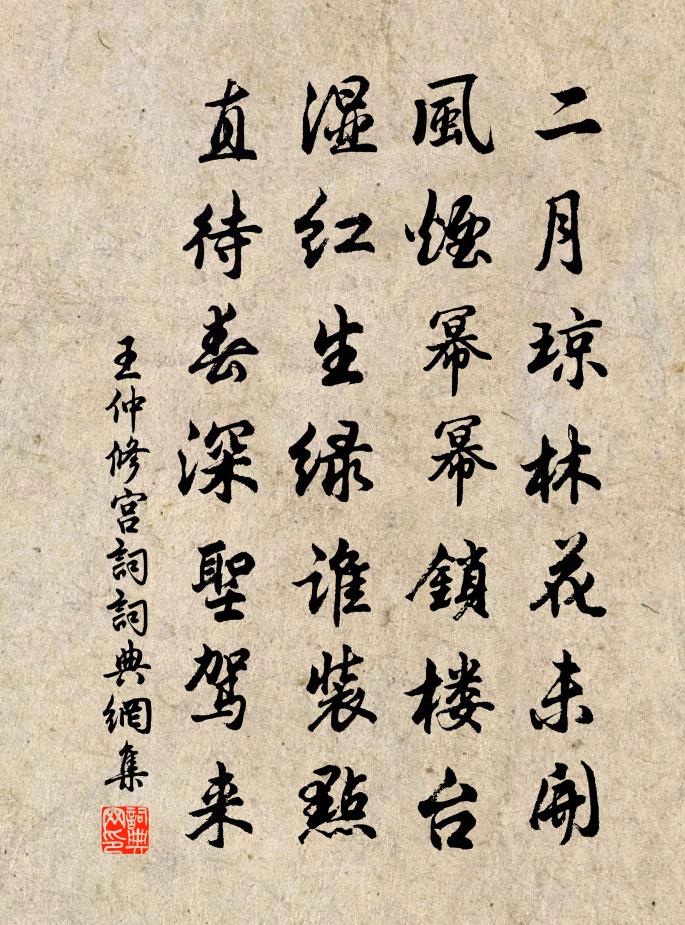 詩詞名句歷史字典書法欣賞書法字典國語詞典說文解字康熙字典古漢語字典標 題 作 者 詩 句 宮詞作者:王仲修 朝代:宋代宮詞原文二月瓊林花未開,風煙冪冪鎖樓台。濕紅生綠誰裝點,直待春深聖駕來。詩詞問答問:宮詞的作者是誰?答:王仲修問:宮詞寫於哪個朝代?答:宋代王仲修宮詞書法欣賞宮詞書法作品詩詞推薦秋夜讀書有感陸游〔宋代〕久病畏長夏,枕簟如炮焚。扶持賴藥物,俛仰秋已分。清夜炷爐香,裊裊起孤雲。靈府豁蒙滯,舊學資鉏耘。言念和早秋雨中書懷呈張鄧州黃庭堅〔宋代〕喜聞三徑被恩書,五馬來歌塞里閭。天上日清消螮蝀,海演風靜復爰居。龜逢銜骨方為鶻,蘭不當門亦見鋤。已發和延安龐龍圖寄岳陽滕同年范仲淹〔宋代〕優遊滕太守,郡枕洞庭邊。幾處雲藏寺,千家月在船。疏鴻秋浦外,長笛晚樓前。旋撥醅頭酒,新炮縮頂鯿。宦情贈張鍊師溫庭筠〔唐代〕丹溪藥盡變金骨,清洛月寒吹玉笙。他日隱居無訪處,碧桃花發水縱橫。次蒲尉韻李石〔宋代〕斯言誠虛筌,遮眼漫盈紙。冷暖當自知,此味如飲水。誰肯落驕榮,還來共枯悴。待渠轉船頭,著力與風值。最憐雙雁吟趙文〔宋代〕雲間有雙雁,弋者欲炙之。雁飛向南去,雖有矰{左矢右敫}將安施。山川悠遠霜苦,可憐宿食不得時。一雁中道蒙仲以二畫壽予生朝各題一詩劉克莊〔宋代〕□漢七葉主,勵精緻中興。非惟霸王雜,亦以刑名繩。哀哉三能臣,來如蛾赴燈。賢矣二大夫,逝若魚脫罾。韓蘚夏肯父為先都倉求水心墓誌未得歸社中諸友皆戴栩〔宋代〕文星金石筆,許爾有新銘。寬作春風約,歸看宰樹青。房留僧閉月,舟渡雁移汀。憑寄梅花酹,先賢必典型。偈八首釋慧遠〔宋代〕天道虧盈,地道變盈,鬼神害盈,人道惡盈。左傳引上國言佚名〔先秦〕不索何獲。壽春郡王閣春帖子夏竦〔宋代〕異表英奇非世出,惠心通敏盡生知。更當淑景承慈煦,永奉嘉祥茂本枝。句王祜〔宋代〕詩狂直欲吞雲霧,酒渴何妨吸洞庭。和元晦馬跡橋張栻〔宋代〕便請行從馬跡橋,何須乘鶴簉叢霄。殷勤底事登臨去,不為山僧苦見招。魏勝廟劉克莊〔宋代〕天與精忠不與時,堂堂心在路人悲。龍顏帝子方推轂,猿臂將軍忽死綏。灑泣我來瞻畫像,斷頭公恥立降旗。海州三月二十一日泛舟十絕劉克莊〔宋代〕退之歲晚南溪上,把釣聯詩得幾回。便與烏衣群從約,及身強健更頻來。雜詠一百首壺公劉克莊〔宋代〕跳入無人見,誰知有路通。長房非黠者,草草出壺中。喜雨呈二兄李洪〔宋代〕凍雨排銀竹,垂檐一萬條。新涼生枕簟,餘潤到枯焦。靜聽欣傾注,應心快洗澆。長河從此足,不用借鹹潮。鷓鴣天元好問〔金代〕憔悴鴛鴦不自由。鏡中鸞舞只堪愁。庭前花是同心樹,山下泉分兩玉流。金絡馬,木蘭舟。誰家紅袖水西樓。春風朱喬年風傅茂見訪劉子翬〔宋代〕眼食咍台時對床。山林情話政可樂,手談逼剝屢爭局,只恐雲路雙鵰翔。次韻子瞻與舒堯文禱雪霧豬泉唱和黃庭堅〔宋代〕老農年飢望人腹,想見四溟森雨足。林回投璧負嬰兒,豈聞烹兒翁不哭。未論萬戶無炊煙,蛛絲蝸涎經杼軸。使君名句推薦廢一善,則眾善衰。賞一惡,則眾惡歸。黃石公《三略·下略》 望極春愁,黯黯生天際。柳永《蝶戀花·佇倚危樓風細細》 二秋葉神媛,七夕望仙妃。任希古《和長孫秘監七夕》 昔別君未婚,兒女忽成行杜甫《贈衛八處士》 傷人一語,利如刀割。佚名《增廣賢文·上集》 先生醉也,童子扶者。曹德《三棒鼓聲頻·題淵明醉歸圖》 交淺而言深者,愚也;在賤而望貴者,惑也;未信而納忠者,謗也。范曄《後漢書·列傳·崔駰列傳》 紫泉宮殿鎖煙霞,欲取蕪城作帝家。李商隱《隋宮》 製法而自犯之,何以帥下?陳壽《三國志·魏書·武帝紀》 瀉水置平地,各自東西南北流。鮑照《擬行路難十八首》