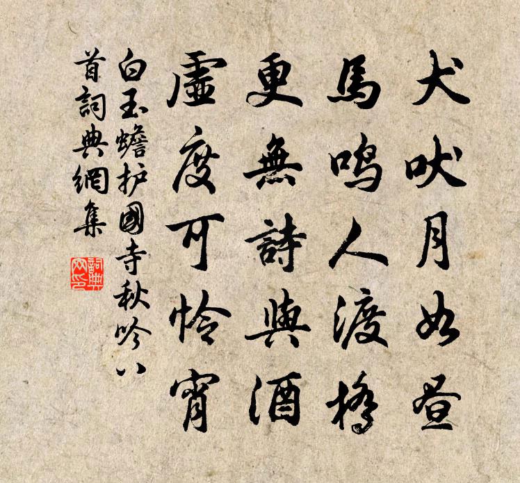 詩詞名句歷史字典書法欣賞書法字典國語詞典說文解字康熙字典古漢語字典標 題 作 者 詩 句 護國寺秋吟八首作者:白玉蟾 朝代:宋代護國寺秋吟八首原文犬吠月如晝,馬鳴人渡橋。更無詩與酒,虛度可憐宵。詩詞問答問:護國寺秋吟八首的作者是誰?答:白玉蟾問:護國寺秋吟八首寫於哪個朝代?答:宋代問:護國寺秋吟八首是什麼體裁?答:五絕白玉蟾護國寺秋吟八首書法欣賞護國寺秋吟八首書法作品詩詞推薦惜春傷同幕故人孟郎中兼呈去年看花友李益〔唐代〕畏老身今老,逢春解惜春。今年看花伴,已少去年人。思越人/朝天子賀鑄〔宋代〕怊悵離亭斷采襟。碧雲明月兩關心。幾行書尾情何限,一尺裙腰瘦不禁。遙夜半,曲房深。有時昵語話如今。侵窗舟行得風晚至靈洲楊萬里〔宋代〕春盡儂隨去,江行興未窮。時煩數點雨,輕灑一孤篷。岸樹蒼茫外,人家點綴中。海神能餞我,借與半帆風。貞婦詞楊維楨〔元代〕皎日常持信,倉皇不改貞。君王符不到,水長漸台傾。水調歌頭(癸未中秋,吉文共馬德昌泛江)劉辰翁〔宋代〕群動各已息,在汝夢中游。塵埃大地如水,兒女不堪愁。寂寂古人安在,冉冉吾年如此,何處有高樓。客有洞簫者次兒瀹以詩四首道各意因兩用其韻陳著〔宋代〕角利蠻與觸,幻世慈若巴。當知靠里業,自有書滿家。秋山文同〔宋代〕孤峰露蒼骨,疏木聳堅乾。高堂掛虛壁,爽氣來不斷。送范彥覃李處權〔宋代〕春風惱百物,物物不禁渠。水為盎盎綠,柳亦毿毿舒。芳菲遽如許,流光亦須臾。誰令更別離,此恨當何如。外門和蕭蔘議游嶽麓八絕王炎〔宋代〕泉繞雲根玉雪清,蒼珉百級可階升。汲泉煮茗松風起,誰識無塵有發僧。雷潭為定講師賦黃庚〔宋代〕縛草為庵枕碧漪, * 長是坐禪時。一聲霹靂驚龍起,布衲蒙頭總不知。居苦趙汝唫〔宋代〕去郭近一里,結茅才數間。紅塵飛不到,幽事頗相關。鑿石分流水,移松補斷山。棲禽忙似我,日落未知還。胡氏遲客亭觀詩宋祁〔宋代〕石磴松蹊自不塵,亭名遲客客回輪。山中桂好雖留隱,嶺上雲多肯寄人。夢草數殘康樂夜,禊杯閒記永和春。共游苦寒二首張煒〔宋代〕北風吹枯桑,汙窪如語汝。窗虛夜少寐,展轉莫寧處。衾裯冷如鐵,凜凜不可御。家居猶畏寒,何況遠行旅。寄吳國知舊齊己〔唐代〕淮甸當年憶旅遊,衲衣棕笠外何求。城中古巷尋詩客,橋上殘陽背酒樓。晴色水雲天合影,晚聲名利市爭頭。可憐二月十七日馬上鄭剛中〔宋代〕愁多發白惟知老,病起花飛不見春。我得此生真偶爾,休貪畫餅作痴人。雉丁謂〔宋代〕雉操揚琴奏,名翬拂扇塵。其文伊洛地,厥貢越裳人。幾為郎官集,還因今邑馴。山樑時飲啄,媒翳莫朝親。次韻高守無隱苦熱王之道〔宋代〕鬱蒸還起砲車雲,旱氣方隆雨未能。應念開幬來白鳥,故成灑酒聚青蠅。南皮痛飲君當繼,北牖高眠我獨醒。人仰七絕句羅公升〔宋代〕橐重驢鳴苦,村空鬼哭悲。黃華存大體,不肯問狐狸。靜樂軒喜成張諤〔唐代〕山縣為官不見山,一朝列嶂忽當關。抽身牒拆時舒眼,領客杖藜聊解顏。常樂本來由我靜,倦飛每爾愧知還。莫嫌書吳夢予古樂府後樓鑰〔宋代〕古來樂府近來無,筆力如君卻有餘。日恐遺音亡正始,喜聞新作過黃初。不夸藝苑徒工瑟,應免侯門久曳裾。更向名句推薦誰愛風流高格調,共憐時世儉梳妝。秦韜玉《貧女》 四面邊聲連角起,千嶂里,長煙落日孤城閉。范仲淹《漁家傲·秋思》 馬嘶經戰地,雕認打圍山。王鎡《塞上曲》 只知逐勝忽忘寒,小立春風夕照間。楊萬里《最愛東山晴後雪》 興盡晚回舟,誤入藕花深處。李清照《如夢令·常記溪亭日暮》 飢而欲食,寒而欲暖,勞而欲息,好利而惡害,是人之所生而有也。荀子《荀子·榮辱》 未成林,難望鳳來棲,聊醫俗。陸容《滿江紅·詠竹》 黃昏寒立更披襟,露浥清香悅道心。司空圖《白菊雜書四首》 此心隨去馬,迢遞過千峰。方乾《送從兄郜 / 韋郜 / 途中別孫璐》 澹月梨花,借夢來、花邊廊廡。史達祖《解佩令·人行花塢》