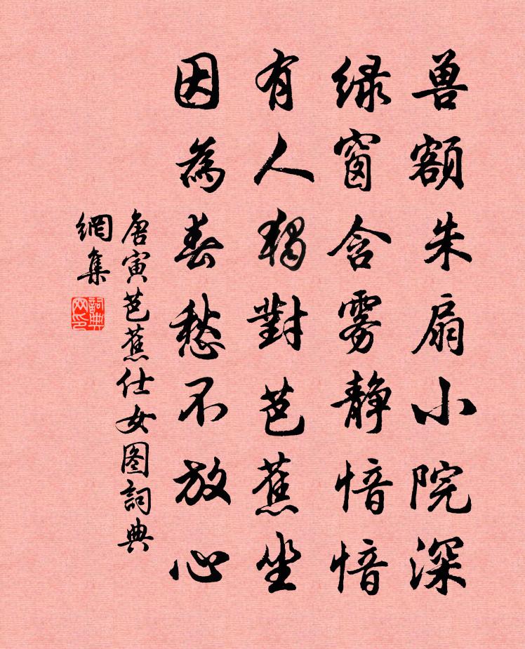 獸額朱扇小院深,綠窗含霧靜愔愔。有人獨對芭蕉坐,因為春愁不放心。