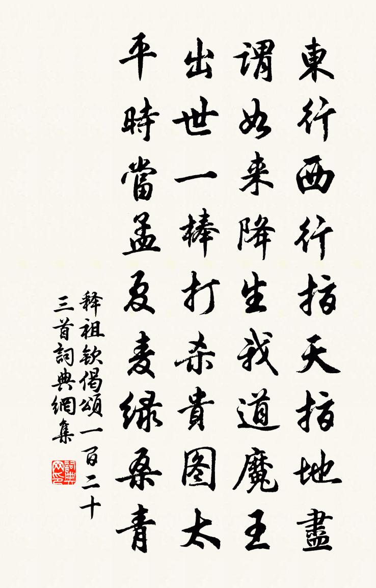 詩詞名句歷史字典書法欣賞書法字典國語詞典說文解字康熙字典古漢語字典標 題 作 者 詩 句 偈頌一百二十三首作者:釋祖欽 朝代:宋代偈頌一百二十三首原文東行西行,指天指地。盡謂如來降生,我道魔王出世。一棒打殺,貴圖太平。時當孟夏,麥綠桑青。詩詞問答問:偈頌一百二十三首的作者是誰?答:釋祖欽問:偈頌一百二十三首寫於哪個朝代?答:宋代釋祖欽偈頌一百二十三首書法欣賞偈頌一百二十三首書法作品詩詞推薦望江南楊無咎〔宋代〕鍾陵好,家世仰仙卿。衣帶不須藏貝葉,集賢何用化金瓶。且欲佐中興。期早晚,丹詔下天庭。不許南州猶弭節,三謠朱藤謠白居易〔唐代〕朱藤朱藤,溫如紅玉,直如朱繩。自我得爾以為杖,大有裨於股肱。前年左選,東南萬里。交遊別我於國門,親友病起初夏陸游〔宋代〕頭風間作已全輕,山雨雖頻卻快晴。窗外時時度花片,木梢處處送鶯聲。地偏無客談閒事,麥熟逢人樂太平。不為詠史上武帝陳普〔宋代〕二十嫖姚風火飛,鑾輿夜夜過焉支。茂陵不費凌雲氣,解見蟠桃著子時。呈趙常德四首趙蕃〔宋代〕朝廷不忘遠,徒欲得公重。不然如公賢,久合居侍從。少須歲和豐,歸騎承天寵。看取武陵原,田耕麥米壟。端禪人丐鹽求頌釋正覺〔宋代〕紅爐焰里結冰霜,收拾儂家妙有方,舌本要資雲水味,鼻端相助蕨薇香。掃歸茅舍閒堆雪,坐照金盤淨髮光。去去女冠子佚名〔宋代〕同雲密布。撒梨花、柳絮飛舞。樓台誚似玉。向紅爐暖閣院宇。深庭廣排筵會,聽笙歌猶未徹,漸覺輕寒,透簾穿春日三會閒行蘇欽〔宋代〕溪上橫崗一道斜,成行鴛鷺落平沙。竹籬茅舍林中見,仿佛孤山處士家。出遊歸隱釋文珦〔宋代〕出遊歸隱兩無心,非慕沃洲支道林。啗柏自然閒土銼,制荷曾不費金鍼。悠悠往中空塵夢,冉冉餘生任陸沉。頗謂哭?十五章辛棄疾〔宋代〕糊塗不成書,把筆意甚喜。舉頭見爺笑,持付三四紙。路岐重賦武元衡〔唐代〕芳郊欲別闌乾淚,故國難期聚散雲。分手更逢江驛暮,馬嘶猿叫不堪聞。馬嵬感事唐求〔唐代〕冷氣生深殿,狼星渡遠關。九城鼙鼓內,千騎道途間。鳳髻隨秋草,鸞輿入暮山。恨多留不得,悲淚滿龍顏。虞美人王灼〔宋代〕姚黃真是花中主。個個尋芳去。春光能有幾多時。莫遣無花空折、斷腸枝。蜂媒蝶使爭撩亂。應妒傳觴緩。問花端姚江舟中夢故人勸歸釋文珦〔宋代〕一舸寒江上,蕭蕭兩鬢華。不唯傷道路,終恐委泥沙。宿雨添山靄,秋風起浪花。故人應念我,夢裡勸還家。句蔡肇〔宋代〕斷蓬帆影天平入,夾鏡波光水到流。西江月何夢桂〔宋代〕猶記春風庭院,柳陰深鎖簾帷。東君去後雨絲絲。空認紫騮嘶處。夢斷簫台無據,十年往事休追。忽然拈起舊來書依韻奉和司徒侍中同賞梨花強至〔宋代〕千株綴雪紺園中,數頃花開幾度逢。體瑩直憂春欲妒,色孤猶喜月相容。香浮翠蓋台光近,瓣落清樽飲興濃。公恰南歌子(四之一)鄧肅〔宋代〕竹影窺燈暗,泉聲語夜長。小窗無夢到高唐。獨引三杯長嘯、步修廊。月午衣衫冷,蓮開風露香。闌乾西角下銀潢即事章甫〔宋代〕初失清河日,駸駸遂逼人。餘生偷歲月,無處避風塵。精銳看諸將,謀謨仰大臣。愞夫憂國淚,欲忍已沾巾。夜坐陸游〔宋代〕白首仍多病,青燈獨掩扉。雲低聞雁過,雨急待兒歸。名句推薦奸不容細,私告任坐使然也。韓非及後人《韓非子·制分》 欲窮千里目,更上一層樓。王之渙《登鸛雀樓》 才過清明,漸覺傷春暮。李冠《蝶戀花·春暮》 長風連日作大浪,不能廢人運酒舫。元結《石魚湖上醉歌》 樓殿無人春畫長。燕子歸來依舊忙。謝克家《憶君王·依依宮柳拂宮牆》 未收天子河湟地,不擬回頭望故鄉。令狐楚《少年行四首·其三》 強中自有強中手,用詐還逢識詐人。羅貫中《三國演義·第十七回》 桑之未落,其葉沃若。佚名《氓》 知音少,弦斷有誰聽。岳飛《小重山·昨夜寒蛩不住鳴》 疑行無名,疑事無功。司馬遷《史記·七十列傳·商君列傳》