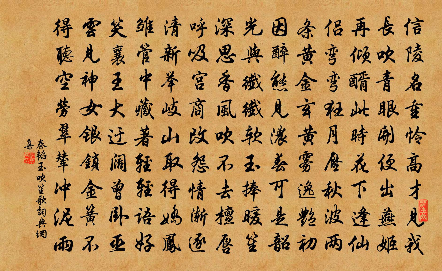 詩詞名句歷史字典書法欣賞書法字典國語詞典說文解字康熙字典古漢語字典標 題 作 者 詩 句 吹笙歌作者:秦韜玉 朝代:唐代吹笙歌原文信陵名重憐高才,見我長吹青眼開。便出燕姬再傾醑,此時花下逢仙侶。彎彎狂月壓秋波,兩條黃金玄黃霧。逸艷初因醉態見,濃春可是韶光與。纖纖軟玉捧暖笙,深思香風吹不去。檀唇呼吸宮商改,怨情漸逐清新舉。岐山取得嬌鳳雛,管中藏著輕輕語。好笑襄王大迂闊,曾臥巫雲見神女。銀鎖金簧不得聽,空勞翠輦沖泥雨。詩詞問答問:吹笙歌的作者是誰?答:秦韜玉問:吹笙歌寫於哪個朝代?答:唐代問:吹笙歌是什麼體裁?答:樂府秦韜玉吹笙歌書法欣賞吹笙歌書法作品注釋全唐詩:卷670-35詩詞推薦八陣磧蘇軾〔宋代〕平沙何茫茫,仿佛見石蕝。縱橫滿江上,歲歲沙水齧。孔明死已久,誰復辨行列。神兵非學到,自古不留訣。至人卿雲歌先秦無名〔先秦〕卿雲爛兮。乣縵縵兮。明明天上。爛然星陳。日月光華。旦復旦兮。日月有常。星辰有行。四時從經。萬姓允誠。西亭暇日書懷十二韻獻上相公(亭為衡鎮蜀時構)李夷簡〔唐代〕勝賞不在遠,憮然念玄搜。茲亭有殊致,經始富人侯。澄澹分沼沚,縈迴間林丘。荷香奪芳麝,石溜當鳴球。撫俗守歲五首薛嵎〔宋代〕明日焚香叩九關,六旬修未到清閒。莫憐身在塵中老,雪後騎驢亦看山。依韻酬趙令之李復〔宋代〕相逢三十載,少恥事驍雄。封植思嘉枝,交遊嘆谷風。雲山輪跡少,葵藿歲時充。冉冉秋還暮,霜寒泣候蟲。楊漢公輓詞二首陳長方〔宋代〕一日官聯舊,千秋事契存。窆棺蕭寺側,築屋白雲根。綿力慚無助,丹心徒重論。淒涼楚些韻,誰解與招魂。頌古十首釋普岩〔宋代〕月淡江空泛小舟,唱歌和月看江流。更深欹枕夢何處,兩峰清霜曉未收。春詞毛滂〔宋代〕柏酒勤稱壽,椒塗蚤卻寒。靜無遊樂事,殊闊濯龍歡。和於湖集茶韻三首舒邦佐〔宋代〕氣味相投陳與雷,有時煎點兩三回。午窗睡著呼湯急,止渴還應似望梅。菩薩蠻·金陵賞心亭為葉丞相賦辛棄疾〔宋代〕青山欲共高人語。聯翩萬馬來無數。煙雨卻低回。望來終不來。 人言頭上發。總向愁中白。拍手笑沙鷗。一身都用前韻答西掖諸公見和蘇軾〔宋代〕雙猊蟠礎龍纏棟,金井轆轤鳴曉瓮。小殿垂簾白玉鉤,大宛立仗青絲鞚。風馭賓天雲雨隔,孤臣忍淚肝腸痛。羨君謁金門譚宣子〔宋代〕銀漏滴。午夜平康巷陌。雙掩獸環人語寂。餘香無處覓。回首舊遊蹤跡。紺碧染衣猶濕。一餉沉吟誰會得。月明春偈頌十七首釋師範〔宋代〕舊歲即新歲,新年即舊年。要知新歲歲,元是舊年年。初夏陸游〔宋代〕淡靄輕颸入夏初,一窗新綠鳥相呼。出門易倦常歸臥,著句難工但自娛。花徑蝶閒無墮蕊,酒樓人散有空壚。閩川正蒙主文教授大著寵示佳章輒繼嚴韻仰酬盛意度正〔宋代〕眼空未可嘆賢無,瓦礫中間有寶珠。多謝三峨孕清淑,安排貢籍貢鴻儒。吳江別王長史張懷〔唐代〕多年襆被玉山岑,鬢雪欺人忽滿簪。駑馬雖然貪短豆,野麋終是憶長林。鱸魚未得乘歸興,鷗鳥惟應信此心。見說和梅摯北池十詠蔣堂〔宋代〕池上有虛閣,翬檐迅若翔。百壺多盛集,四座仰惟良。蘚印文綦綠,蓮依桂楫香。何由陪嘯詠,敷袵納微涼。南林寺樂雷發〔宋代〕律院僧應俗,亭荒草木刪。無碑堪考古,有客自看山。竹好惟嫌密,雲多不自閒。小溪知最近,童浴夜方不。感事晁說之〔宋代〕長鯨江海尚翻波,欲濟無航可柰何。物象蕭條秋序薄,人生感慨腐儒多。翠輿不見胡塵起,旅雁能隨漢月過。七日贈章仇將軍孟郊〔唐代〕將軍不夸劍,才氣為英雄。五嶽拽力內,百川傾意中。本立誰敢拔,飛文自難窮。前時天地翻,已有扶正功。名句推薦城小賊不屠,人貧傷可憐元結《賊退示官吏》 能行之者未必能言,能言之者未必能行。司馬遷《史記·孫子吳起列傳》 楊柳千條送馬蹄,北來征雁舊南飛。納蘭性德《浣溪沙·楊柳千條送馬蹄》 春去秋來也,愁心似醉醺。歐陽炯《巫山一段雲·春去秋來也》 棄捐勿復道,努力加餐飯。佚名《行行重行行》 雲淡風高葉亂飛,小庭寒雨綠苔微,深閨人靜掩屏帷。顧敻《浣溪沙·雲淡風高葉亂飛》 兵可千日而不用,不可 一日而不備。李大師、李延壽《南史·列傳·卷六十一》 入我相思門,知我相思苦,李白《三五七言 / 秋風詞》 不知何處吹蘆管,一夜征人盡望鄉。李益《夜上受降城聞笛》 魯酒不可醉,齊歌空復情。李白《沙丘城下寄杜甫》
