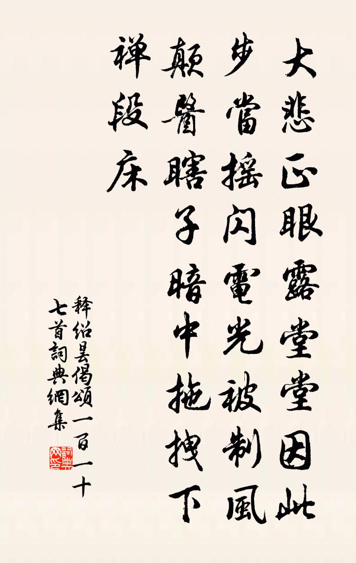 詩詞名句歷史字典書法欣賞書法字典國語詞典說文解字康熙字典古漢語字典標 題 作 者 詩 句 偈頌一百一十七首作者:釋紹曇 朝代:宋代偈頌一百一十七首原文大悲正眼露堂堂,因此步當搖閃電光。被制風顛醫瞎子,暗中拖拽下禪段床。詩詞問答問:偈頌一百一十七首的作者是誰?答:釋紹曇問:偈頌一百一十七首寫於哪個朝代?答:宋代釋紹曇偈頌一百一十七首書法欣賞偈頌一百一十七首書法作品詩詞推薦酬堅大師陶夢桂〔宋代〕蜀山越嶠倦躋攀,拄杖經年掛壁間。駒隙光中驚迅速,龍泉山時占清閒。但存寶藏明珠在,不管石頭行路難。香冷戊申元日立春題道山堂前梅花楊萬里〔宋代〕今年元日不孤來,帶領新春一併回。夜雨初添石渠水,東風先入道山梅。不妨數朵且微破,未要十分都盡開。江路工部弟哀詩二首劉克莊〔宋代〕去歲書來欲解麾,數行遺墨半傾欹。斑衣不遂娛親志,白髮因吟哭子詩。讓棗猶如前日事,摘瓜空抱暮年悲。情知題楊子岩丘葵〔宋代〕抗塵走俗令人憎,因覓桃源作此行。畏日燒空時事惡,飛泉瀉石道心生。青天盡處孤舟渺,好鳥鳴時萬壑清。一老天津橋南山中各題一句李益〔唐代〕野坐分苔席, 舟過楊子橋遠望楊萬里〔宋代〕此日淮堧號北邊,舊時南服紀淮堧。平蕪盡處渾無壁,遠樹梢頭便是天。今古戰場誰勝負,華夷險要豈山川。六朝再和前韻答隱父二首郭印〔宋代〕吾宗枝幹衰,弱植念孤獨。結交得此君,蒹葭倚瓊玉。即之不忍去,爽氣如可掬。初觀愛柯莖,久坐窮節目。細葉白薴歌戴復古〔宋代〕雪為緯,玉為經。一織三滌手,織成一片冰。清如夷齊,可以為衣。陟彼西山,於以採薇。陪趙知府登桃嶺山亭釋紹嵩〔宋代〕誰向雲端著此亭,檐前樹木映窗欞。野田流水濺濺白,芳草隨人段段青。春服照塵連草色,雲蘿幽信寄茶經。史君和元汝功晚涼城上郭印〔宋代〕潛鱗思縱壑,倦羽欲歸林。平生山水興,過眼必登臨。況復西風來,天雲布層陰。殘暑退十舍,新涼直萬金。寒光鷓鴣天黃庭堅〔宋代〕 * 枝頭生曉寒,人生莫放酒杯乾。風前橫笛斜吹雨,醉里簪花倒著冠。身健在,且加餐。舞裙歌板盡清歡。黃花頌古五十五首釋紹曇〔宋代〕平白將身入草窠,折娘生臂凍驢腰。一年一度嵩山雪,雪有消歸恨不消。天禧初僑寓安陸有宅一區嘗於齋前手植橘樹才宋庠〔宋代〕昔年封櫱栽,生意頗柔脆。今茲見丹實,落落如星麗。斯果號難成,常踰豫章歲。孤根何為者,尚記吾廬地。蔽芾對月宋祁〔宋代〕林梢霞尾暗,海面月華新。一水開天鑒,千金上佛輪。幽岩涵靜桂,潛蚌溢涼津。不必姑山去,翛然自玉人。景山寺古鼎袁說友〔宋代〕小憩山前路,清談得道僧。愛渠惟一鼎,持此共三乘。製作前無古,摩挲喜不勝。茲游真可樂,著句憶弄曾。送昭禮還金陵四首趙蕃〔宋代〕松巒特立士,君也為之子。異同誚歆向,父子自知己。向來知名人,得此多失彼。願君考其然,九十半百里。句黃卓〔宋代〕延平商閣瞰雙溪,神劍光芒沖斗極。友人婚楊氏催妝賈島〔唐代〕不知今夕是何夕,催促陽台近鏡台。誰道芙蓉水中種,青銅鏡里一枝開。夏日田園雜興范成大〔宋代〕小婦連宵上絹機,大耆催稅急於飛。今年幸甚蠶桑熟,留得黃絲織夏衣。送孫仲舉徽猷罷郡造朝謝伋〔宋代〕四月維夏天未暑,天台居民逃室處。城中屢貴巷陌喧,城外號奴去村墅。老癃扶杖少者趨,夫棄禾麻婦投杼。肩隨名句推薦君知妾有夫,贈妾雙明珠。張籍《節婦吟·寄東平李司空師道》 草色全經細雨濕,花枝欲動春風寒。王維《酌酒與裴迪》 山中一夜雨,樹杪百重泉。王維《送梓州李使君》 芄蘭之葉,童子佩韘。佚名《芄蘭》 細草微風岸,危檣獨夜舟。杜甫《旅夜書懷》 天與水違行,訟;君子以作事謀始。佚名《易傳·象傳上·訟》 意輕千金贈,顧向平原笑。李白《古風·齊有倜儻生》 生民之本,要當稼稽而食,桑麻以衣。顏之推《顏氏家訓·治家篇》 至誠而不動者,未之有也;不誠,未有能動者也。孟子《孟子·離婁章句上·第十二節》 紅樓隔雨相望冷,珠箔飄燈獨自歸。李商隱《春雨》