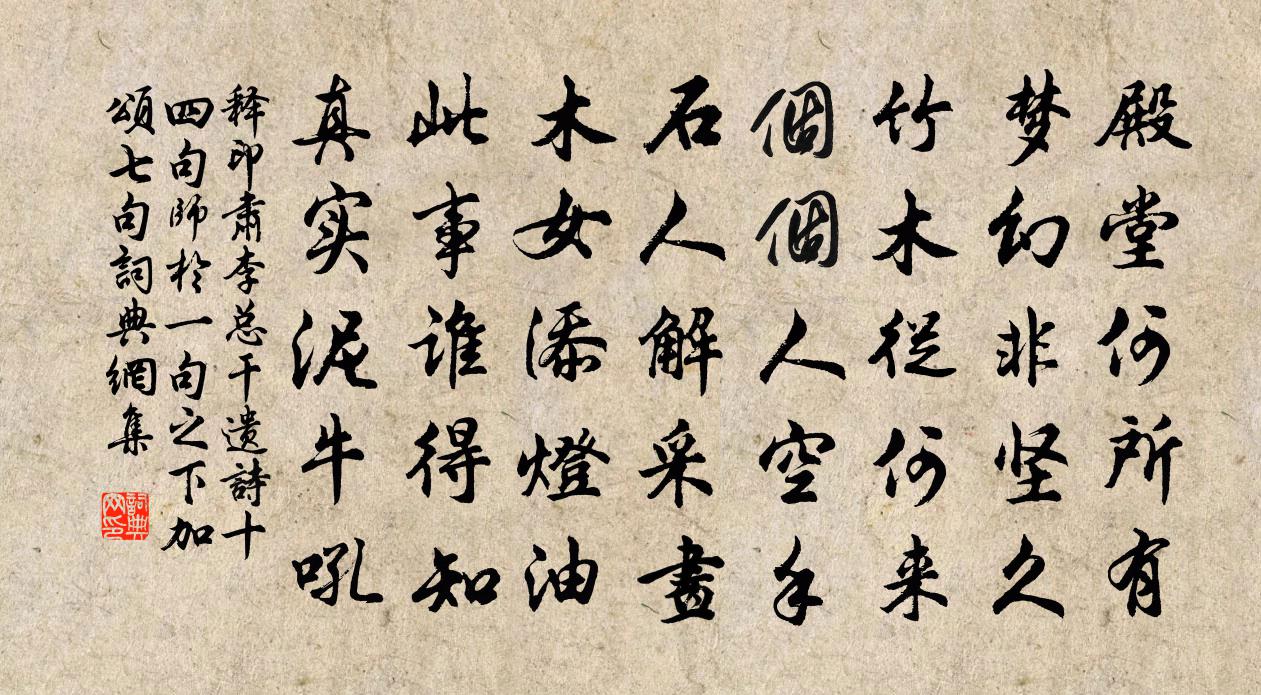 詩詞名句歷史字典書法欣賞書法字典國語詞典說文解字康熙字典古漢語字典標 題 作 者 詩 句 李總乾遺詩十四句師於一句之下加頌七句作者:釋印肅 朝代:宋代原文殿堂何所有,夢幻非堅久。竹木從何來,個個人空手。石人解采畫,木女添燈油。此事誰得知,真實泥牛吼。詩詞問答問:《李總乾遺詩十四句師於一句之下加頌七句》的作者是誰?答:釋印肅問:該詩寫於哪個朝代?答:宋代書法欣賞李總乾遺詩十四句師於一句之下加頌七句書法作品詩詞推薦漁父四時曲春趙汝鐩〔宋代〕霽江浮春新水肥,粼粼鴨綠東風微。波心上下舴艋滑,釣車香餌卷落暉。纖鱗噞喁錦穿柳,半留賣錢半換酒。爛醉文王廟范成大〔宋代〕堂堂十亂欲興周,肯使君王死作囚。巧笑入宮天亦笑,可憐元不費深謀。光相寺汪元量〔宋代〕峨眉花縣西四十花里,峭壁懸崖削寒翠。崎嶇棧道動搖搖,矮石花同贔屭。忽窺萬仞黑無底,下有龍淵七十二。攀萍宋自遜〔宋代〕苦無根蒂逐波流,風約才稀雨復稠。舊說楊花能變此,是他種子亦輕浮。陰山道-疾貪虜也白居易〔唐代〕陰山道,陰山道,紇邏敦肥水泉好。每至戎人送馬時,道旁千里無纖草。草盡泉枯馬病羸,飛龍但印骨與皮。五十踏莎行佚名〔宋代〕玉母池邊,曾記舊識。玉京仙苑新移得。素娥青女好精神,比看終是無顏色。傳入漢宮,偷擬妝飾。壽陽空恁勞心答柴主簿二首林景熙〔宋代〕間采秋荷自製衣,相逢舊雨語依依。學窮科斗心空老,夢跨蟾蜍肉不飛。幾喚江帆和雁渡,長歌岩戶見雲歸。何須宜陽所居白蜀葵答詠柬諸公武元衡〔唐代〕冉冉眾芳歇,亭亭虛室前。敷榮時已背,幽賞地宜偏。紅艷世方重,素華徒可憐。何當君子願,知不競喧妍。和李使君三郎早秋城北亭樓宴崔司士…關中弟張評事時遇盧綸〔唐代〕黃花古城路,上盡見青山。桑柘晴川口,牛羊落照間。野情隨卷幔,軍士隔重關。道合偏多賞,官微獨不閒。鶴分述懷真山民〔宋代〕不敢尤人敢怨天,愁來覓酒醉來眠。五窮有鬼遍相虐,九轉無丹別自全。游食懼違新下令,力耕苦乏舊存田。靈台和子由論書蘇軾〔宋代〕吾雖不善書,曉書莫如我。苟能通其意,常謂不學可。貌妍容有顰,璧美何妨橢。端莊雜流麗,剛健含婀娜。好之同表甥趙康游種范李氏晁說之〔宋代〕百態范氏石,千尋種氏木。灌以邠李水,禽鳥識故國。使我從今去,魂夢常不足。浣溪沙趙可〔元代〕火冷熏爐香漸消。更闌撥火更重燒。愁心心字兩俱焦。半世清狂無限事,一窗風月可憐宵。燈殘花落夢無聊。贈東方道士徐夤〔唐代〕葫蘆窗畔掛,是物在其間。雪色老人鬢,桃花童子顏。祭星秋卜日,採藥曉登山。舊放長生鹿,時銜瑞草還。自武義入松陽道中三首項安世〔宋代〕黃霧漫天作曉霜,征人相顧失顏行。雖然未快還鄉眼,腳底沙泥已是鄉。東堂獨坐懷琳老二首毛滂〔宋代〕聞道年來多掩關,高情定滿渺瀰間。秋風不怕清難忍,曉日應分暖伴閒。欲喚扁舟弄雲水,已疑小閣厭溪山。東堂贈范茂直鄭剛中〔宋代〕范君才力信超群,與我暌離未十春。脫體文章都換骨,從頭宦業便通神。不應蓮幕淹餘刃,莫只花磚臣此身。好傍憶黃州梅花五絕蘇軾〔宋代〕玉琢青枝蕊綴金,仙肌不怕苦寒侵。淮陽城裡娟娟月,樊口江邊耿耿參。山行行歌十首周文璞〔宋代〕天風穩送步虛聲,雜和漫山檜柏鳴。遠望山腰多白石,細看知是野人行。答友人勸酒吟邵雍〔宋代〕人人誰不願封侯,及至封侯未肯休。大得卻須防大失,多憂元只為多求。規模焉敢比才士,度量自知非飲流。少日名句推薦鎮日無心掃黛眉。臨行愁見理征衣。夏竦《鷓鴣天·鎮日無心掃黛眉》 神女生涯原是夢,小姑居處本無郎。李商隱《無題·重幃深下莫愁堂》 驛寄梅花,魚傳尺素。秦觀《踏莎行·郴州旅舍》 多少天涯未歸客,盡借籬落看秋風。唐寅《菊花》 寒氣先侵玉女扉,清光旋透省郎闈。李商隱《對雪二首》 我有所念人,隔在遠遠鄉。白居易《夜雨》 唯仁者能好人,能惡人。孔子弟子《論語·雍也篇》 寧戀本鄉一捻土,莫愛他鄉萬兩金。吳承恩《西遊記·第十二回》 來說是非者,便是是非人。佚名《增廣賢文·上集》 唯天下至誠,為能盡其性;能盡其性,則能盡人之性。子思《中庸·第二十二章》